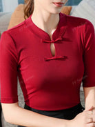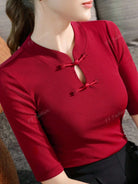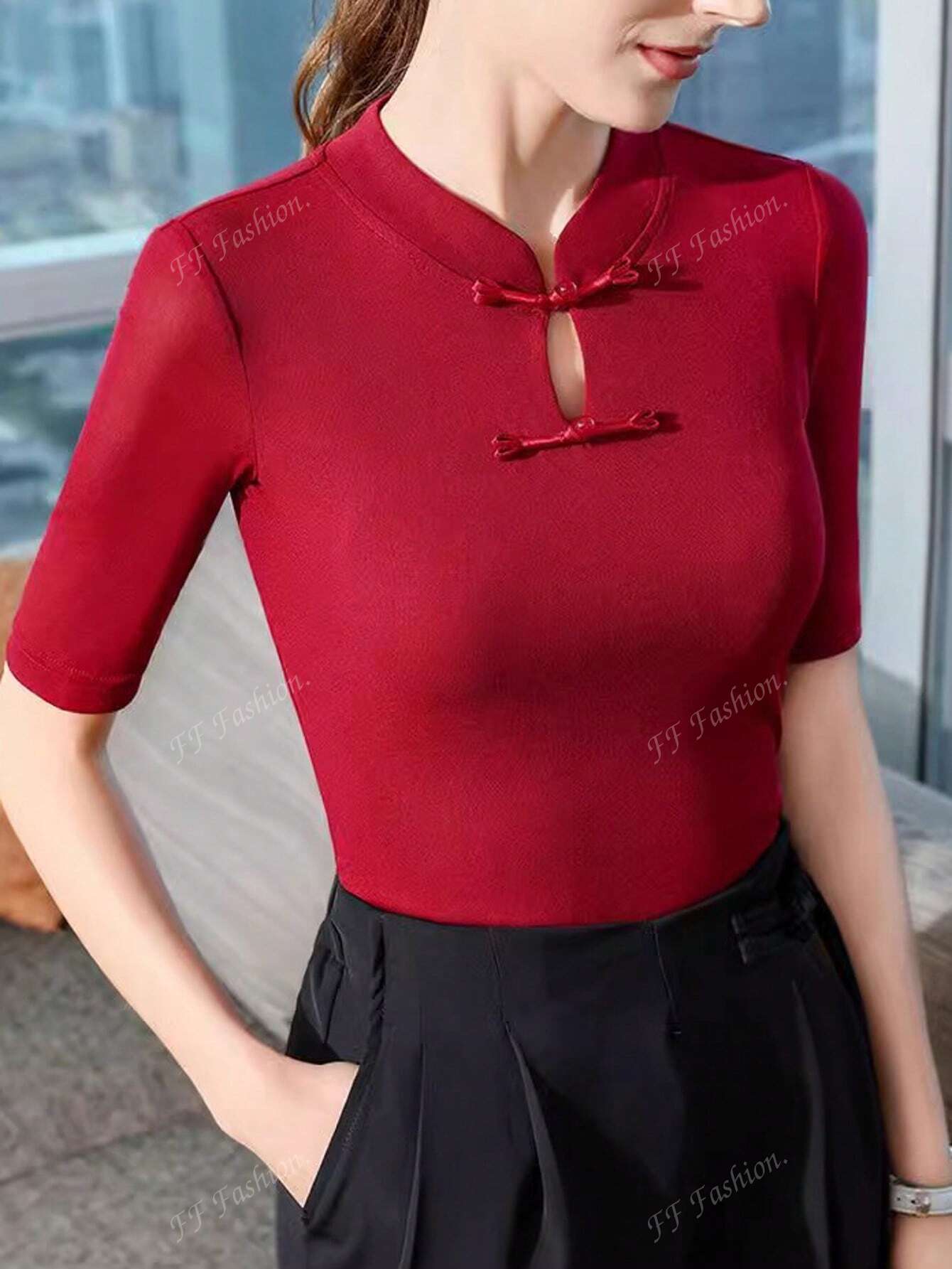 بلوزة نسائية جديدة بأزرار على الطراز الصيني لعام 2025 بتصميم أنيق على طراز الرياح الصينية، برقبة على شكل حرف V وأكمام قصيرة