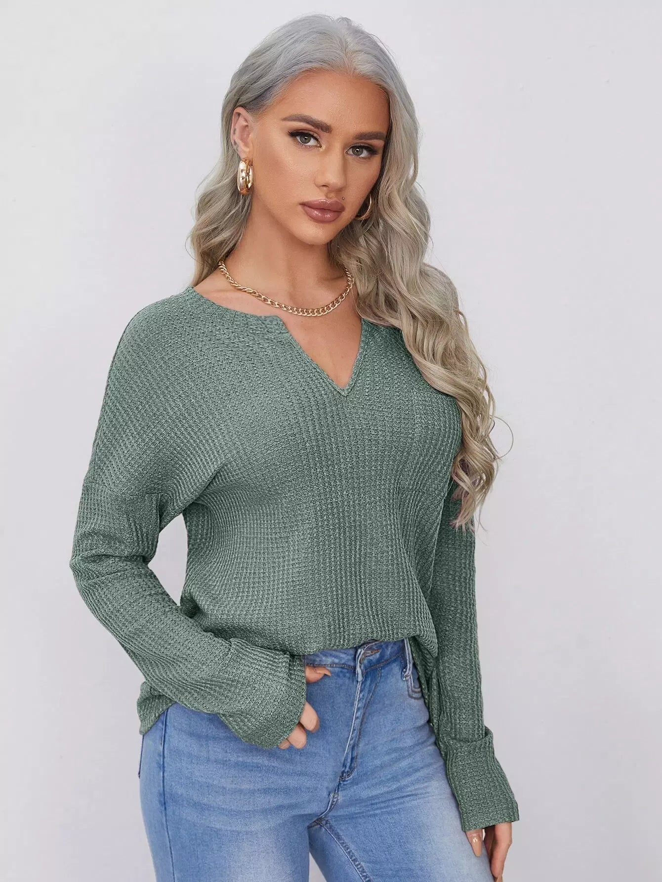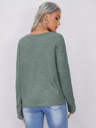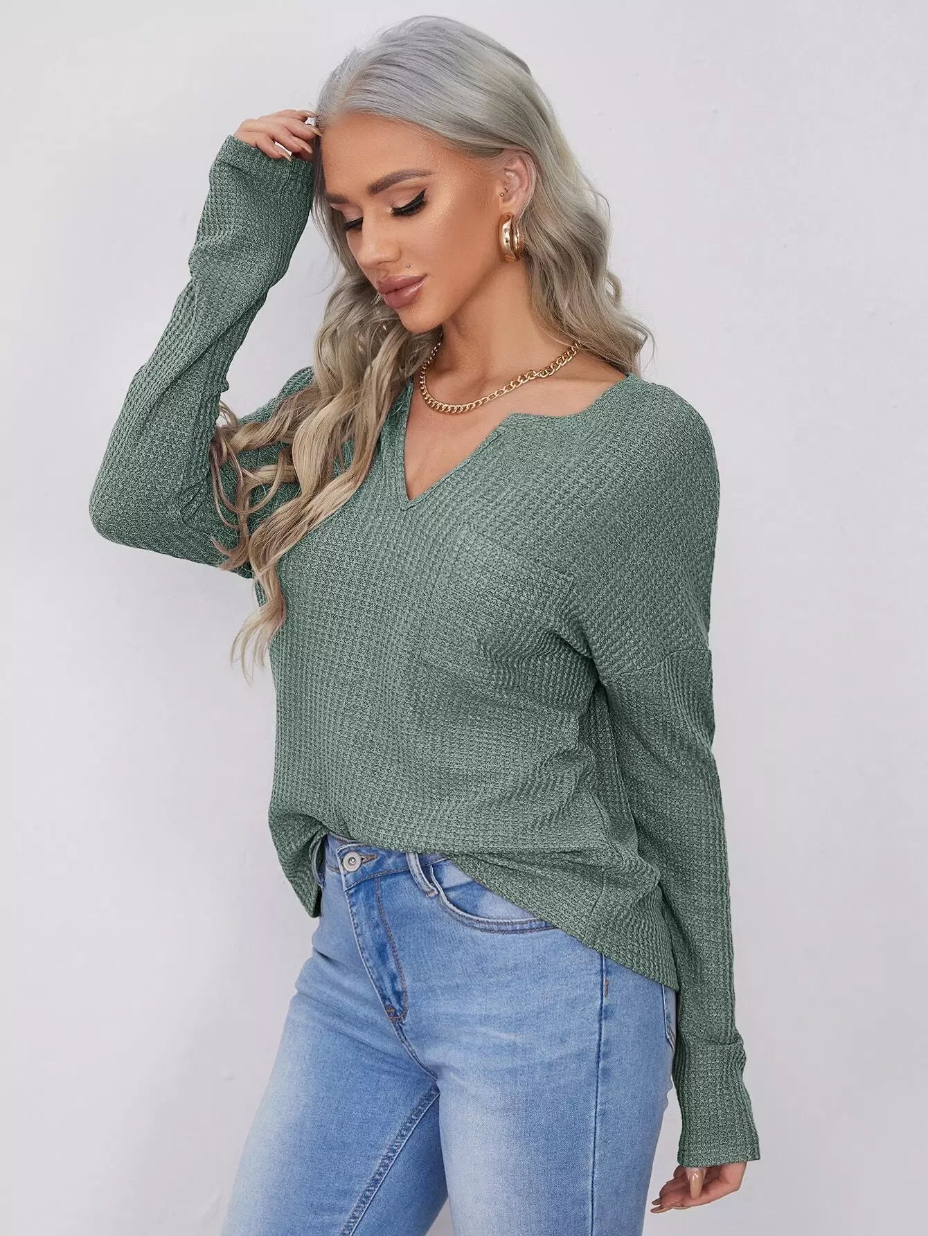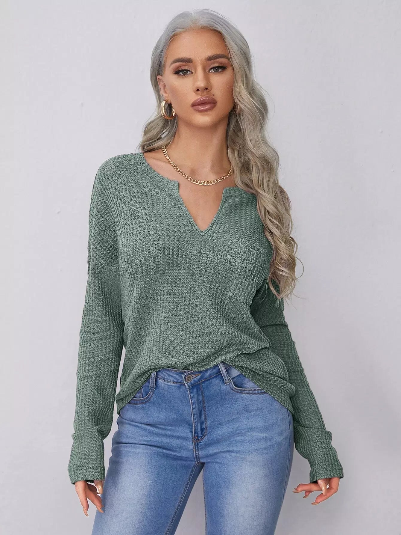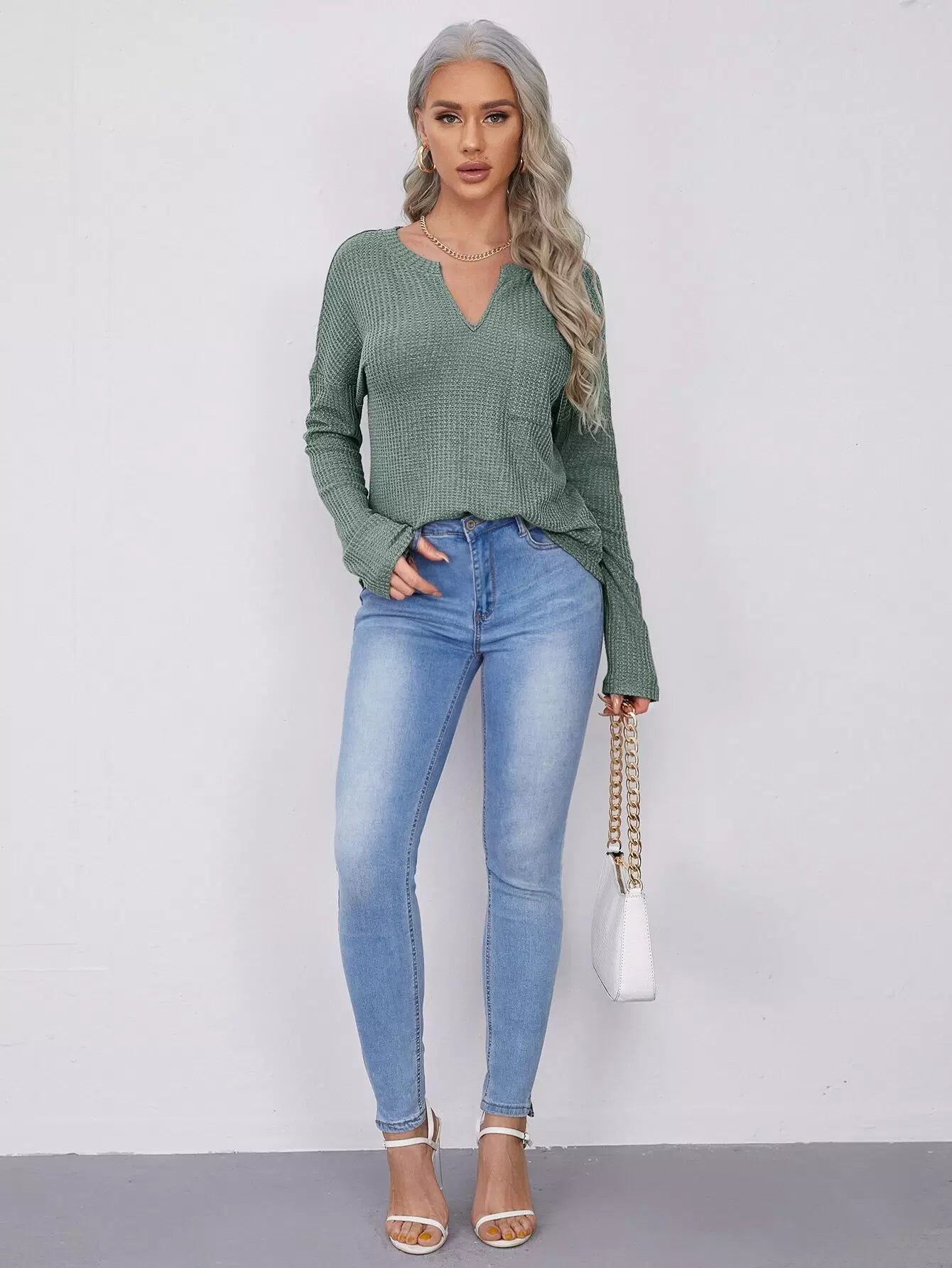بلوزة محبوكة بفتحة رقبة بفتحة جيب أمامية من نسيج الوافل المحبوك