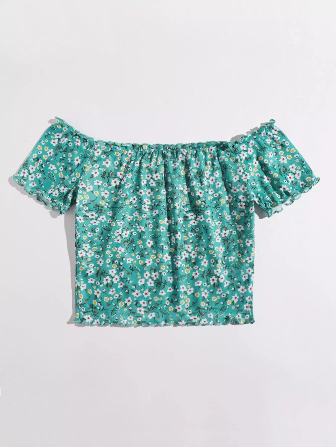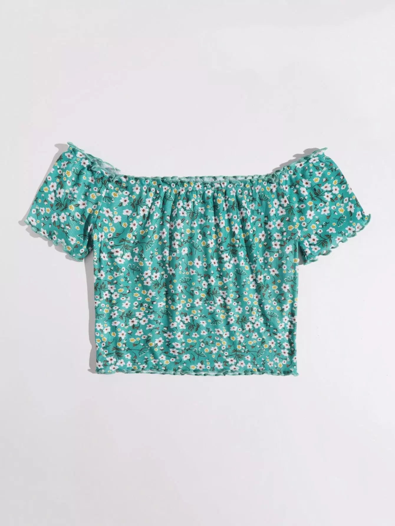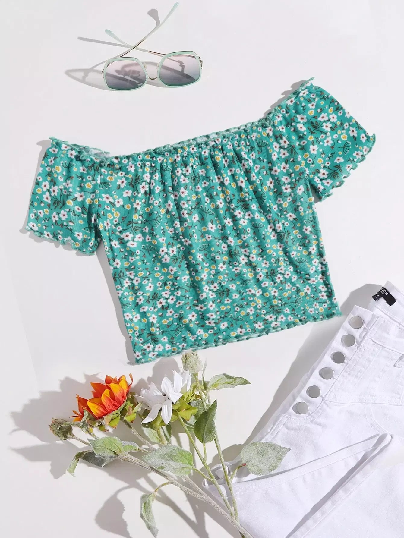 بلوزة بحواف من دون أكتاف مزينة بالخس ومزينة بالزهور