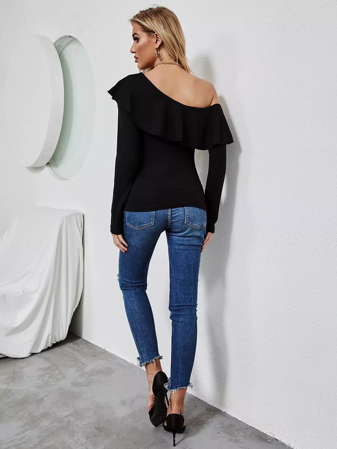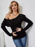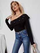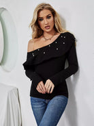 تي شيرت مزين باللؤلؤ مع رقبة غير متماثلة وحواف مكشكشة