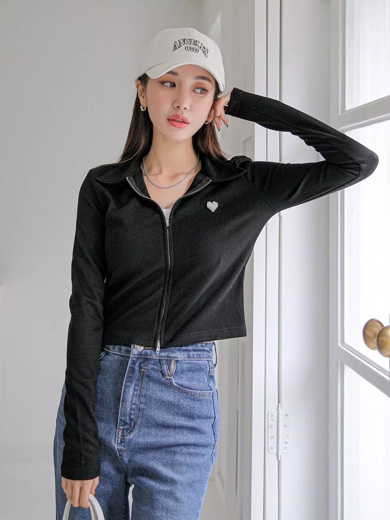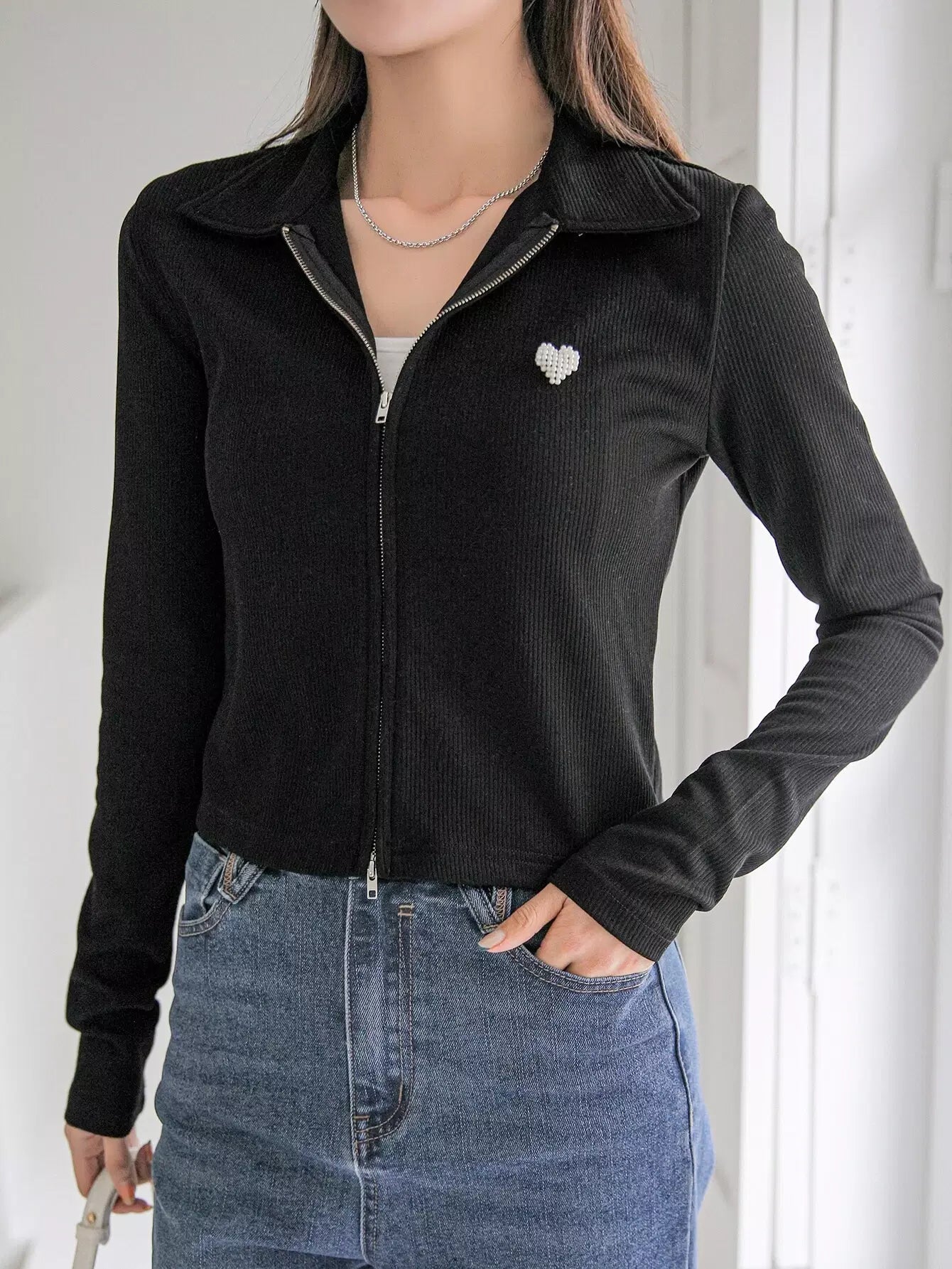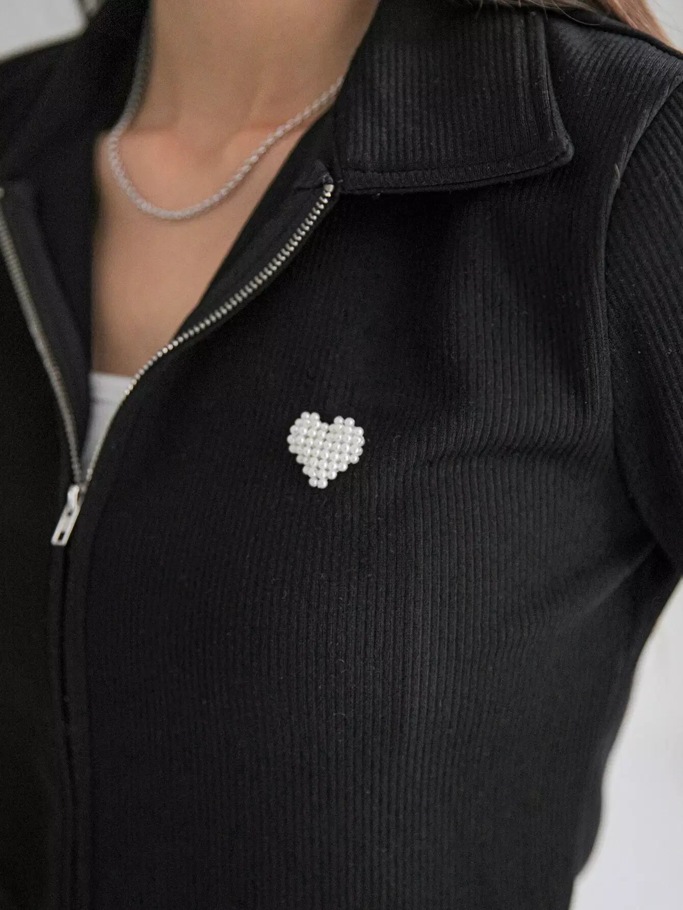 تي شيرت مزين باللآلئ بنقشة قلب مطرز بالخرز بسحاب