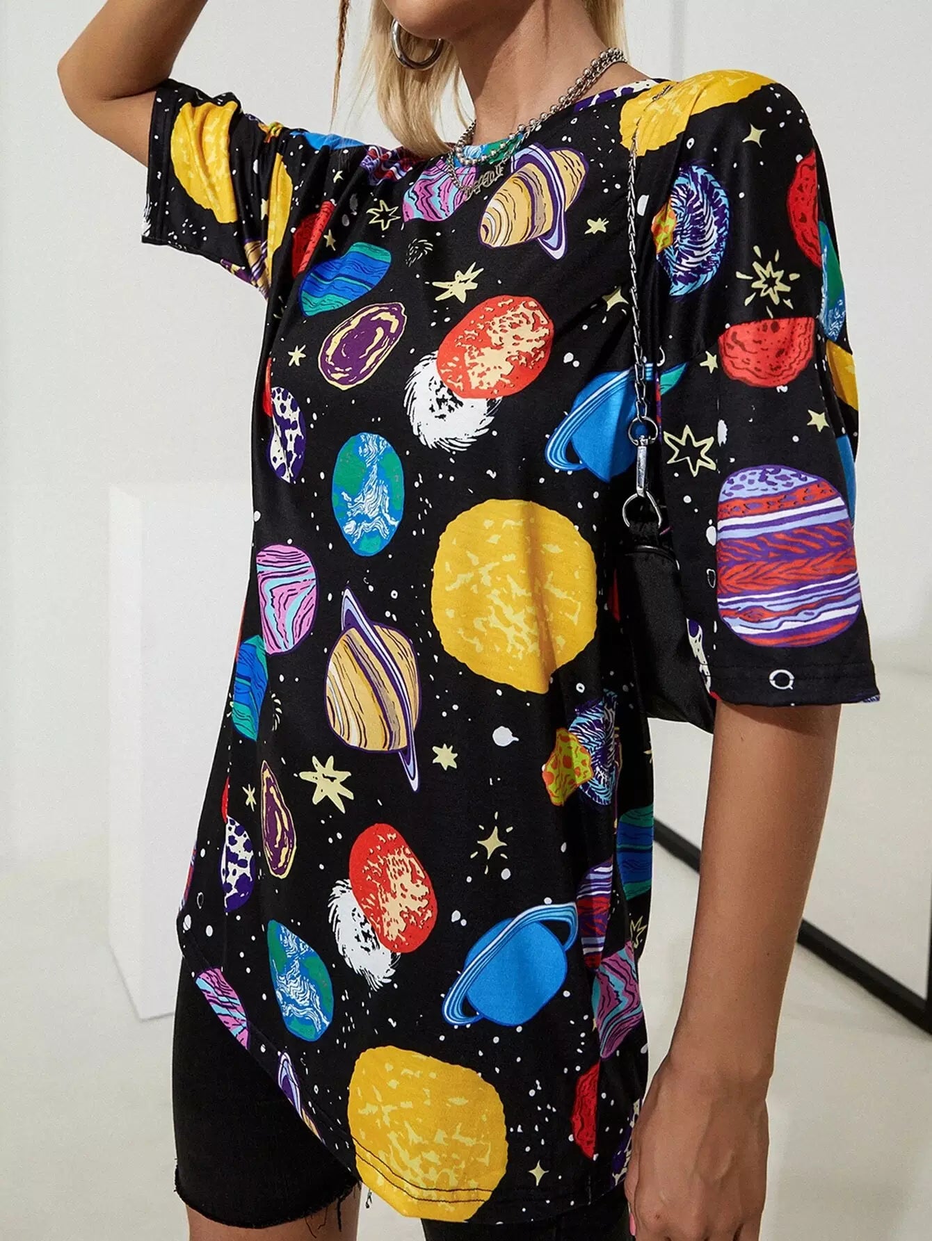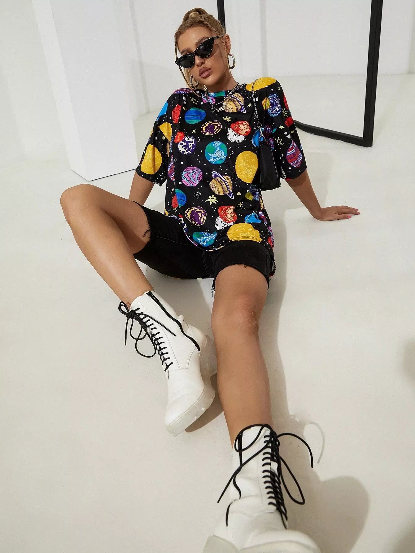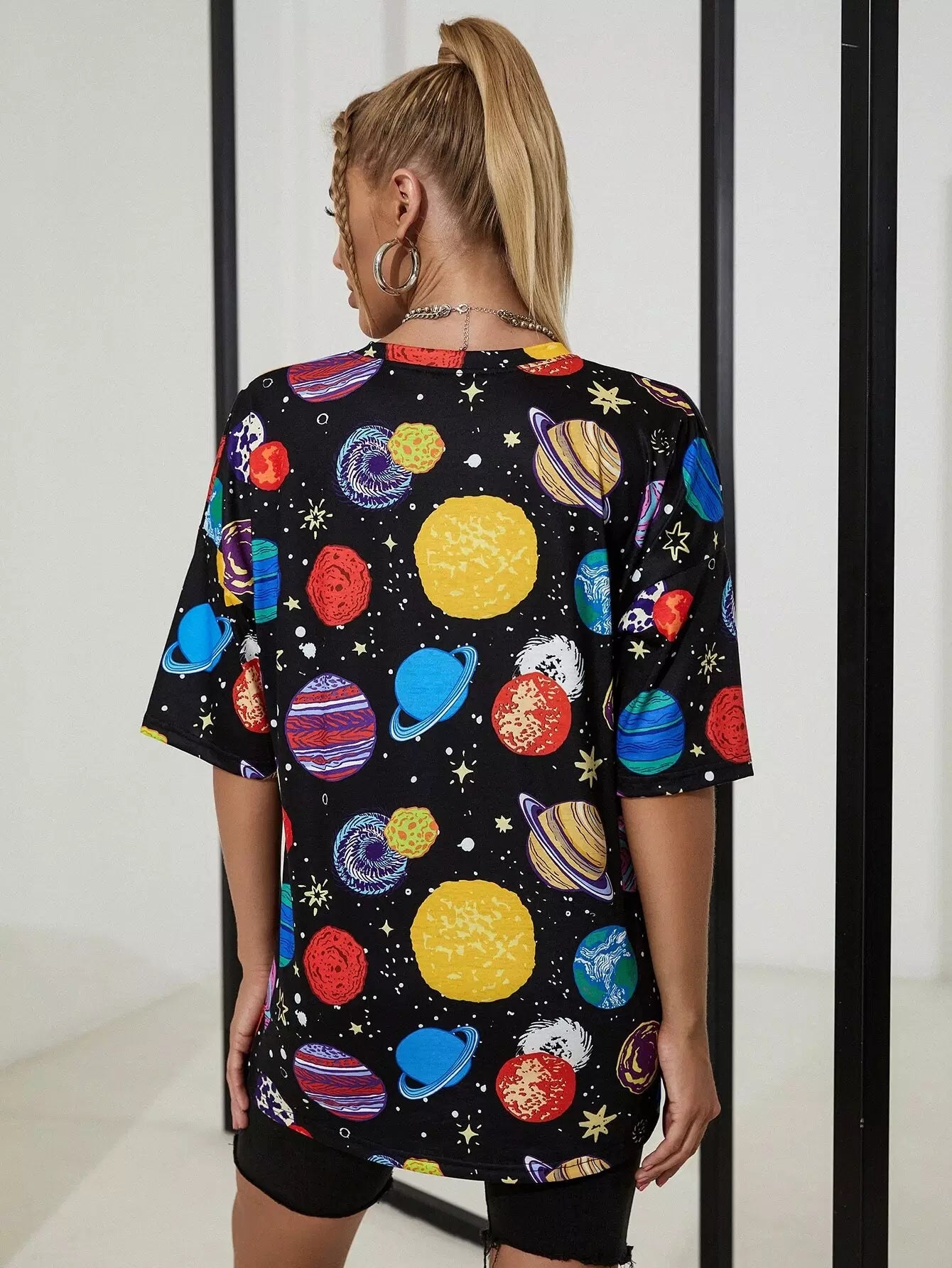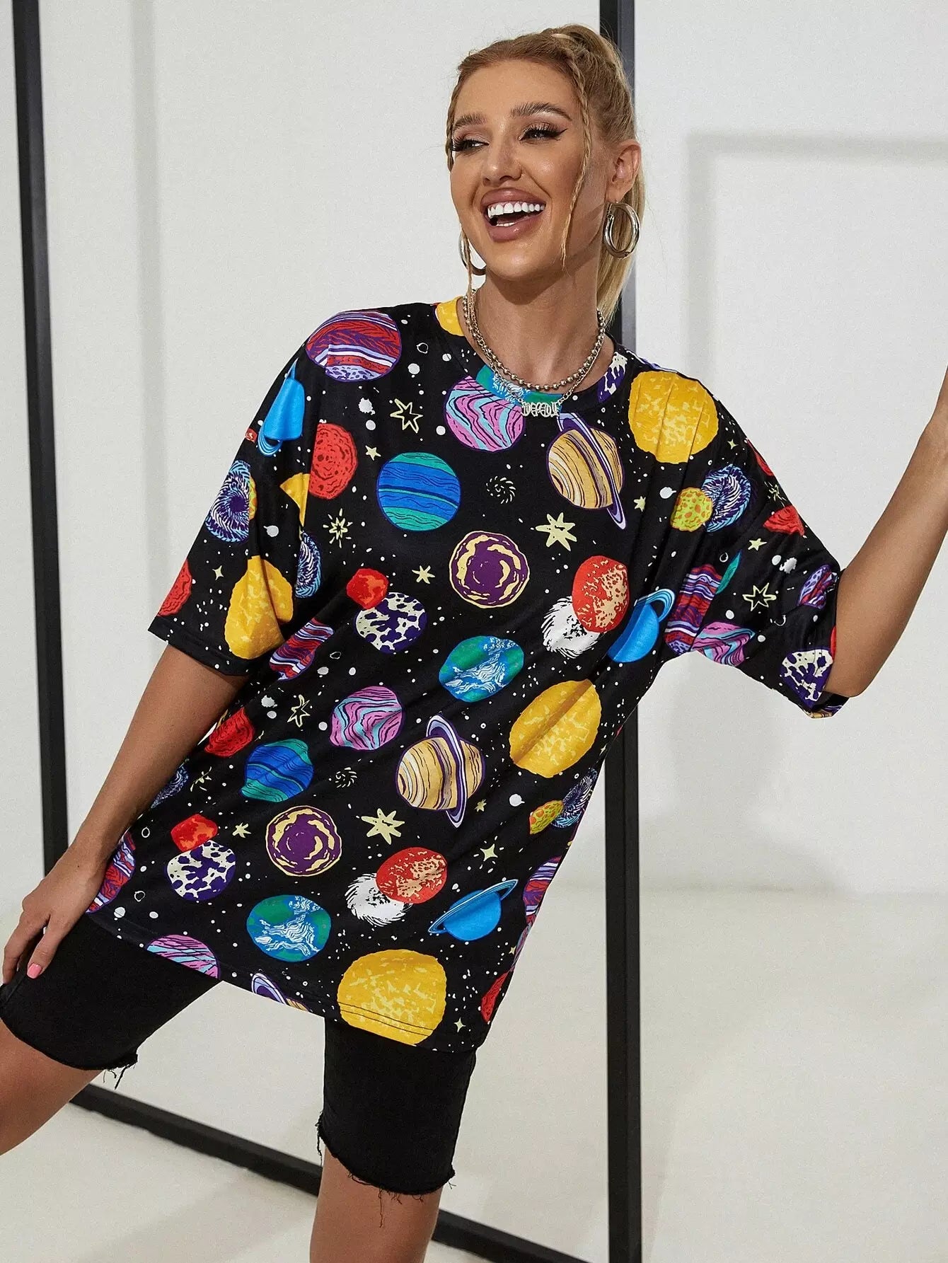 تي شيرت منسدل الكتفين مطبوع عليه طبعة بلانيت