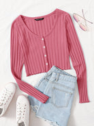 Qutie Buttoned Front Lettuce Trim Rib-knit Top