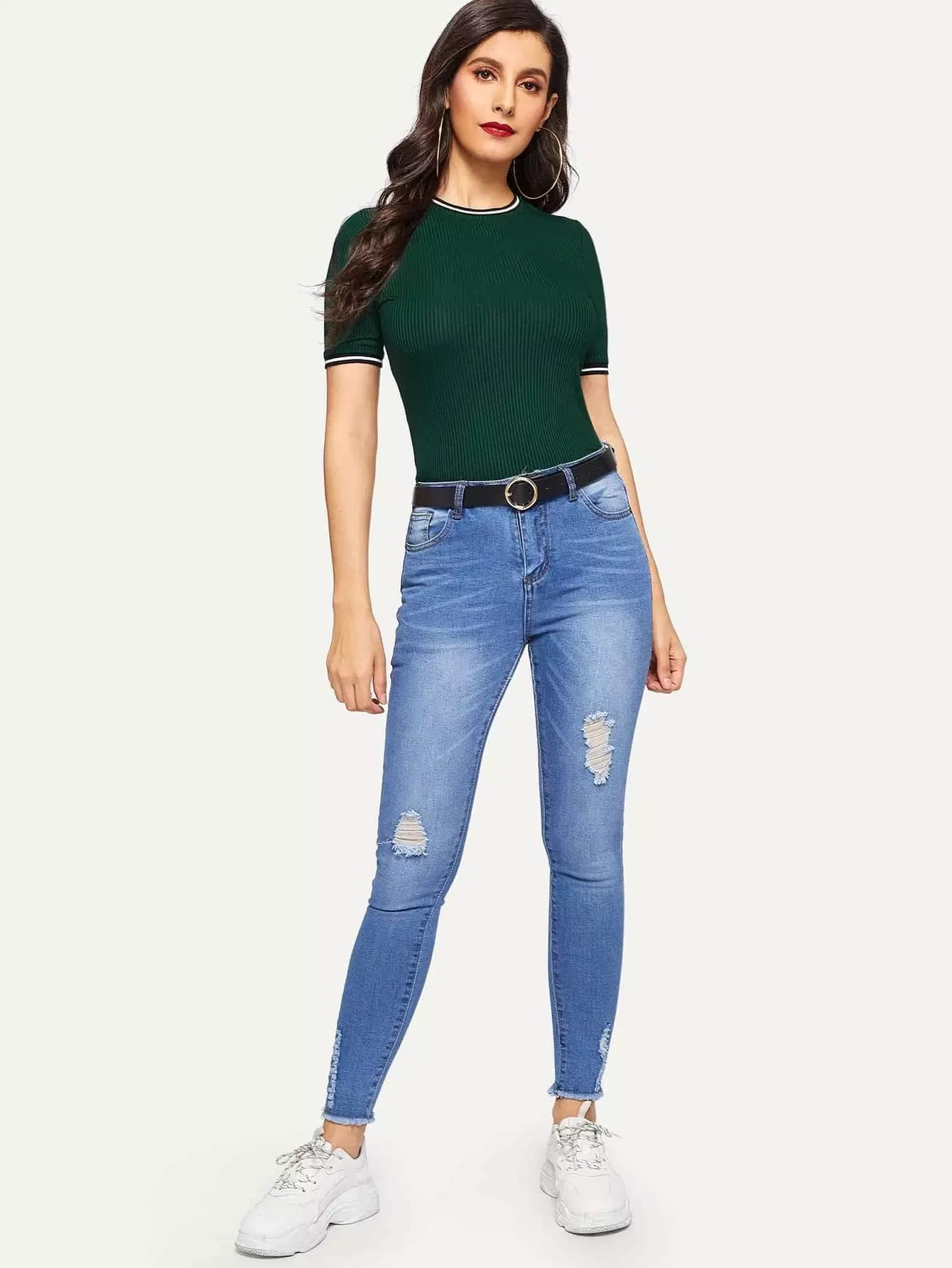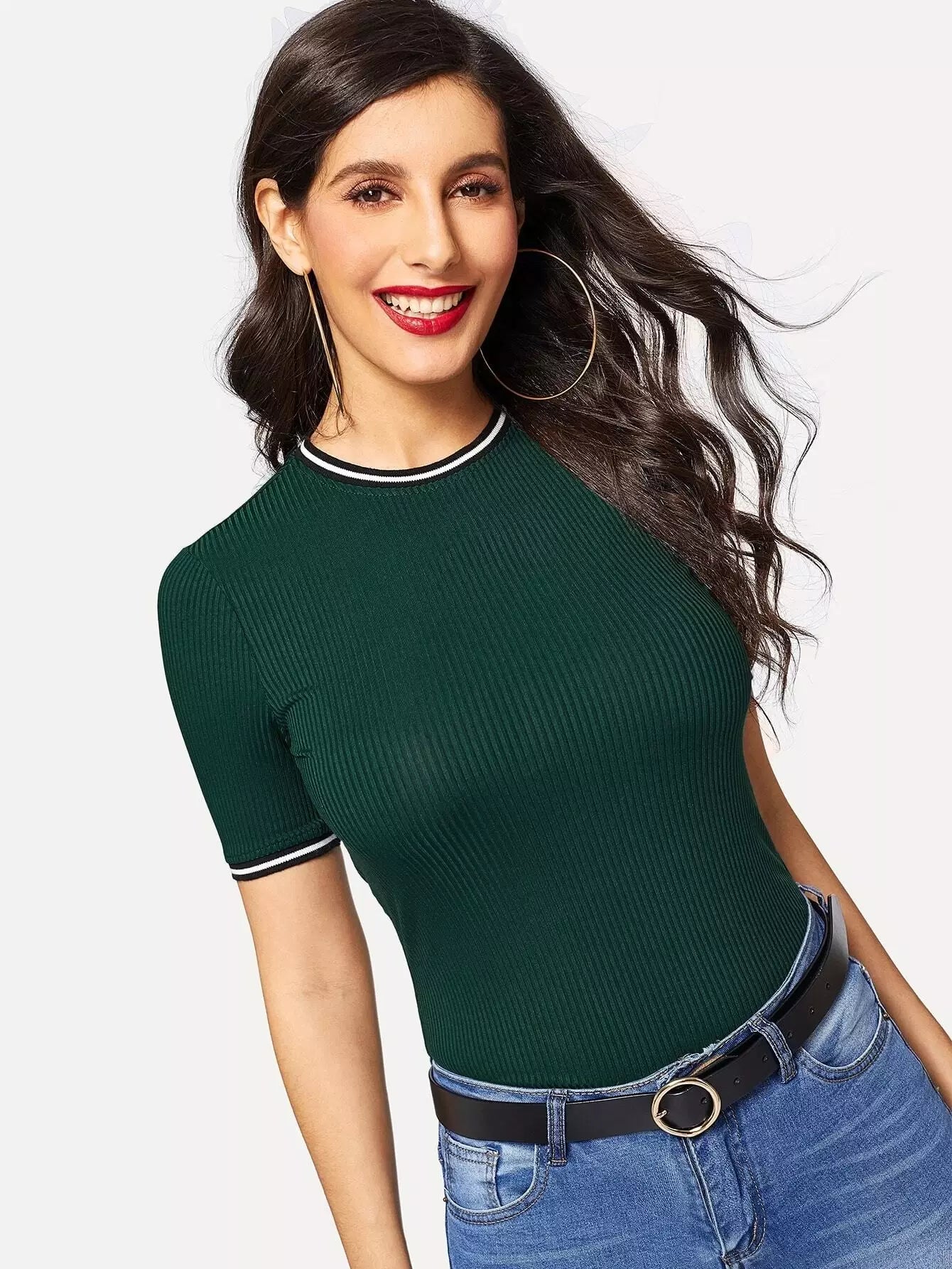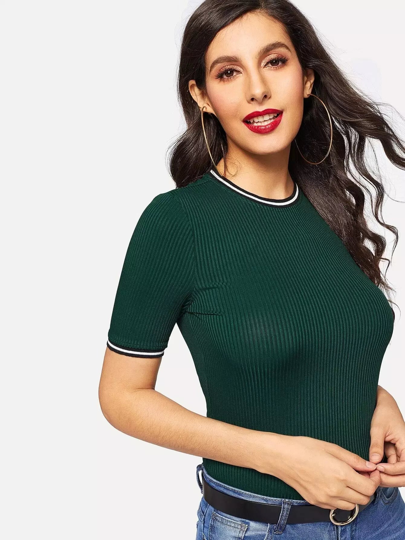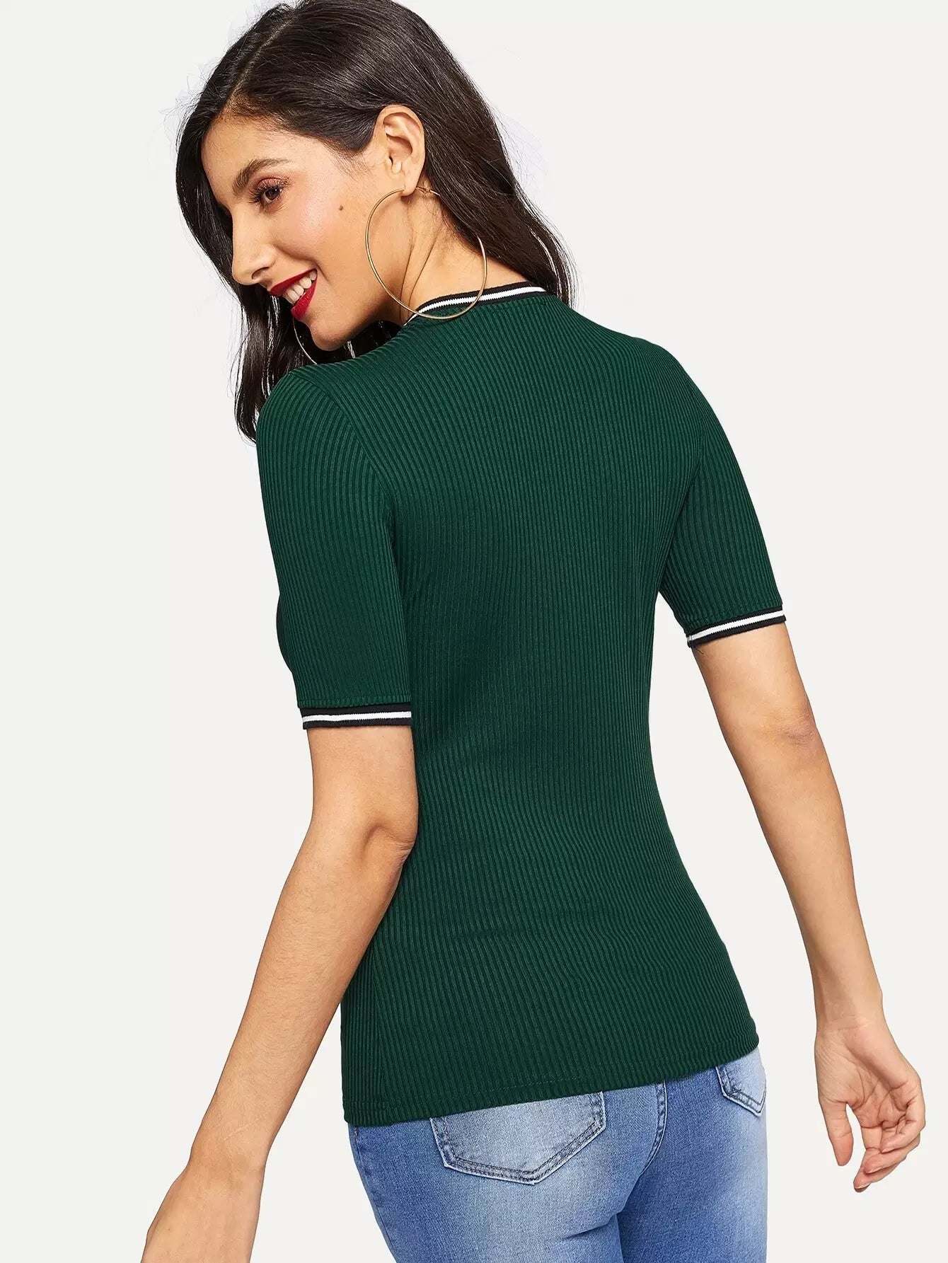 تي شيرت بحواف مخططة على شكل ضلع محبوكة