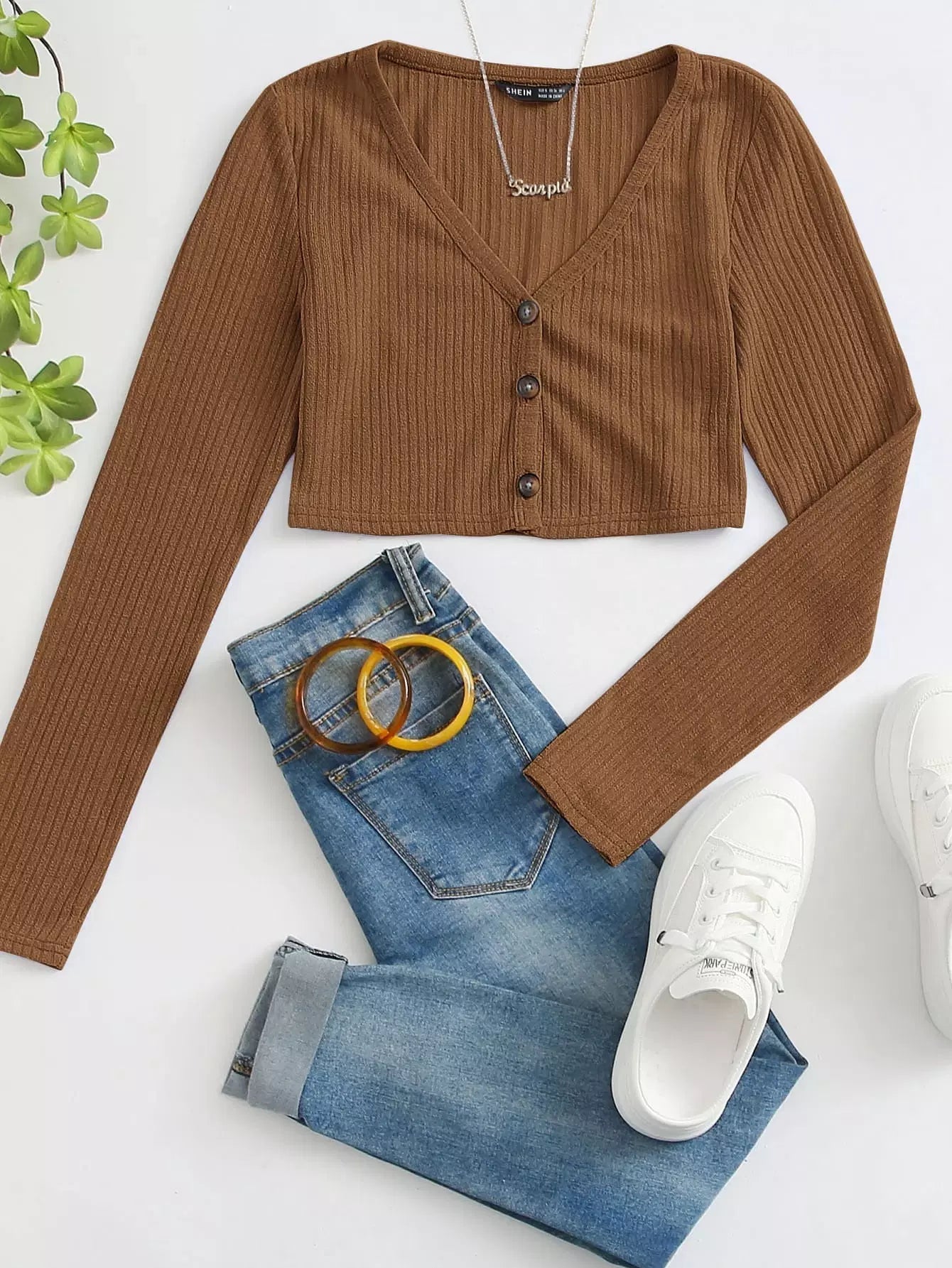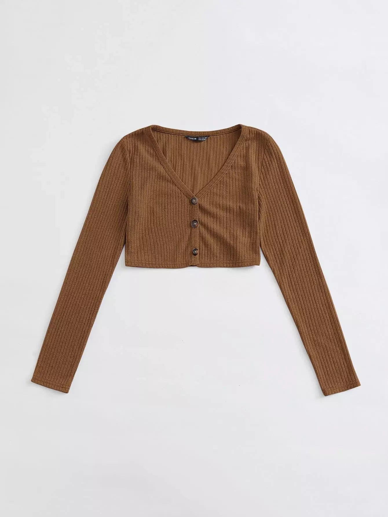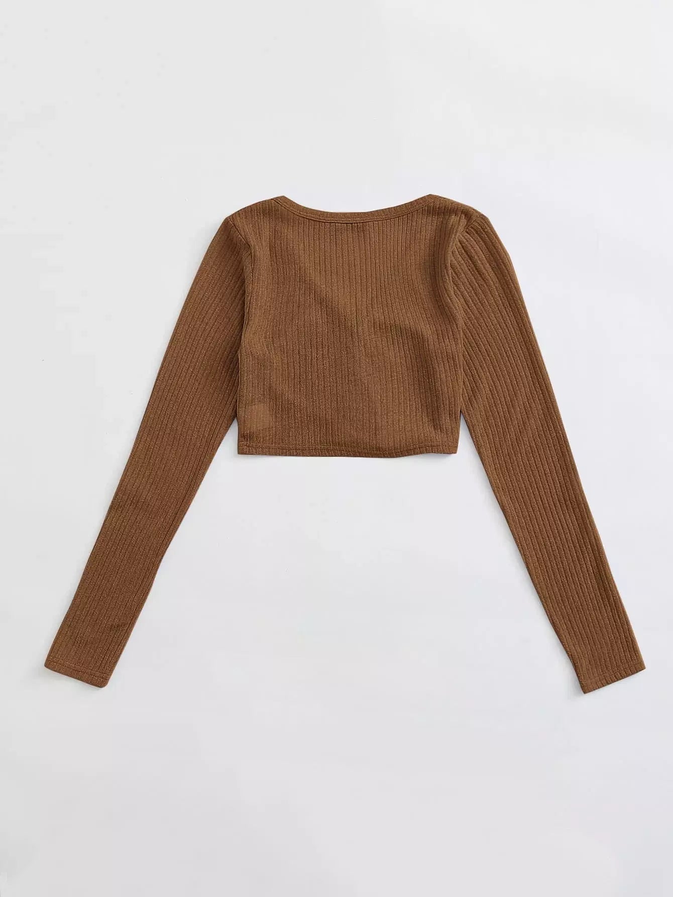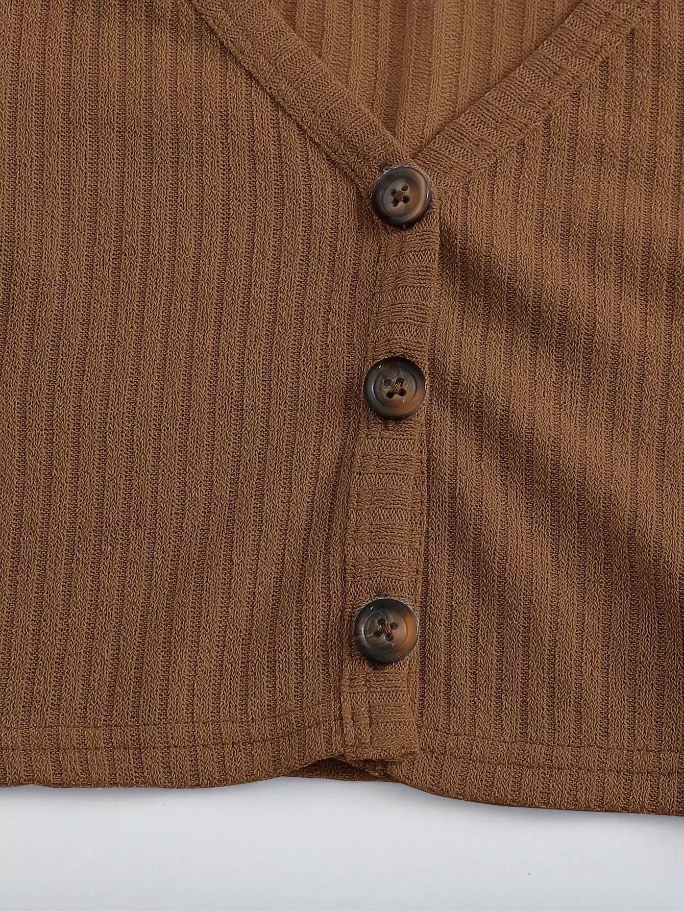 للنساء - تي شيرت قصير بأكمام طويلة وأزرار أمامية مضلعة