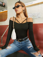 تي شيرت ذو أكتاف باردة متماسكة مضلعة ومحبوكة سادة