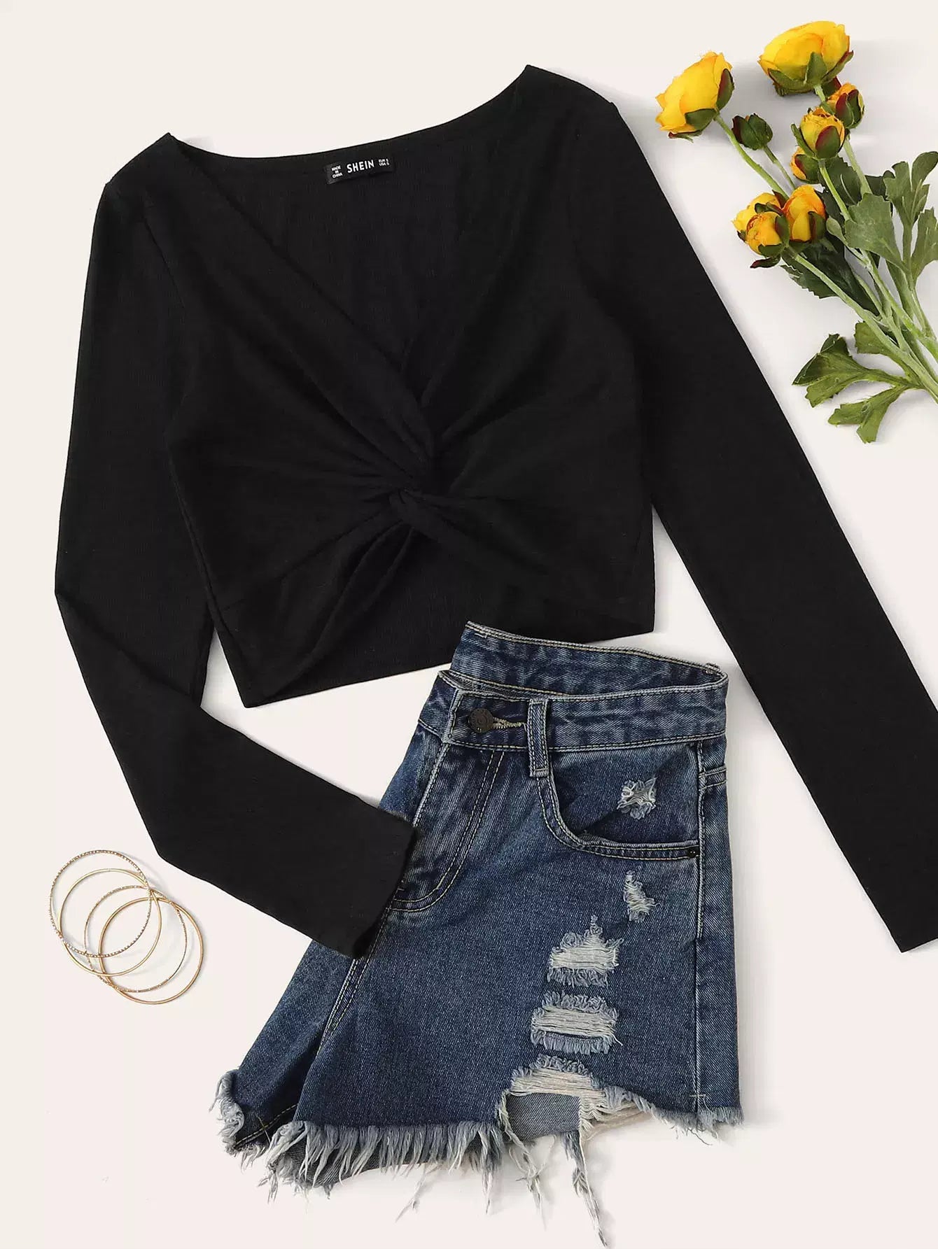 بلوزة قصيرة بجزء علوي مضلعة ملتوية من الأمام مضلعة