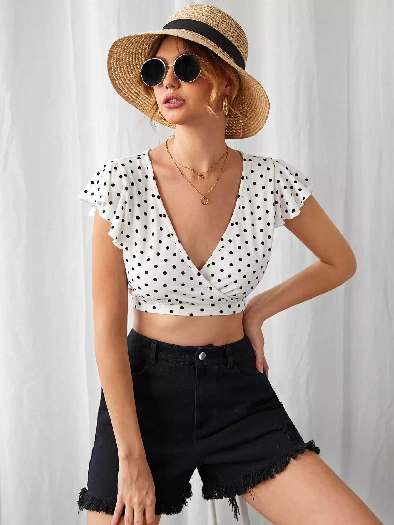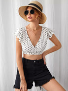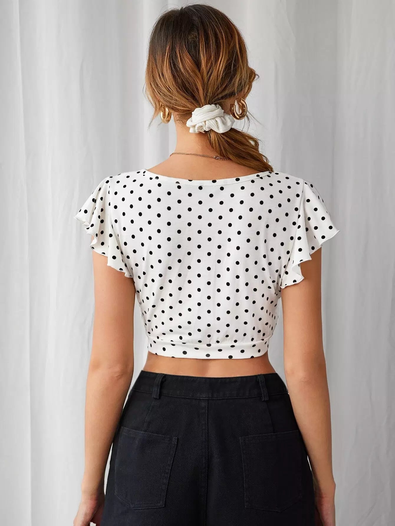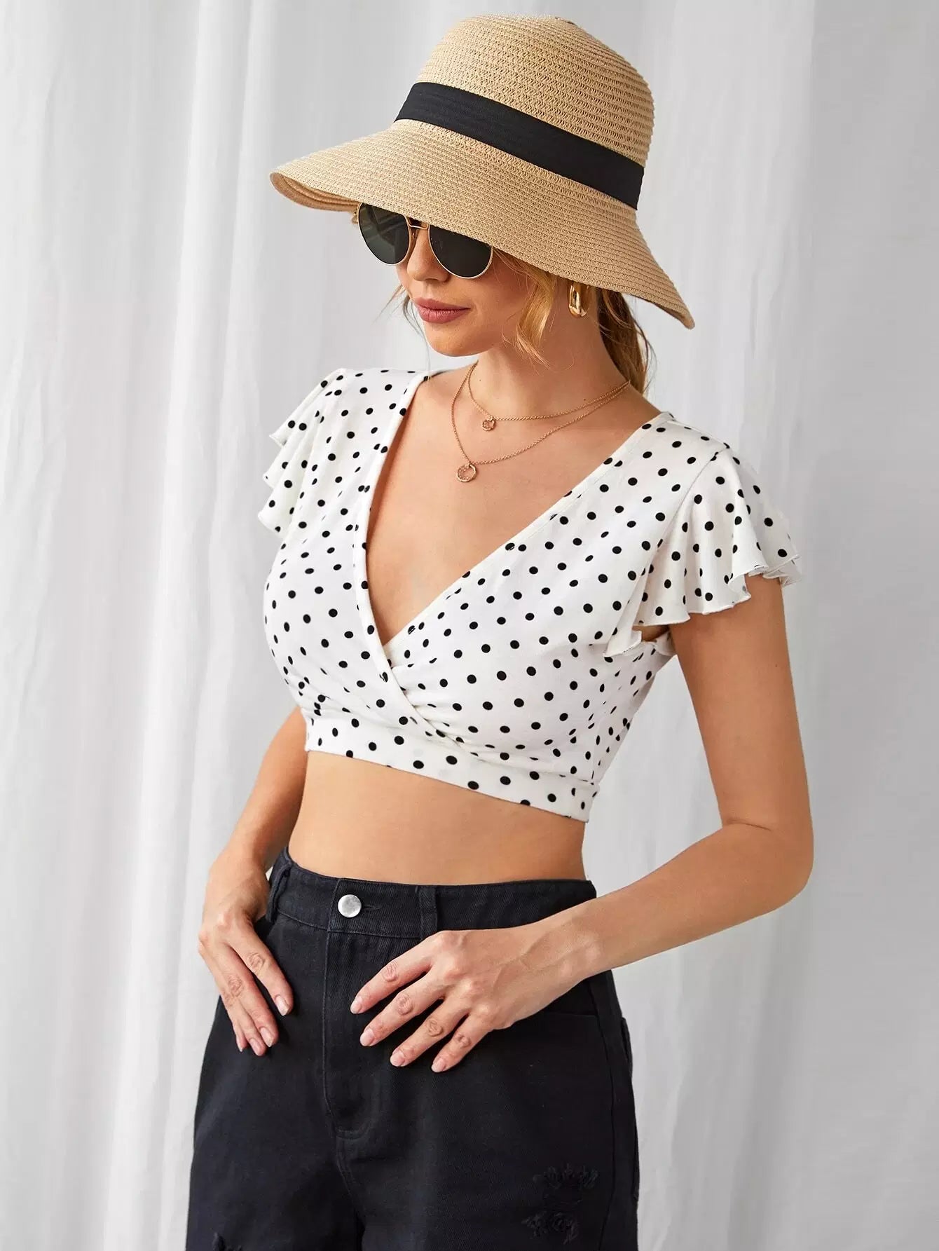 بلوزة منقطه بفتحة رقبة على شكل حرف V وحواف مكشكشة