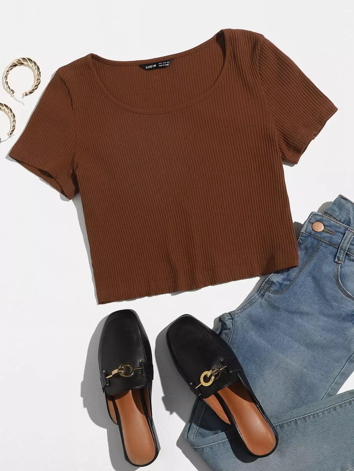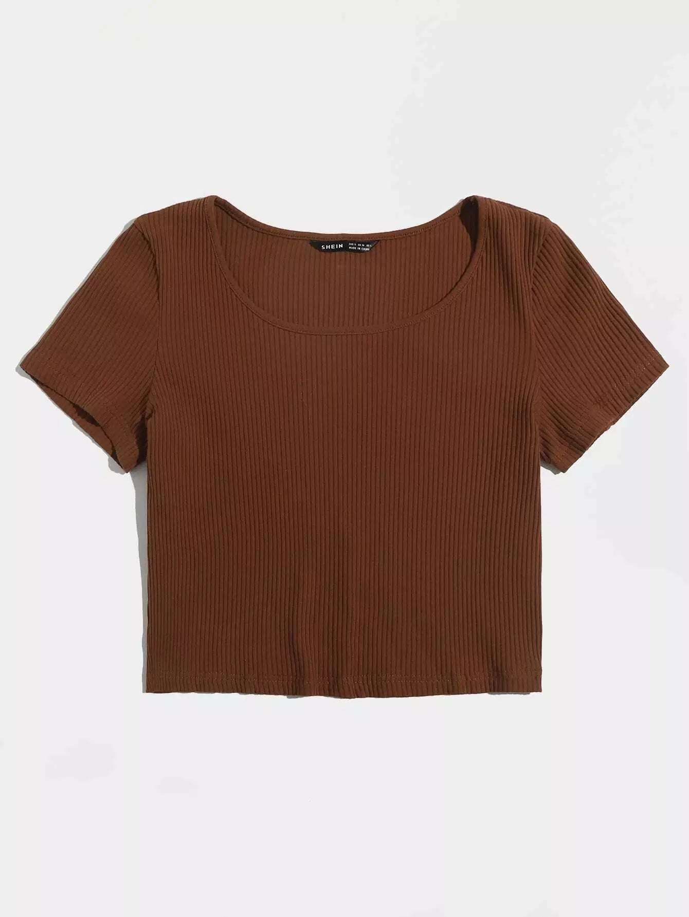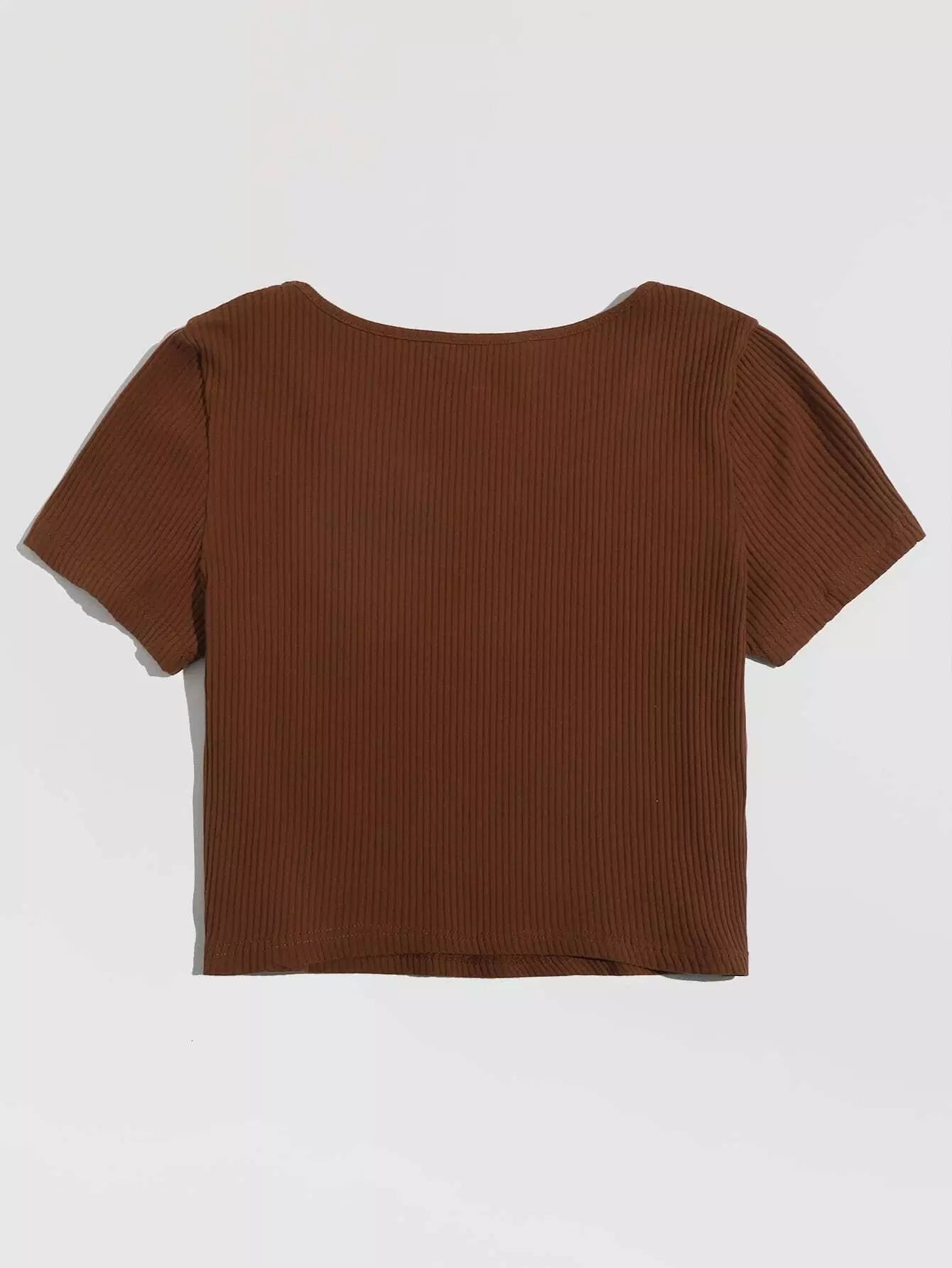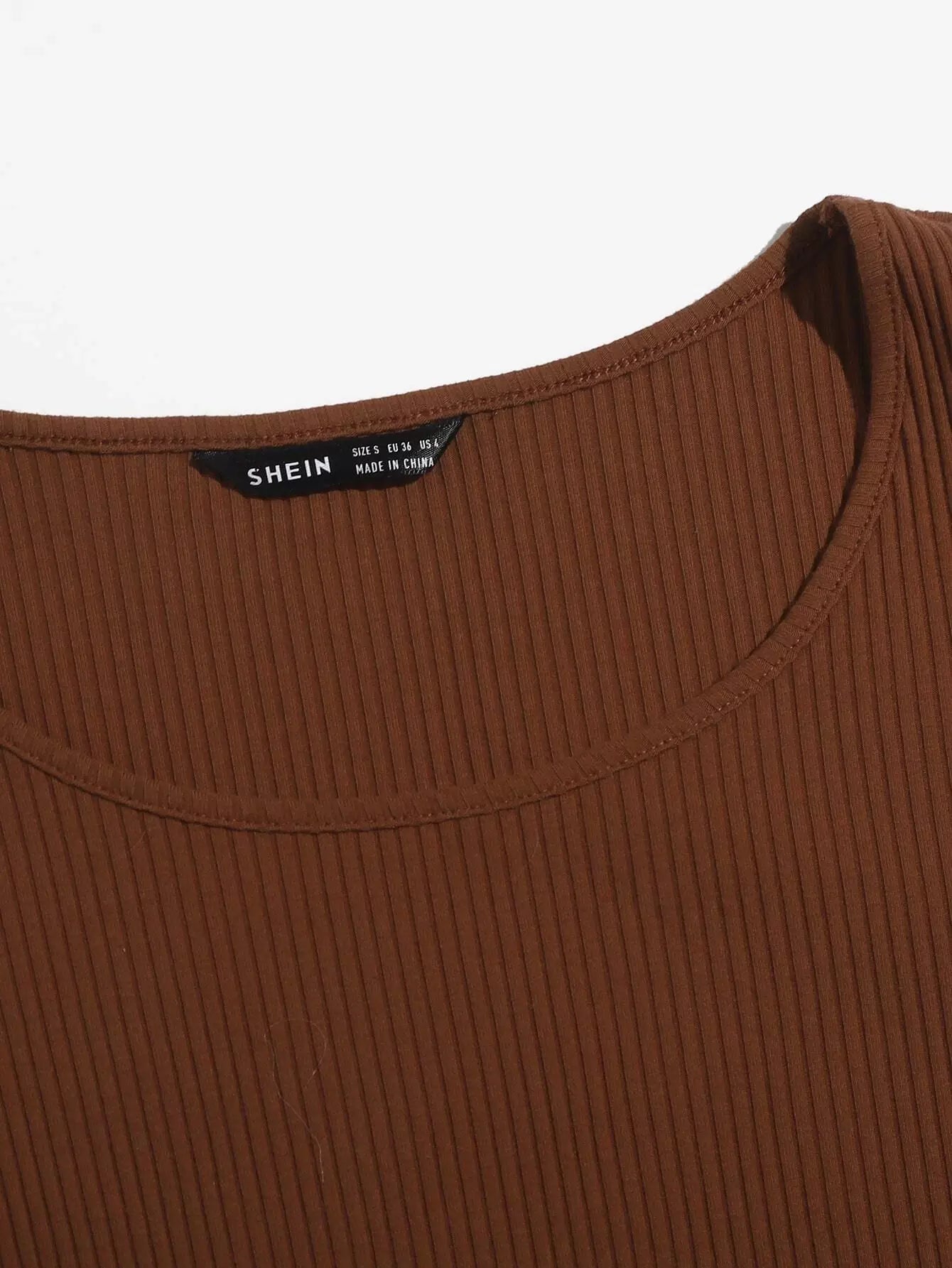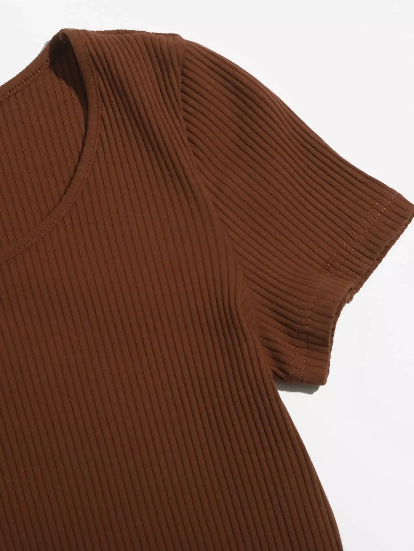 تي شيرت برقبة دائرية محبوكة على شكل ضلع محبوكة