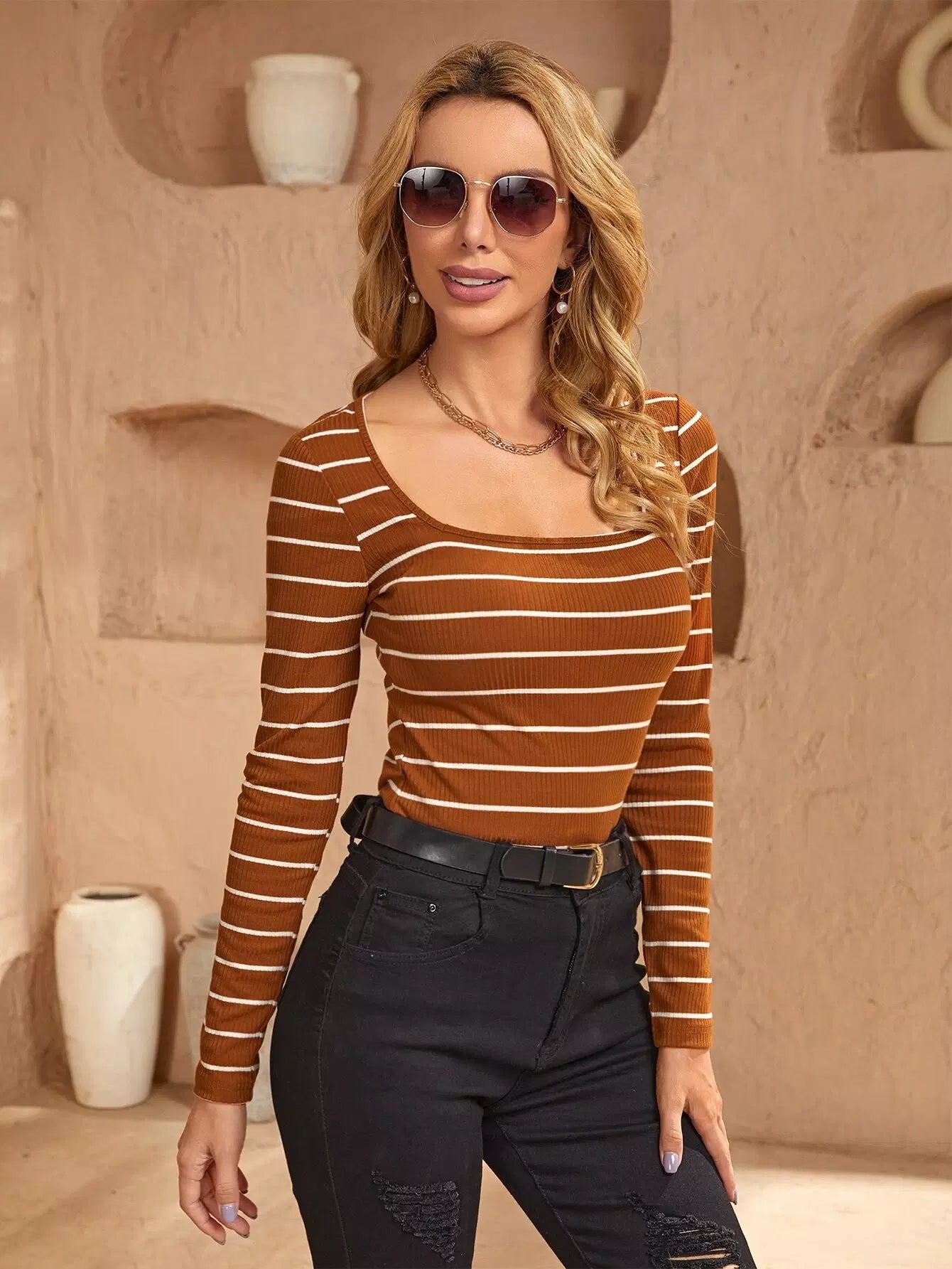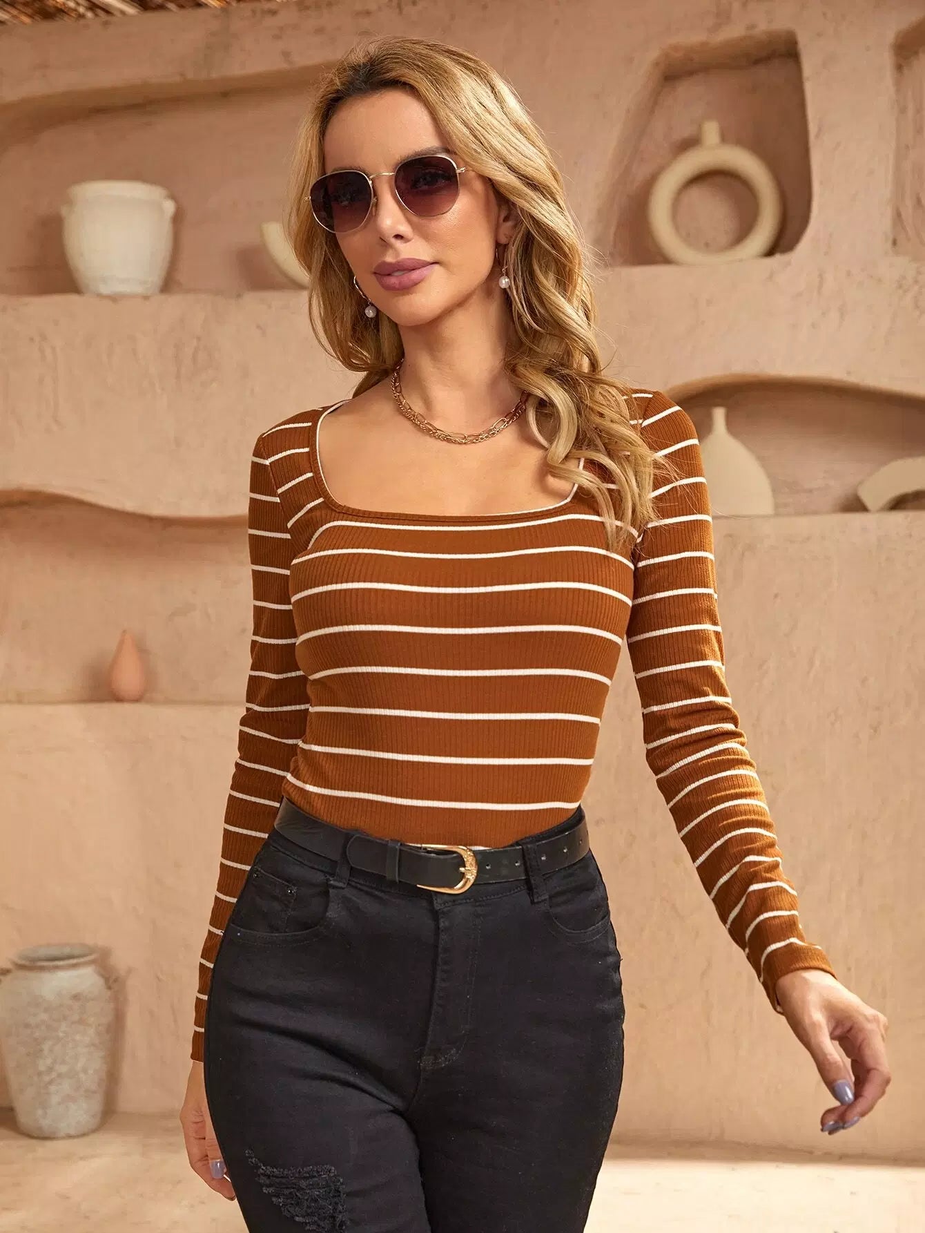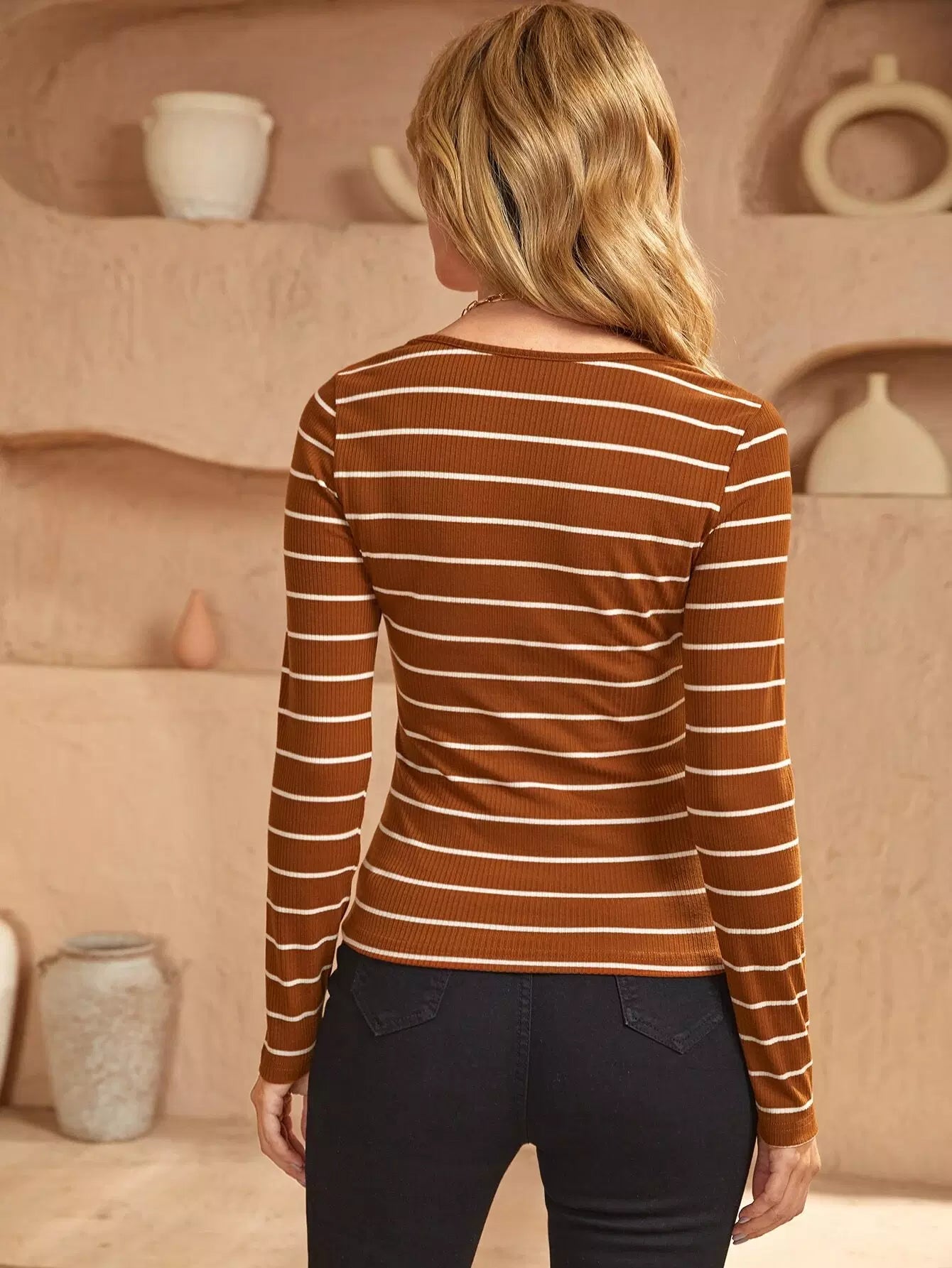 تي شيرت برقبة دائرية برقبة دائرية مخططة على شكل ضلع