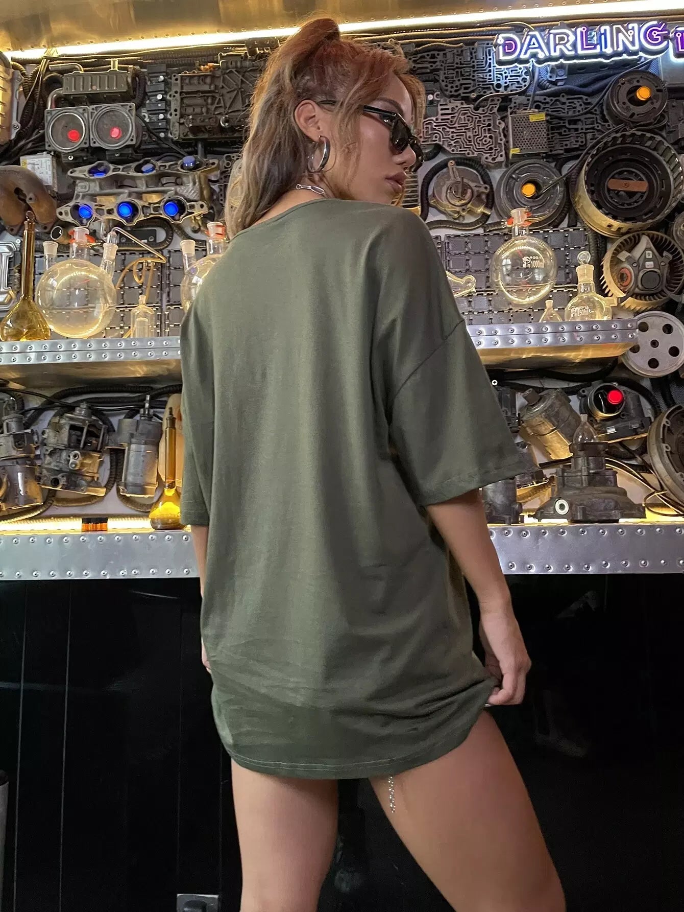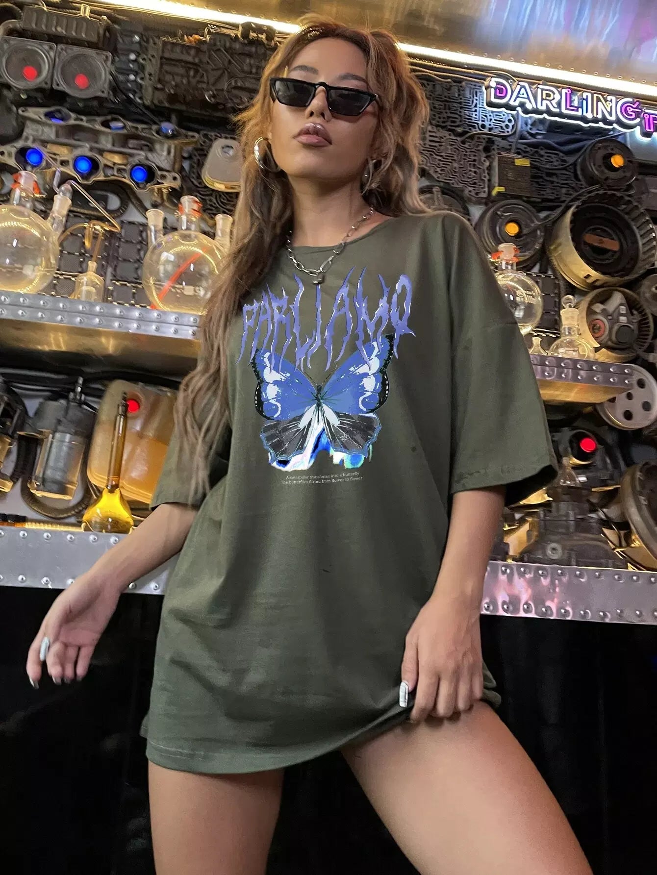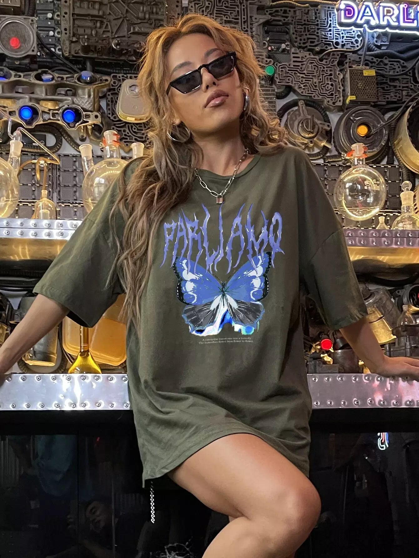 تي شيرت بكتف منسدل بطبعة شعار وفراشة