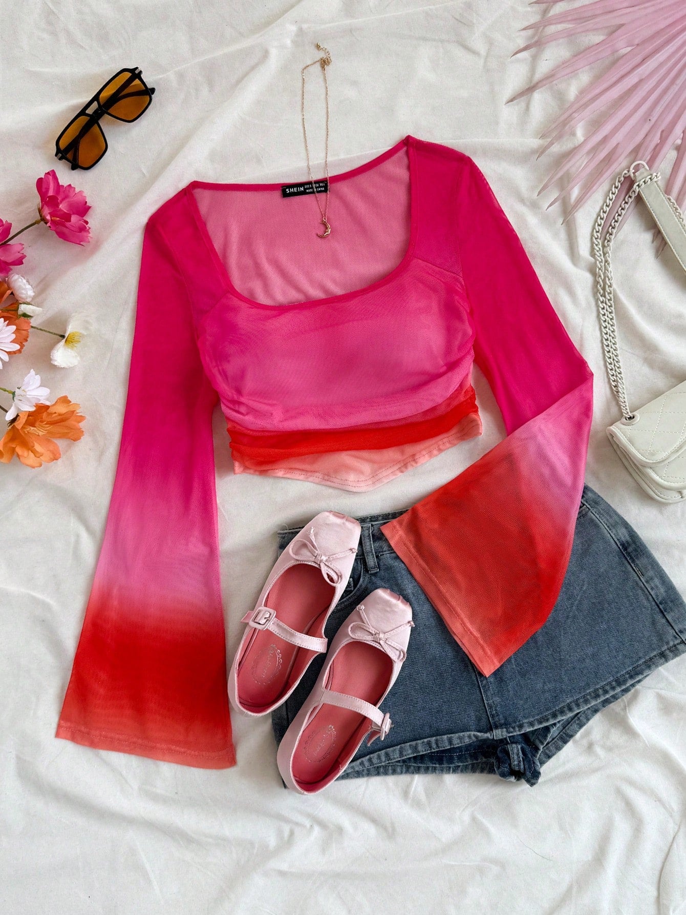 women Soleia Women's Vacation Knit Mesh Ombre Print Square Neck Long Sleeve Fitted T-Shirt