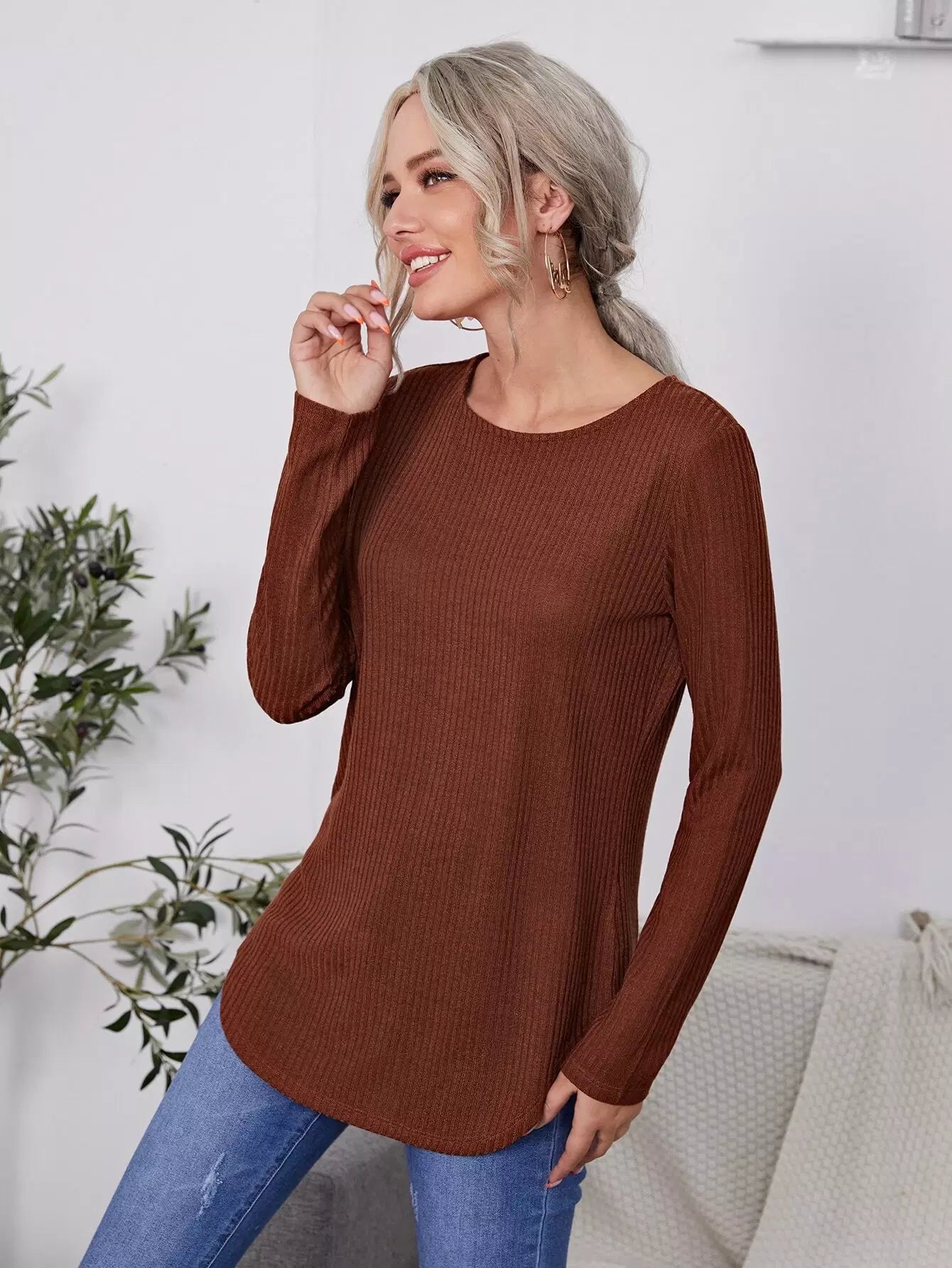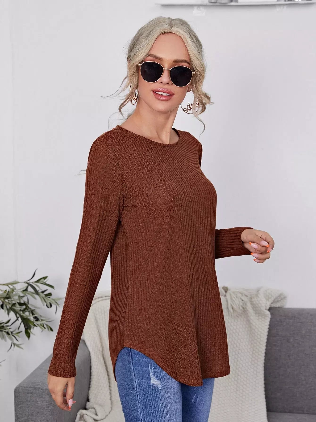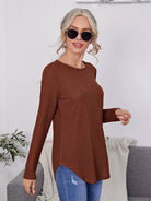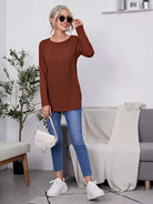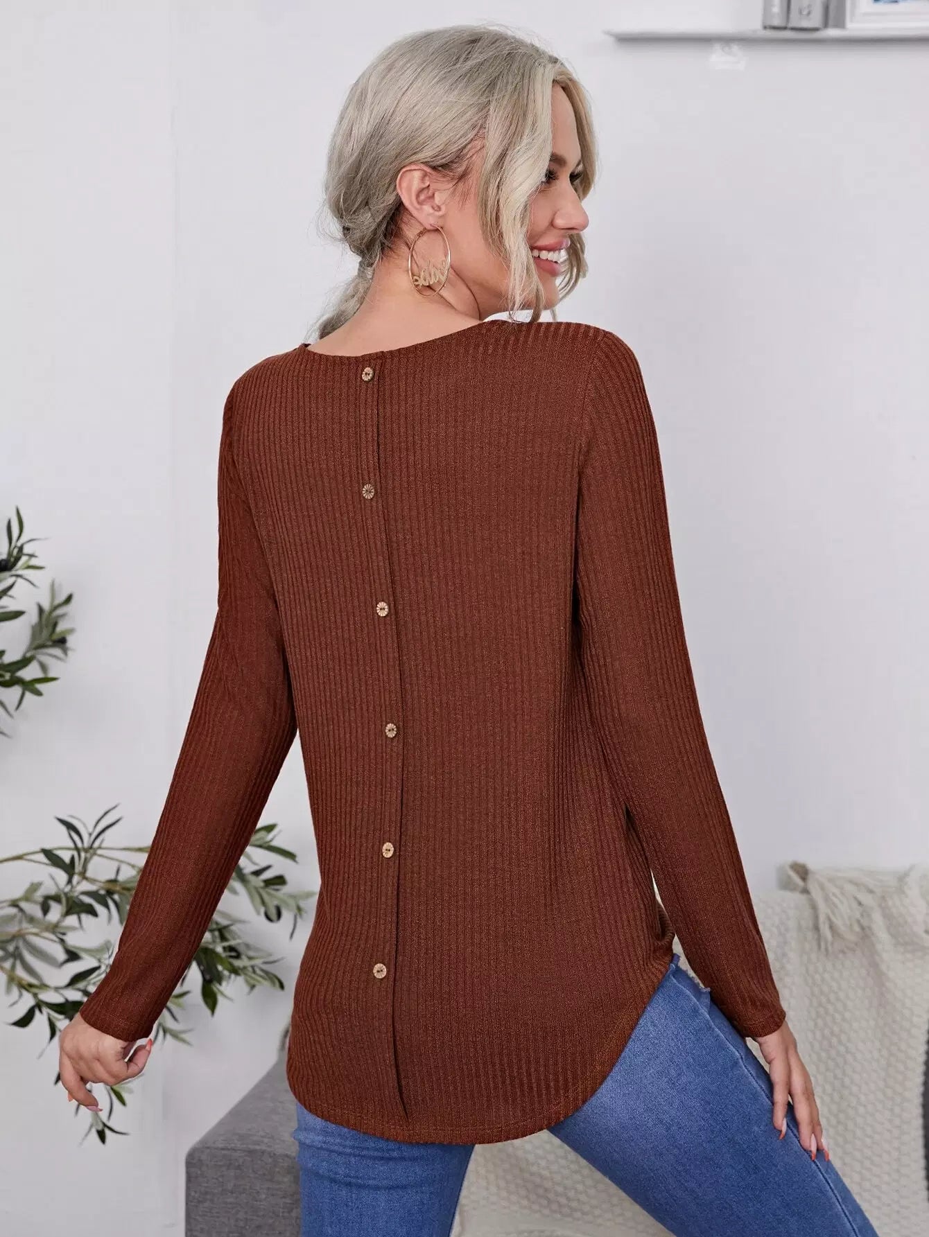 قميص تي شيرت طويل محبوك بأزرار خلفية سادة