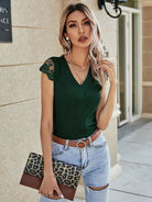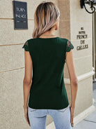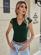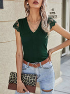 تي شيرت برقبة على شكل V دانتيل بلون سادة متباين