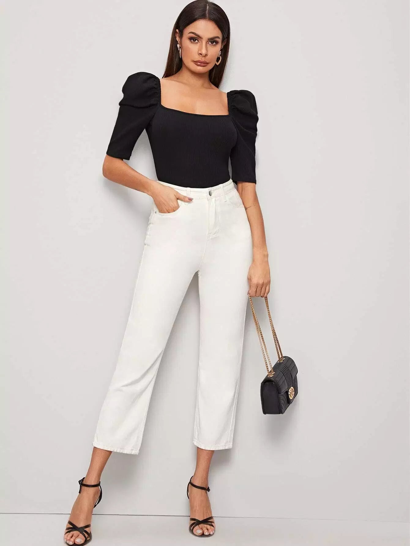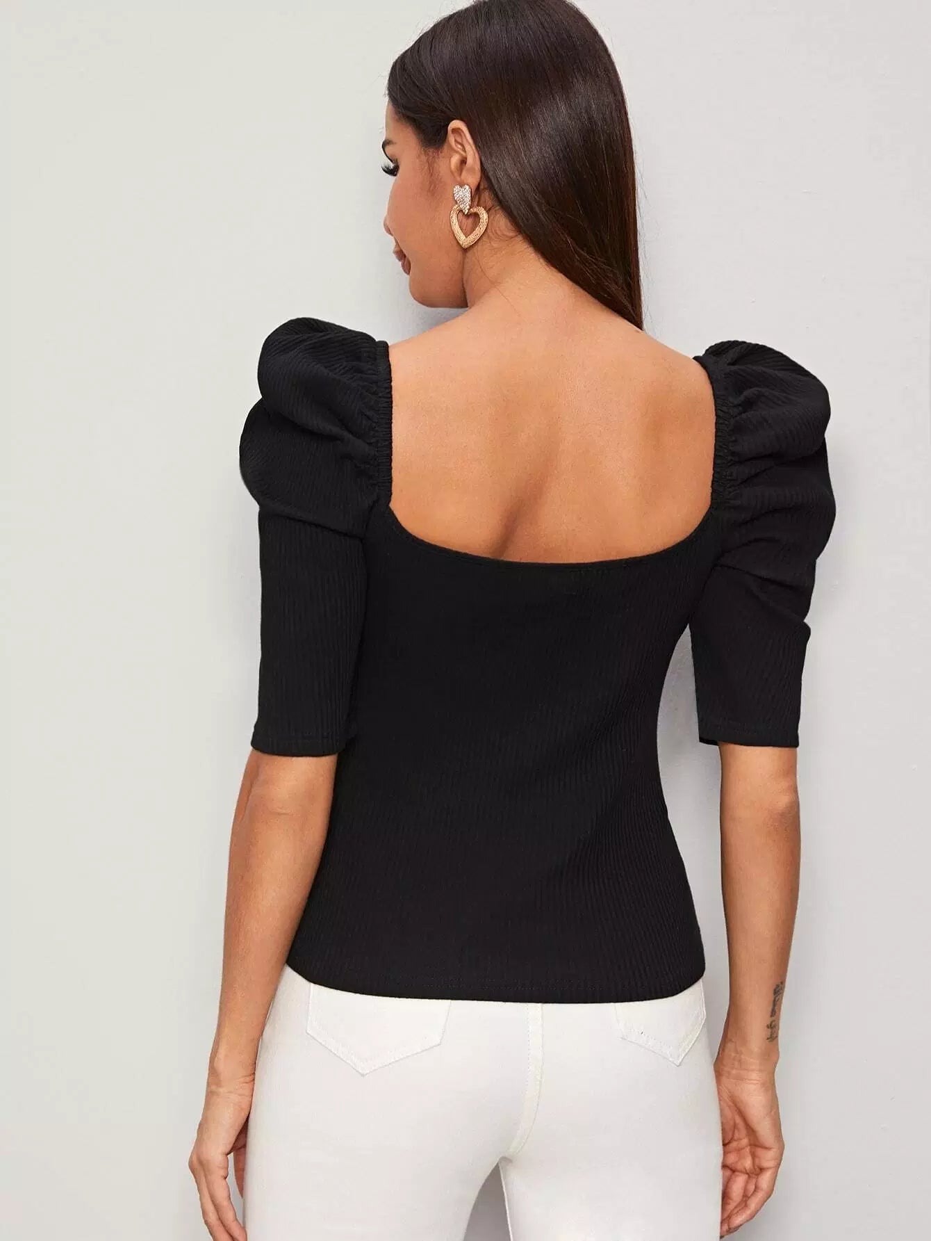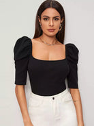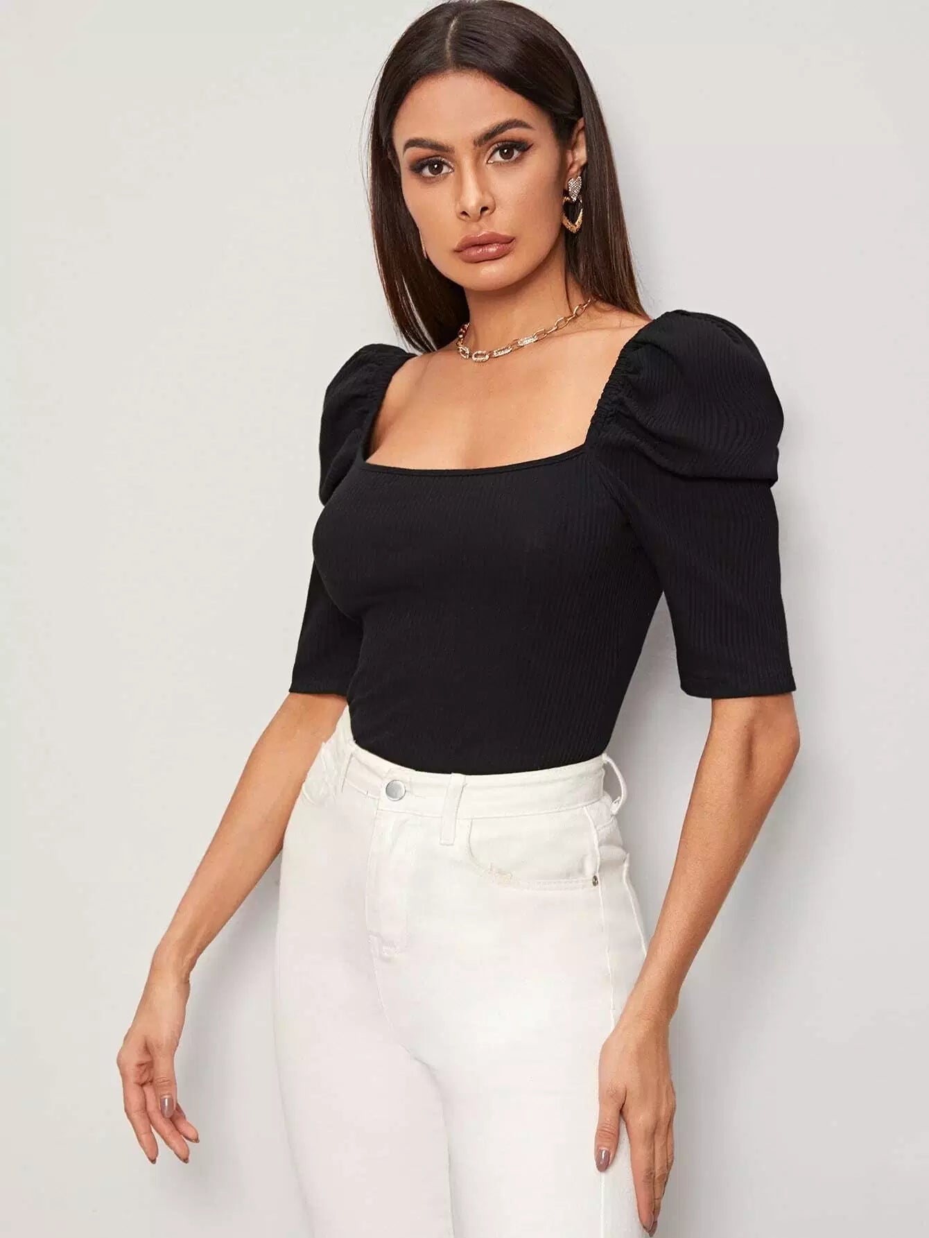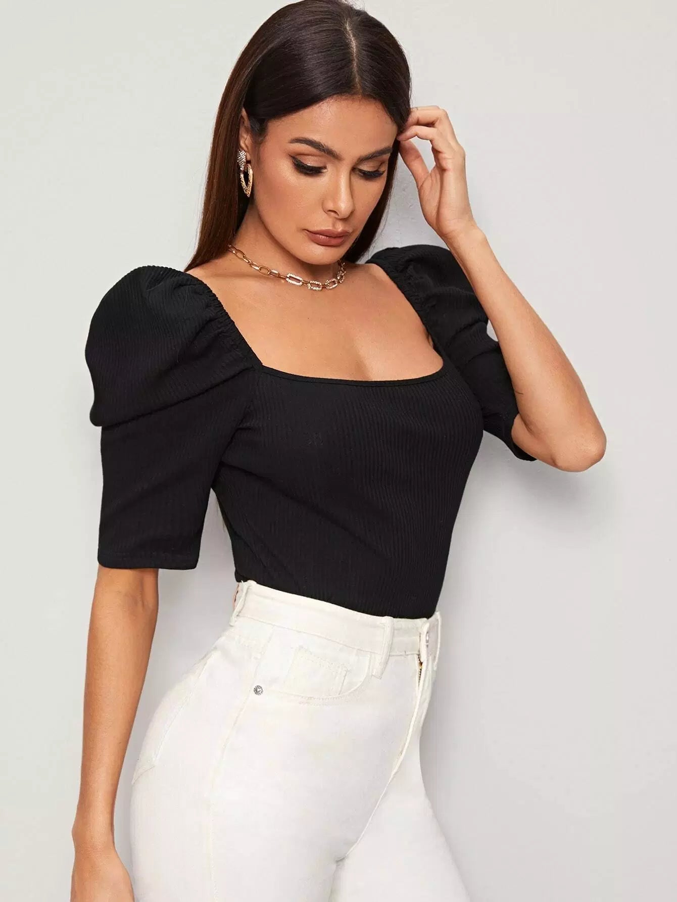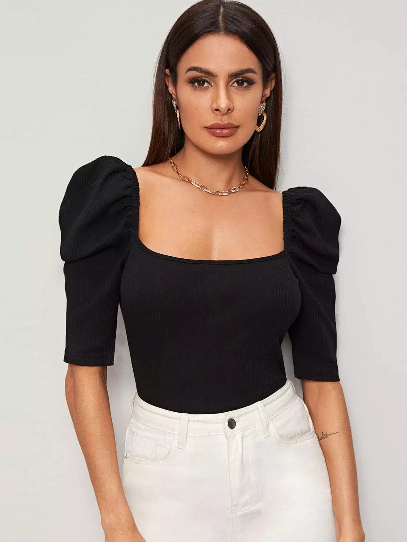 بلوزة بأكمام منفوشة مربعة الرقبة منفوشة بأكمام منفوشة مضلعة