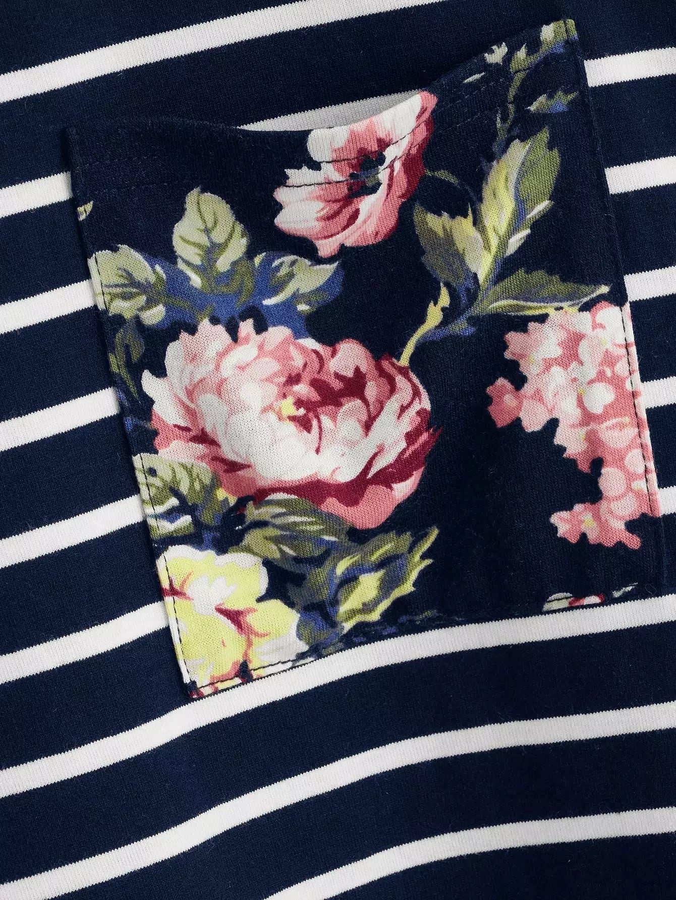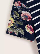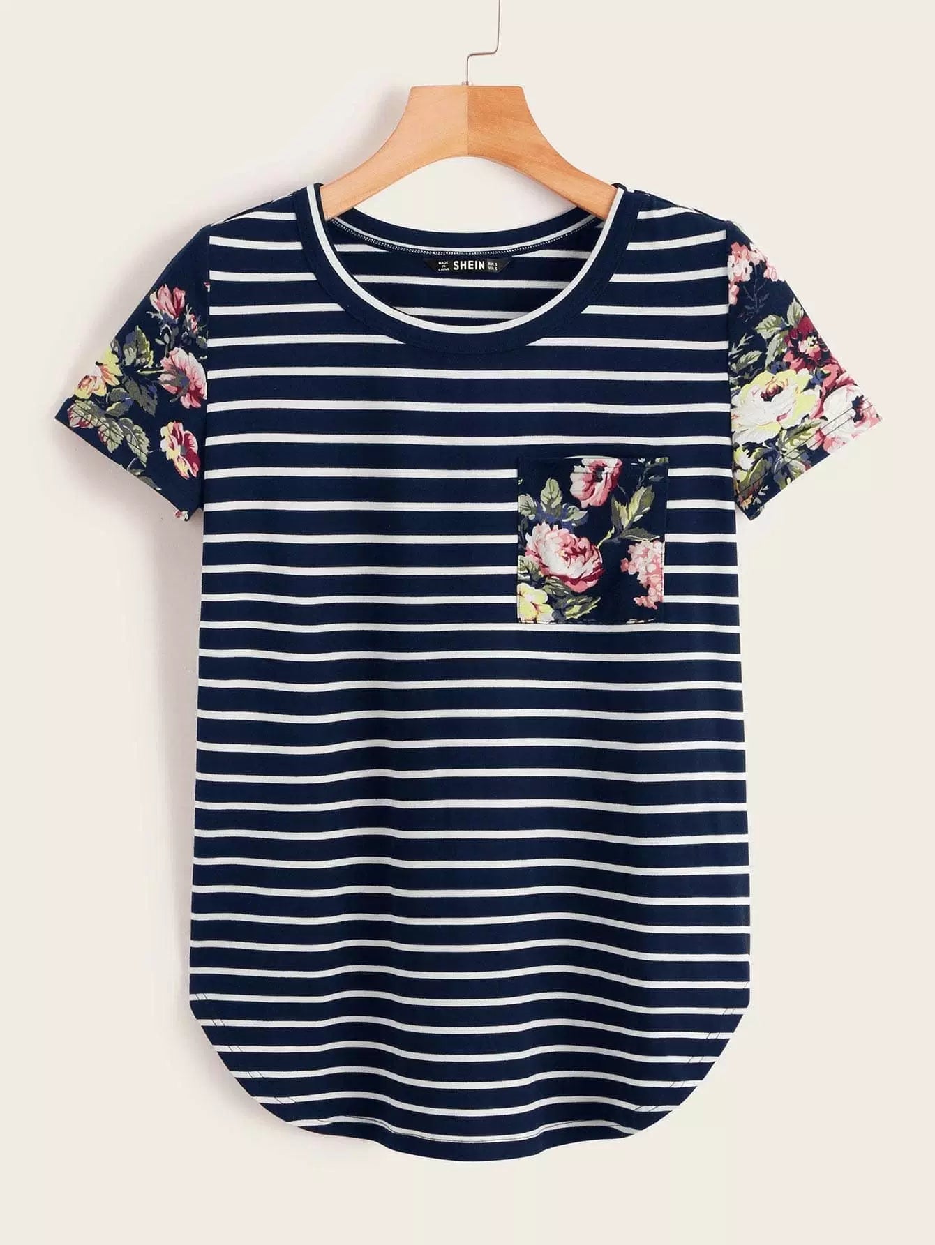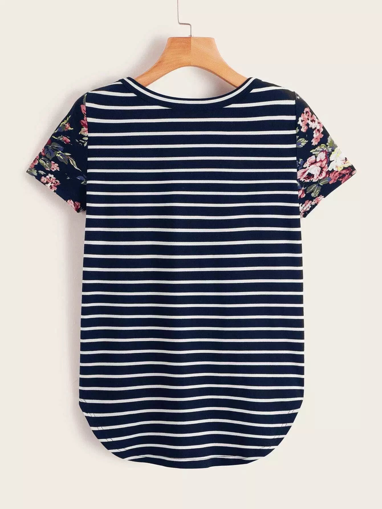 تي شيرت بحافة مقوّس مخطط ومزخرف بالزهور