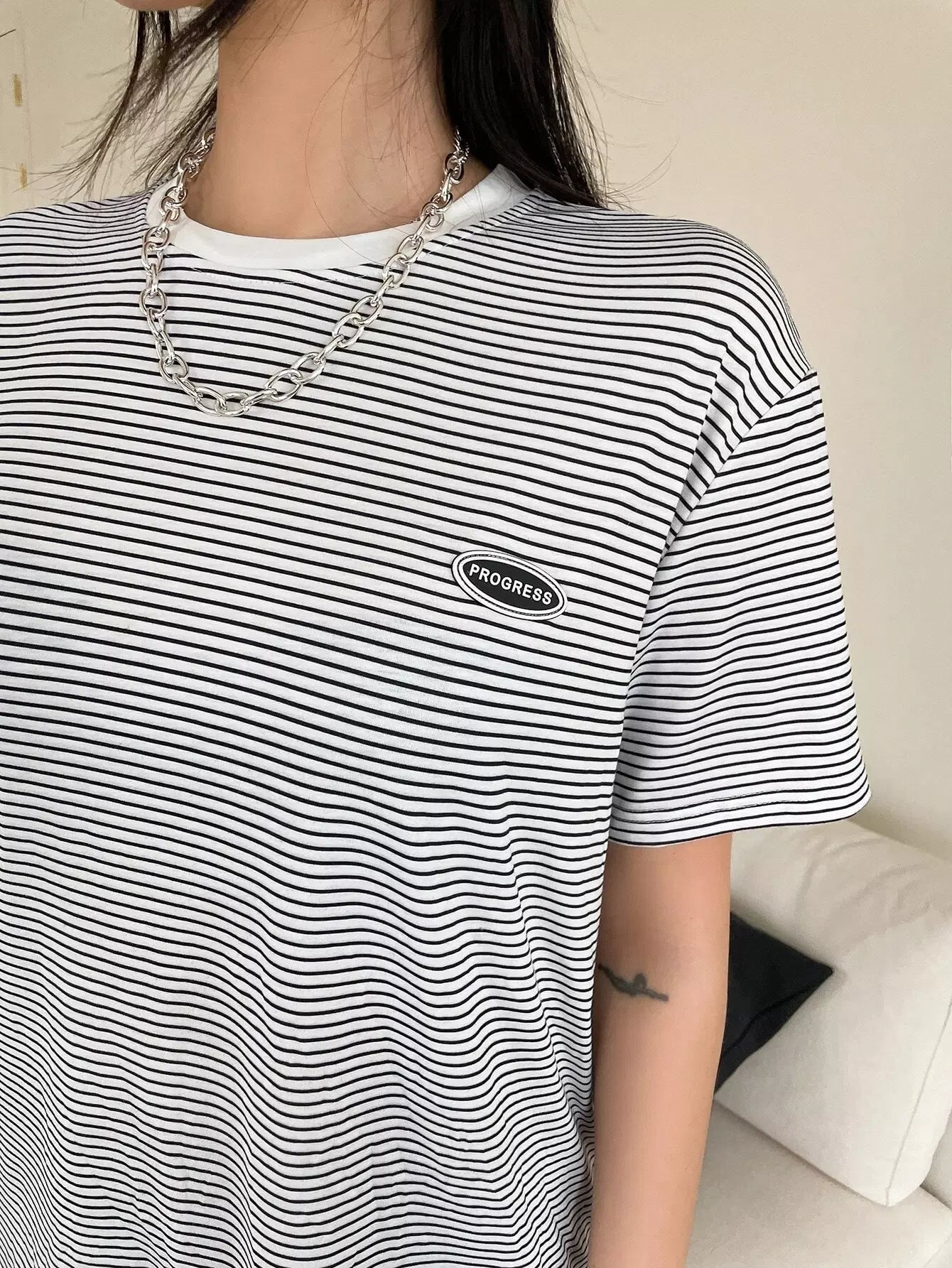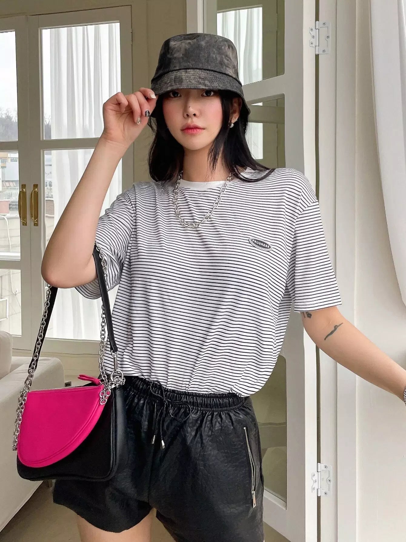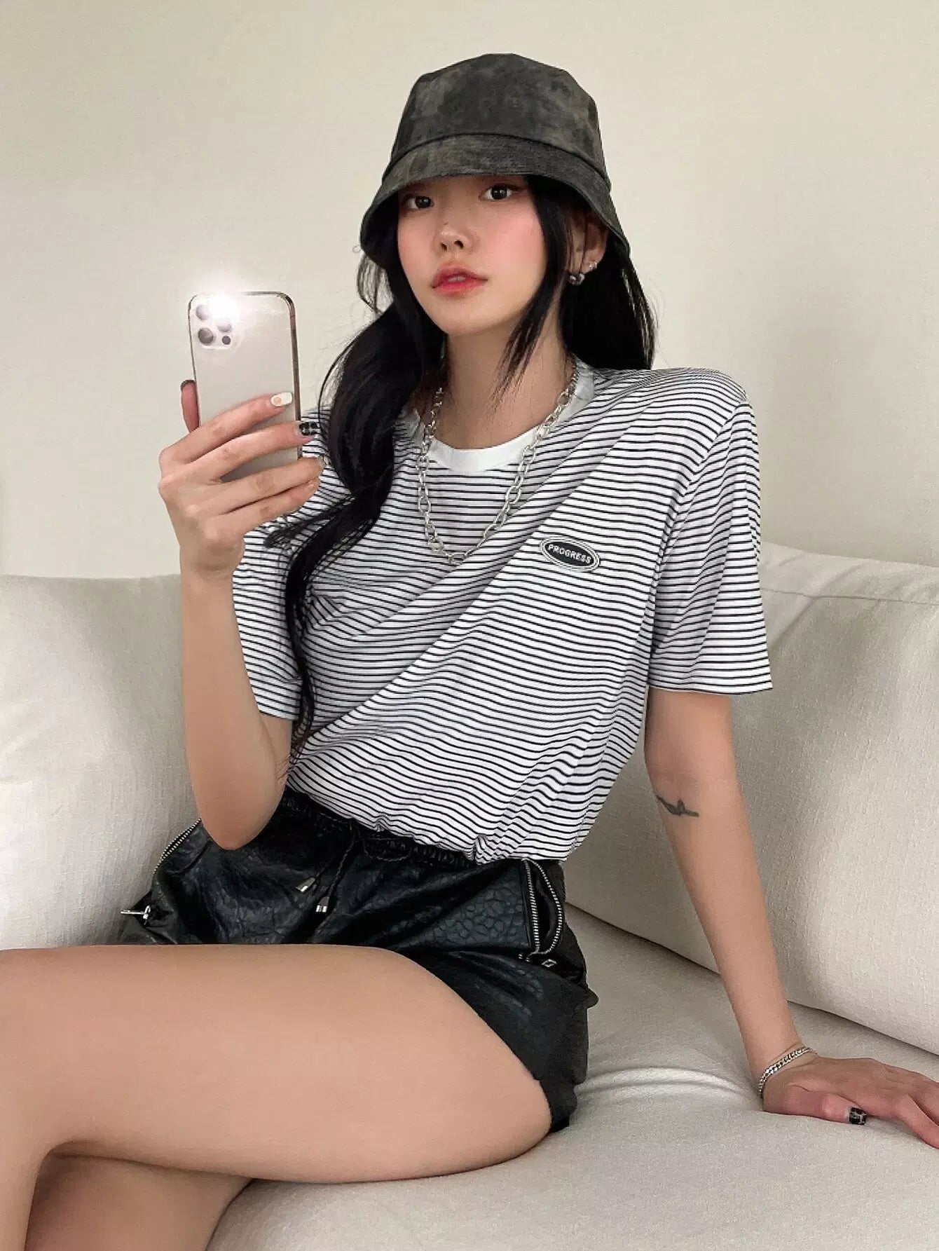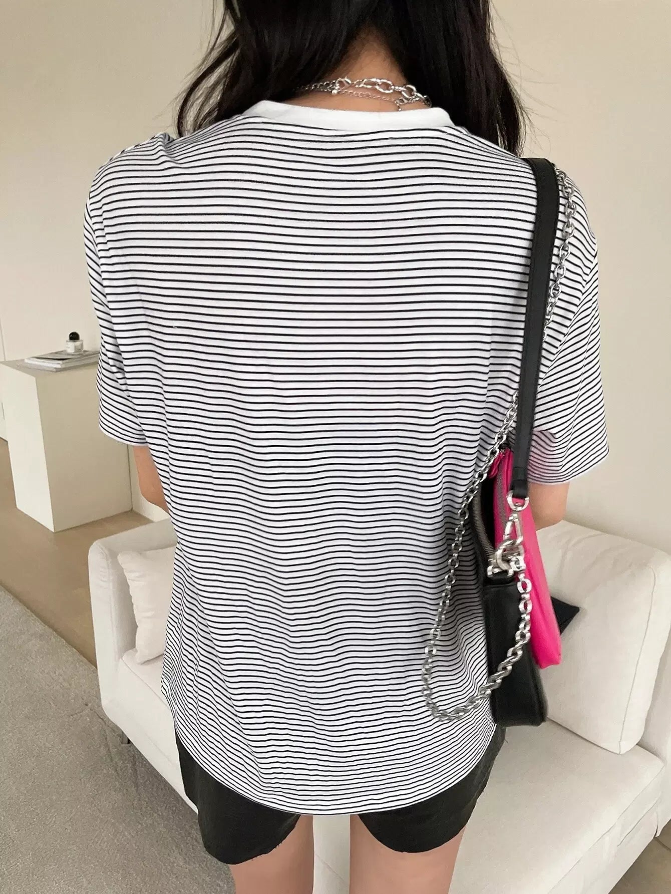 تي شيرت بأكتاف منسدلة مرقع بحروف مخططة