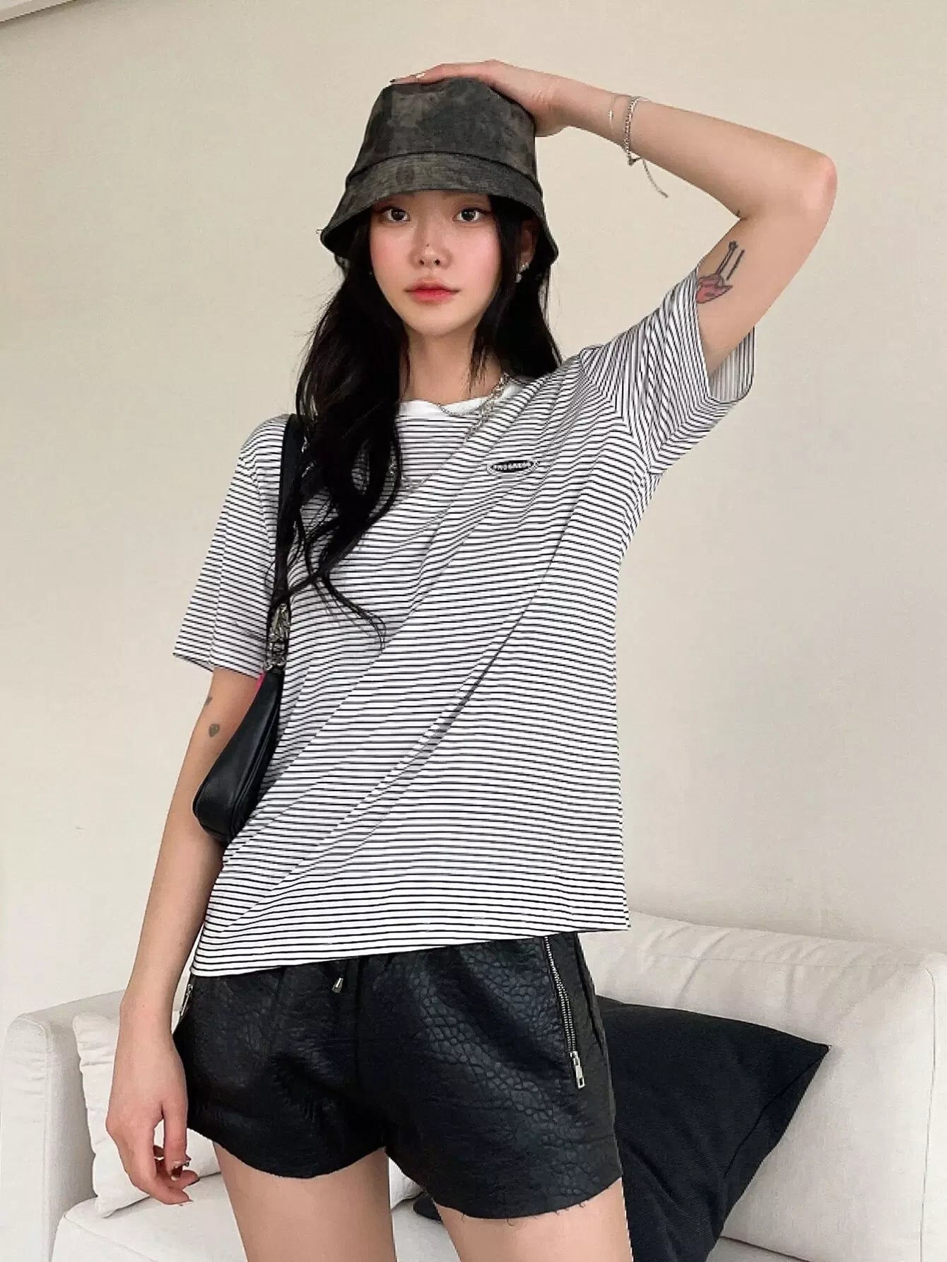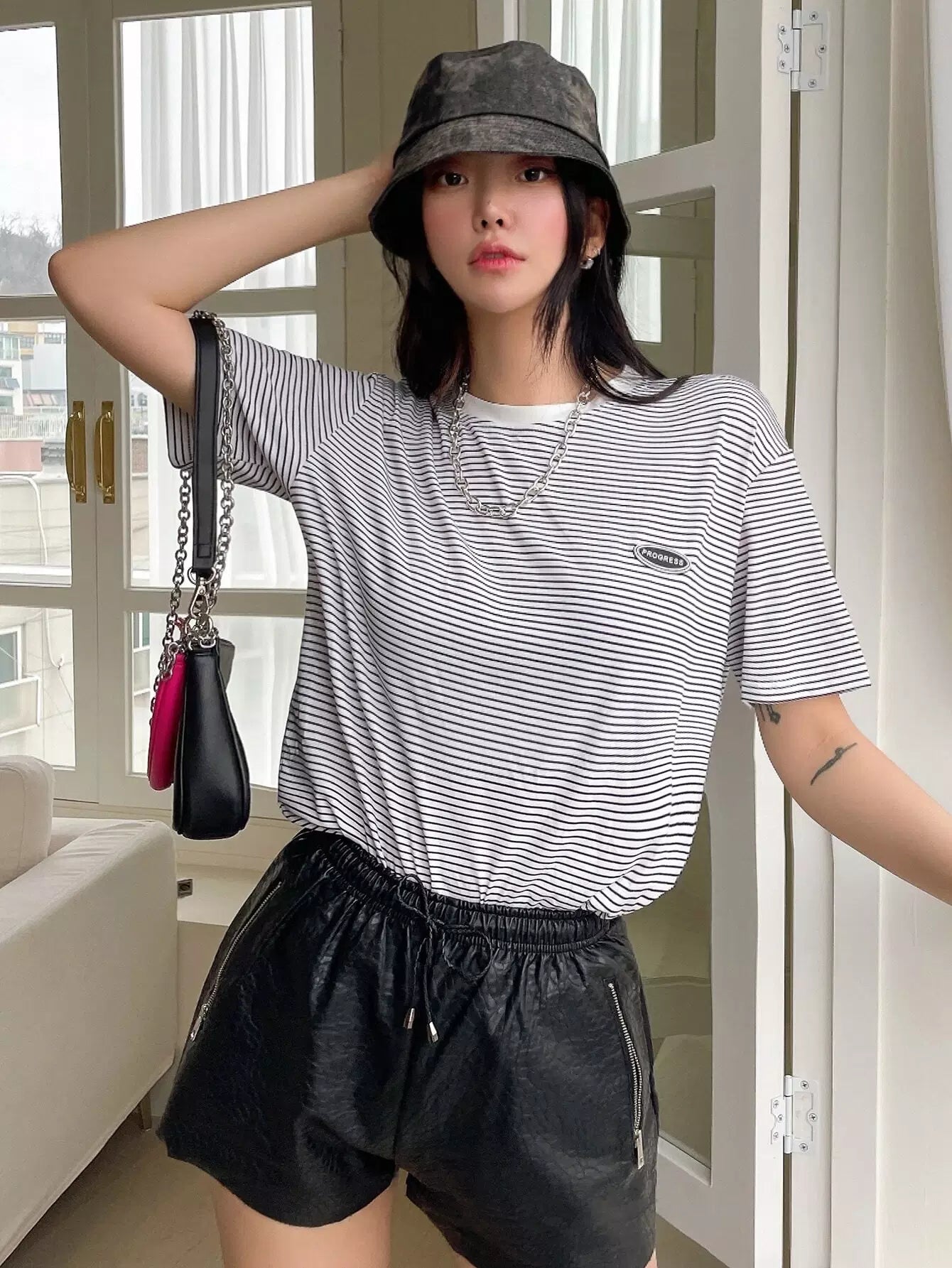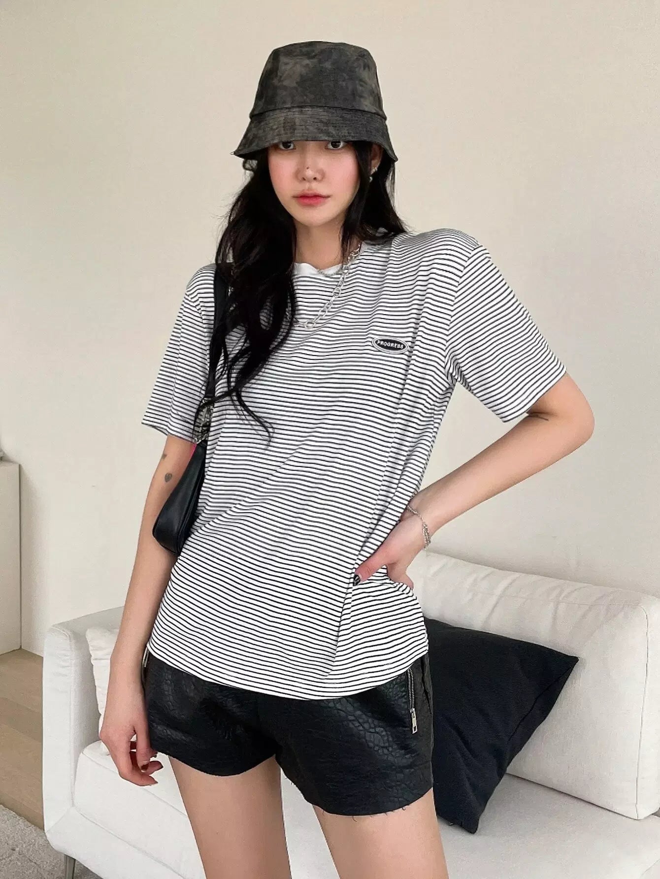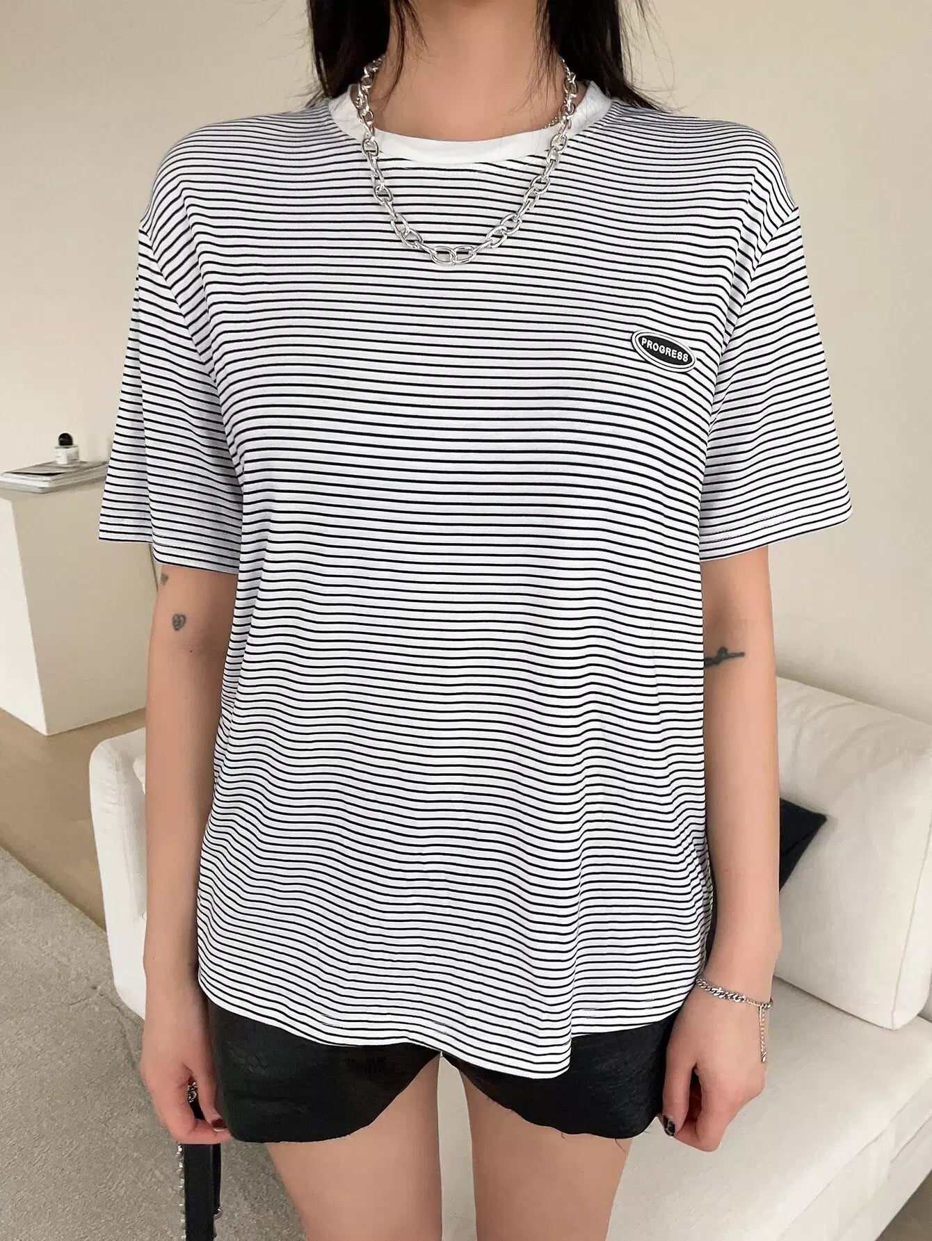 تي شيرت بأكتاف منسدلة مرقع بحروف مخططة