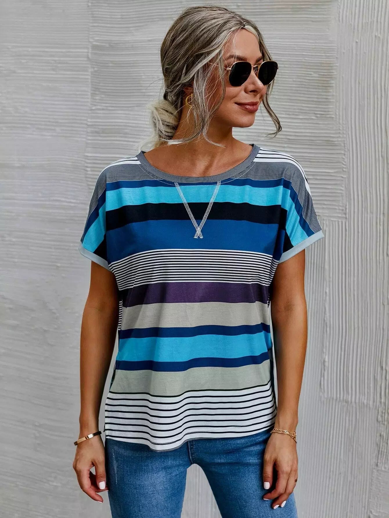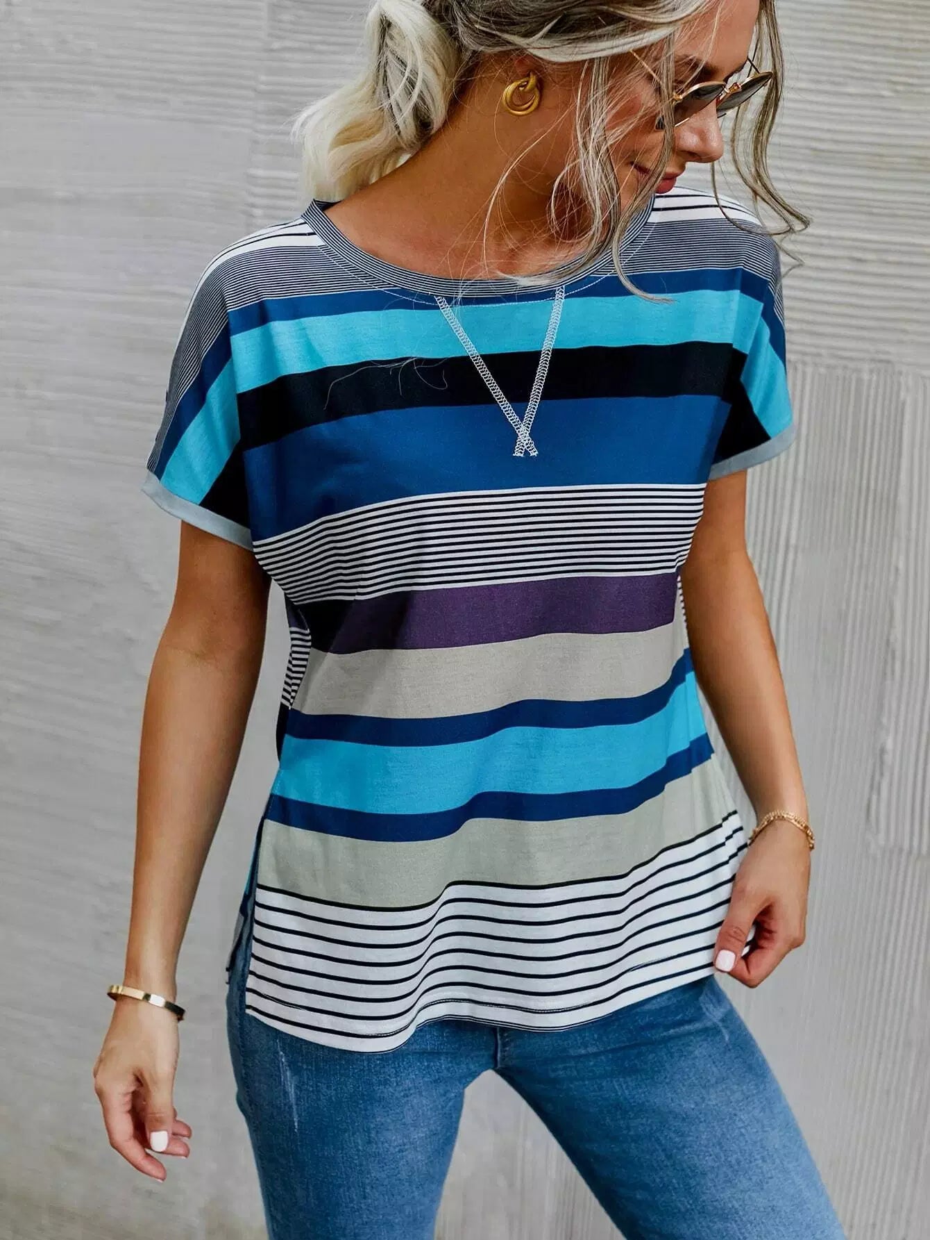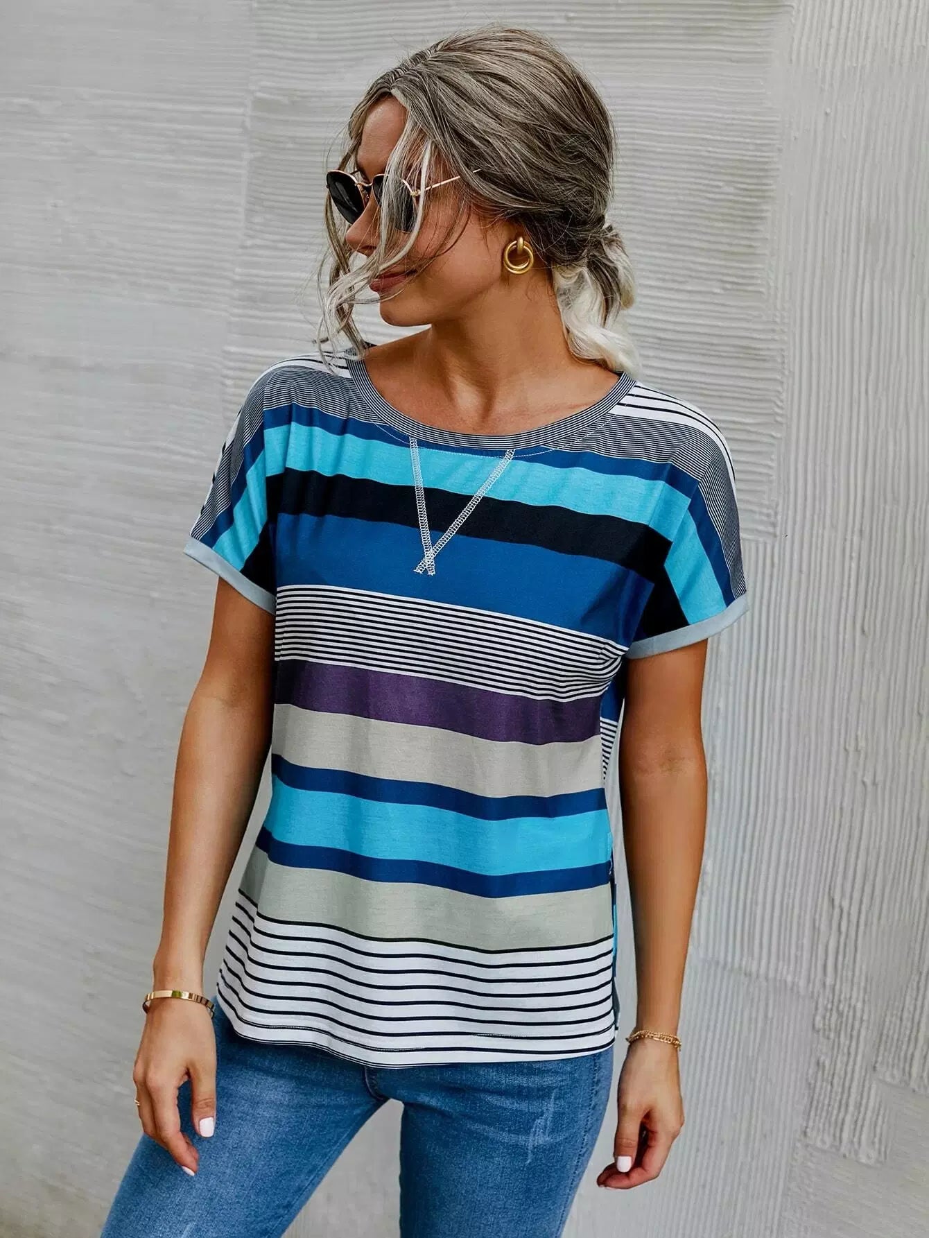 تي شيرت مخطط بأكمام أجنحة الخفاش وحاشية مقسمة