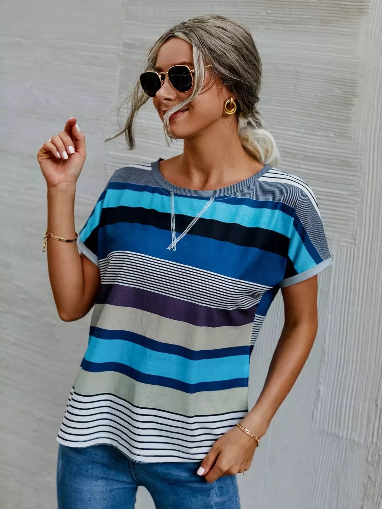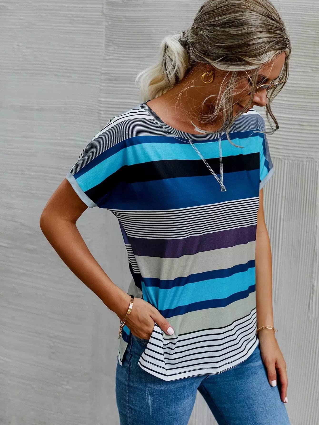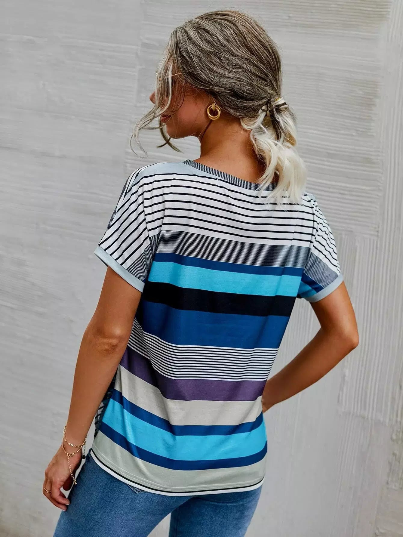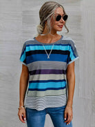 تي شيرت مخطط بأكمام أجنحة الخفاش وحاشية مقسمة