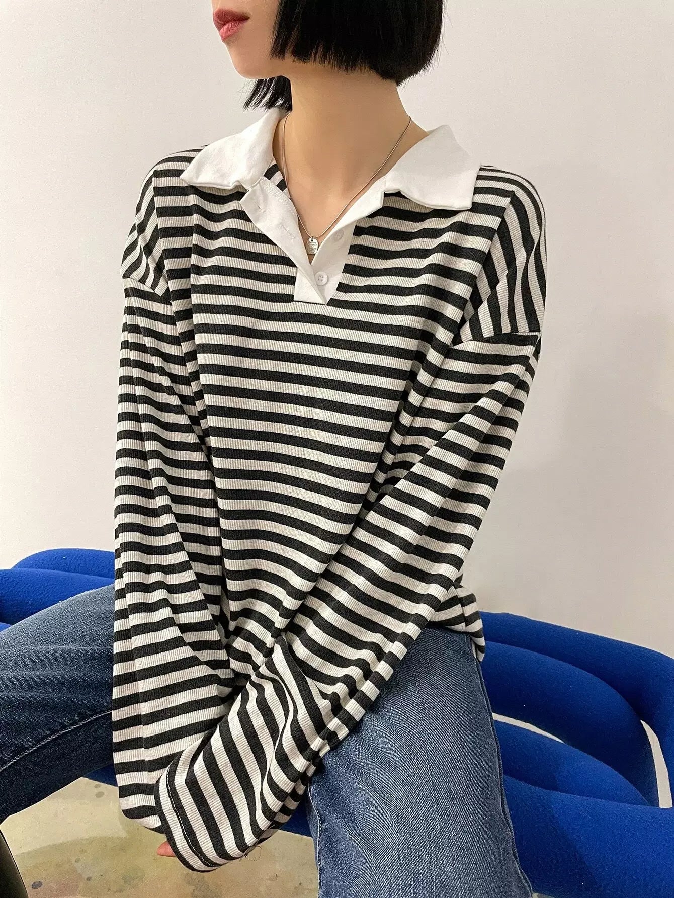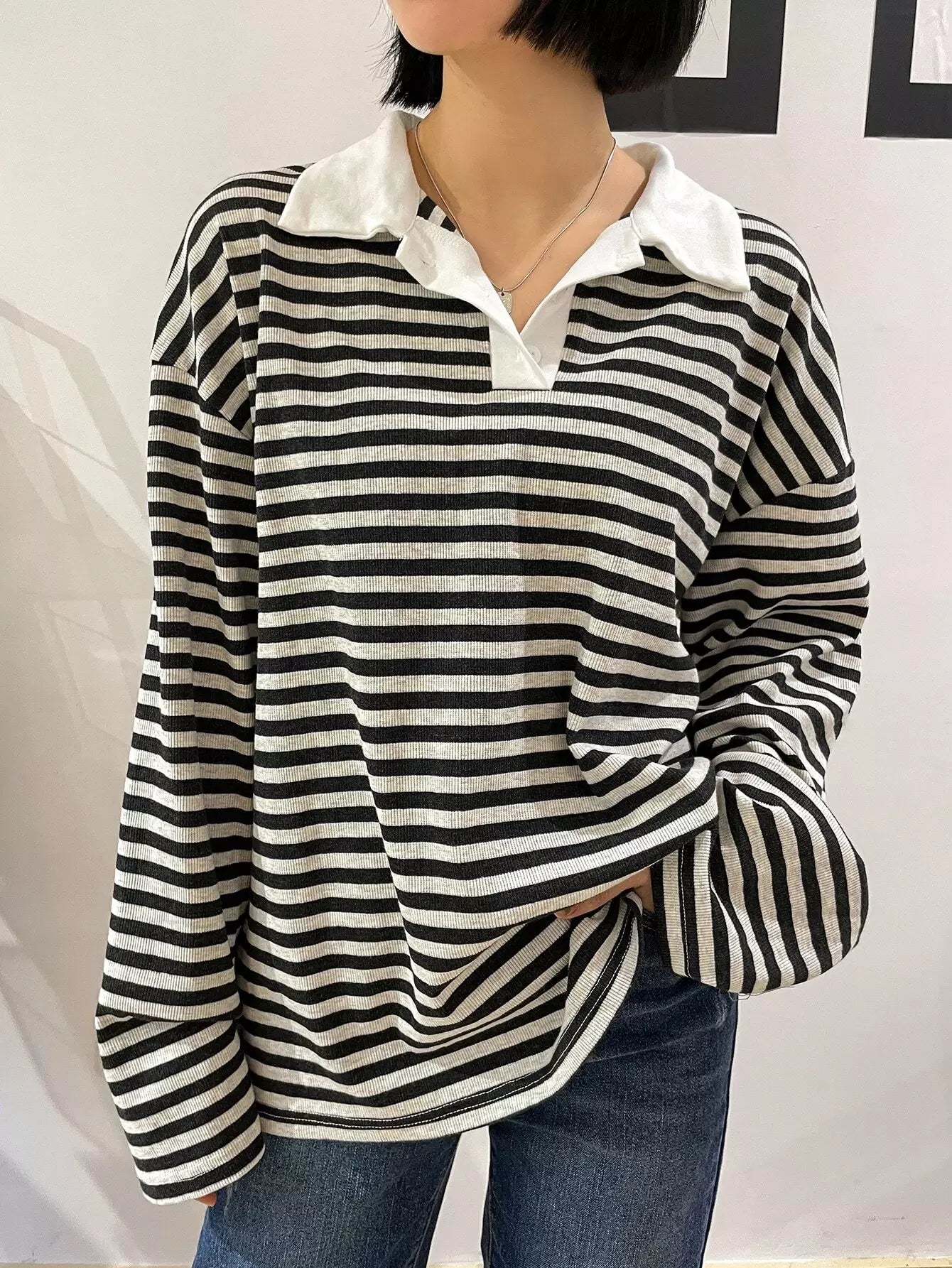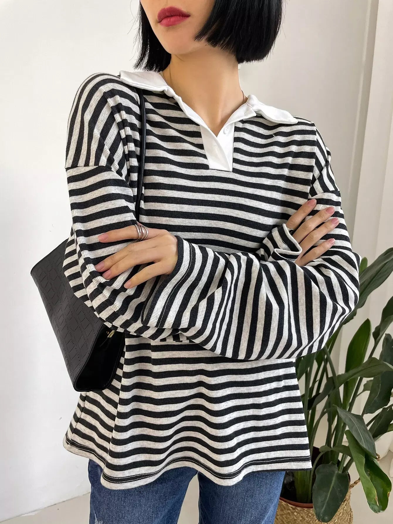 تي شيرت بولو برقبة مخططة بطبعة متباينة منسدلة الكتفين