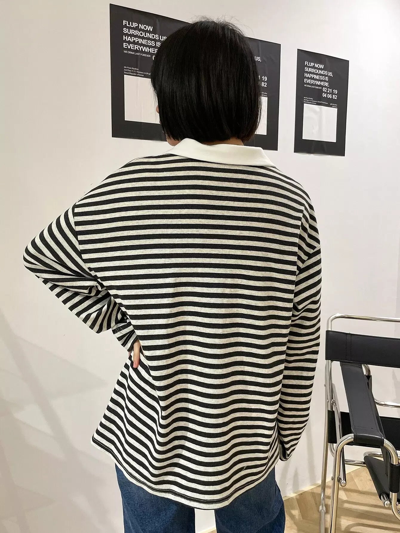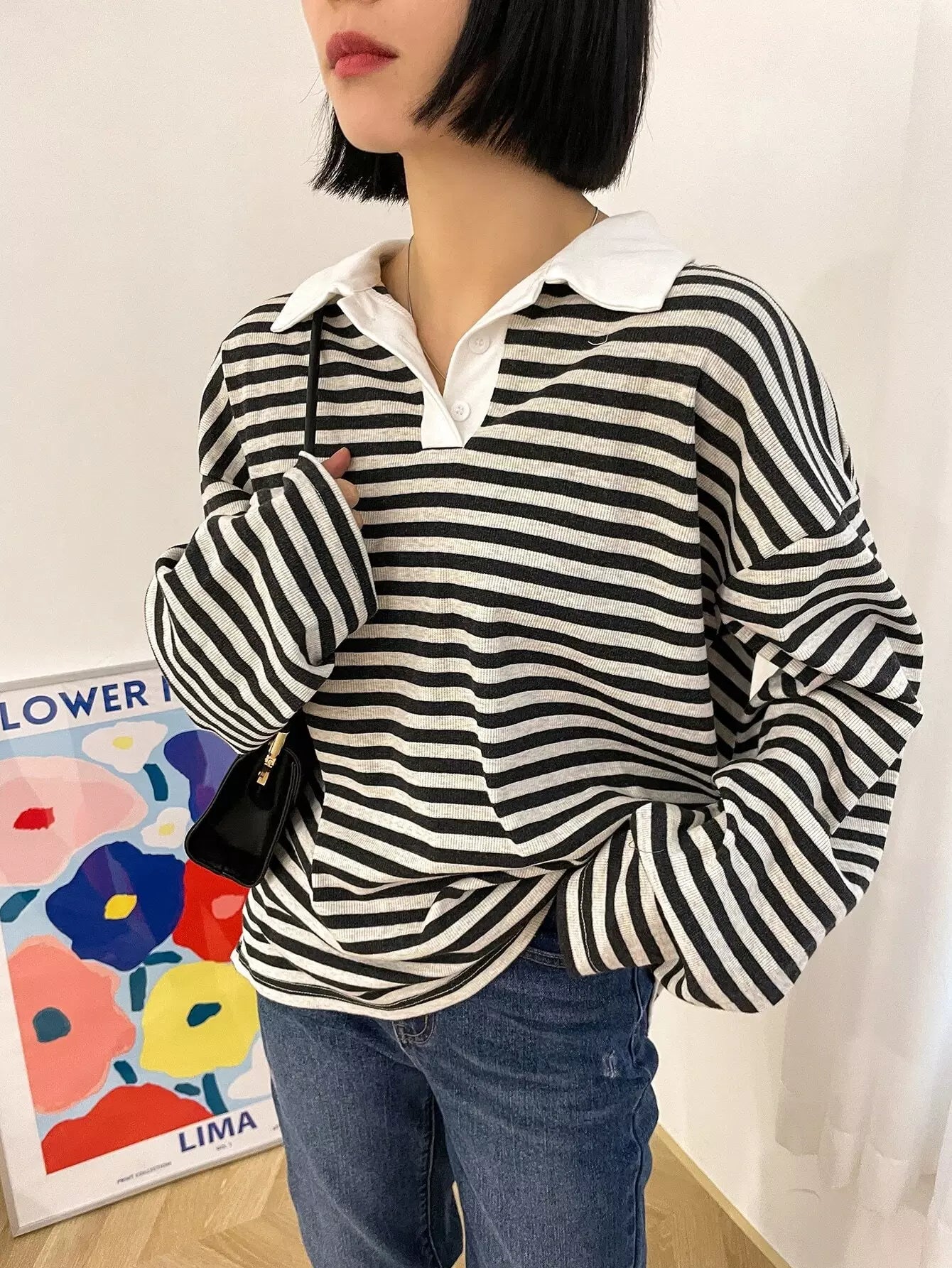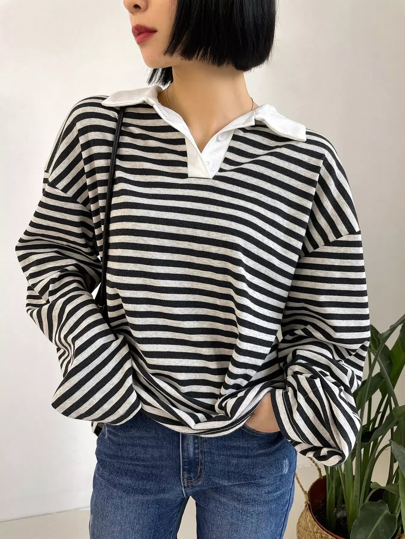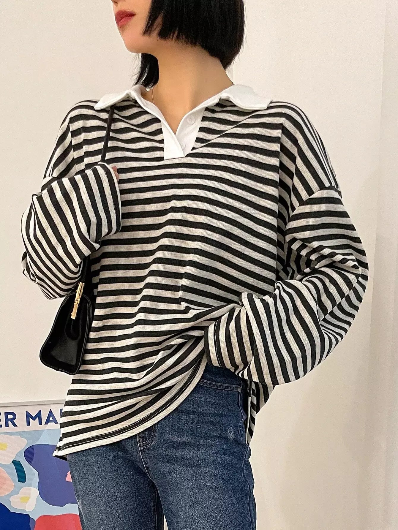 تي شيرت بولو برقبة مخططة بطبعة متباينة منسدلة الكتفين