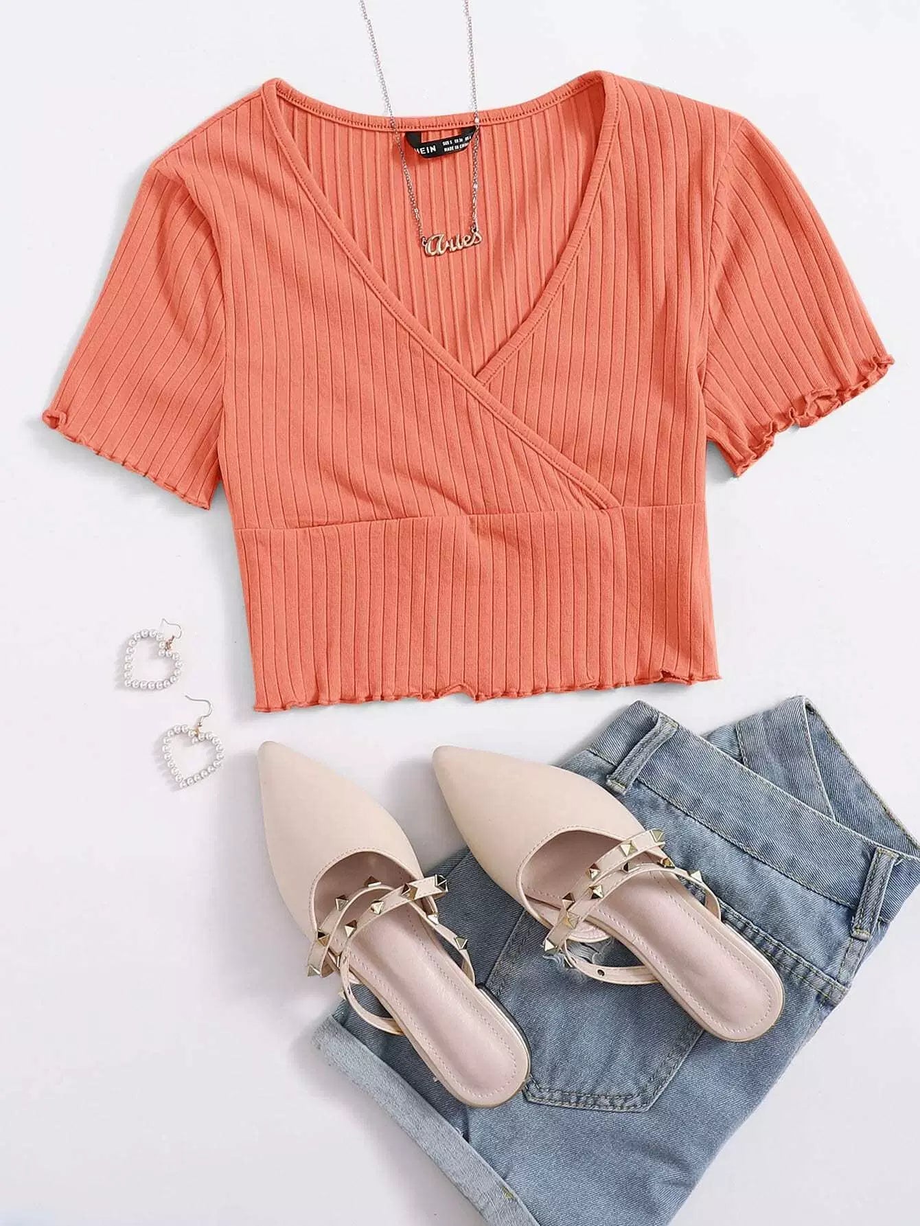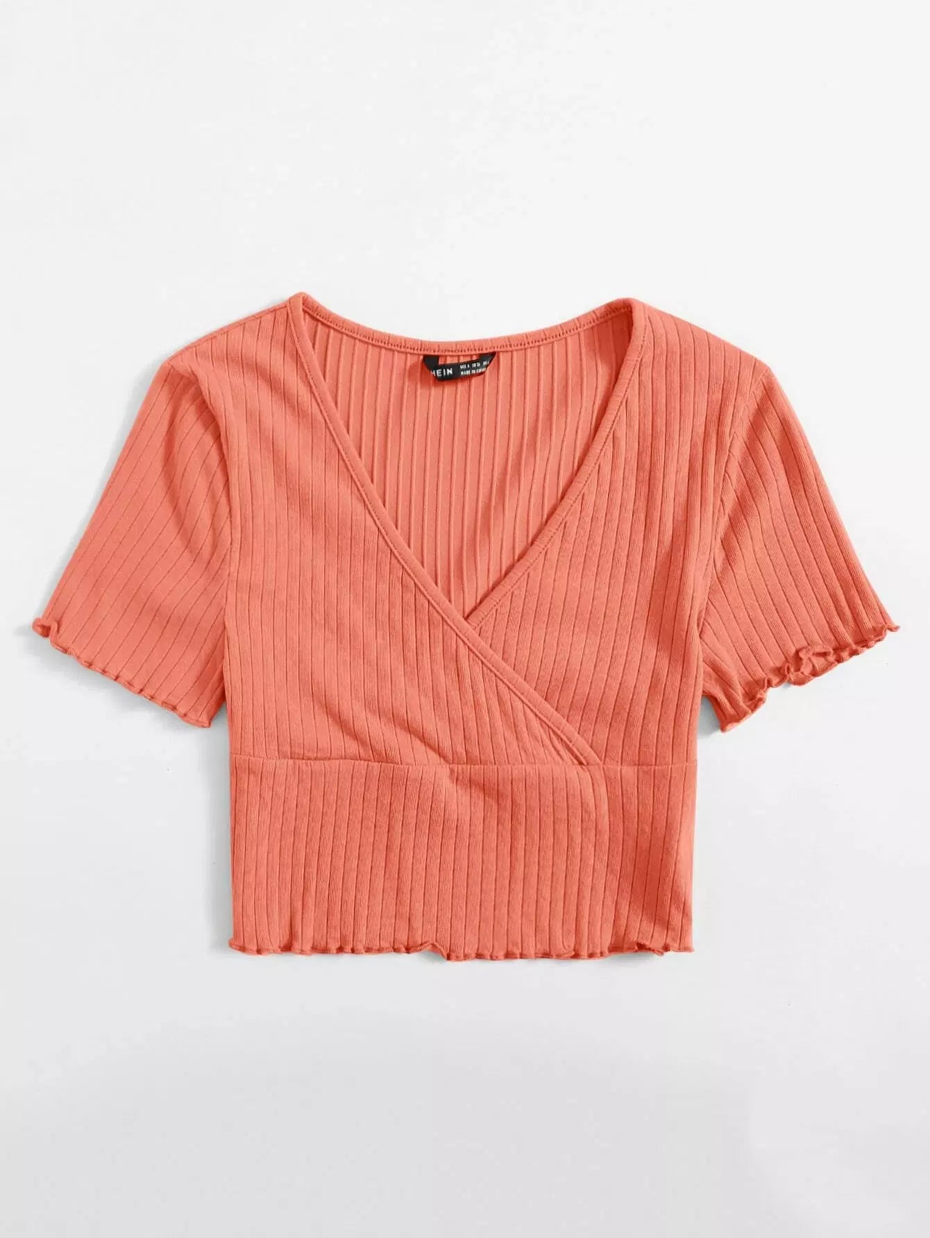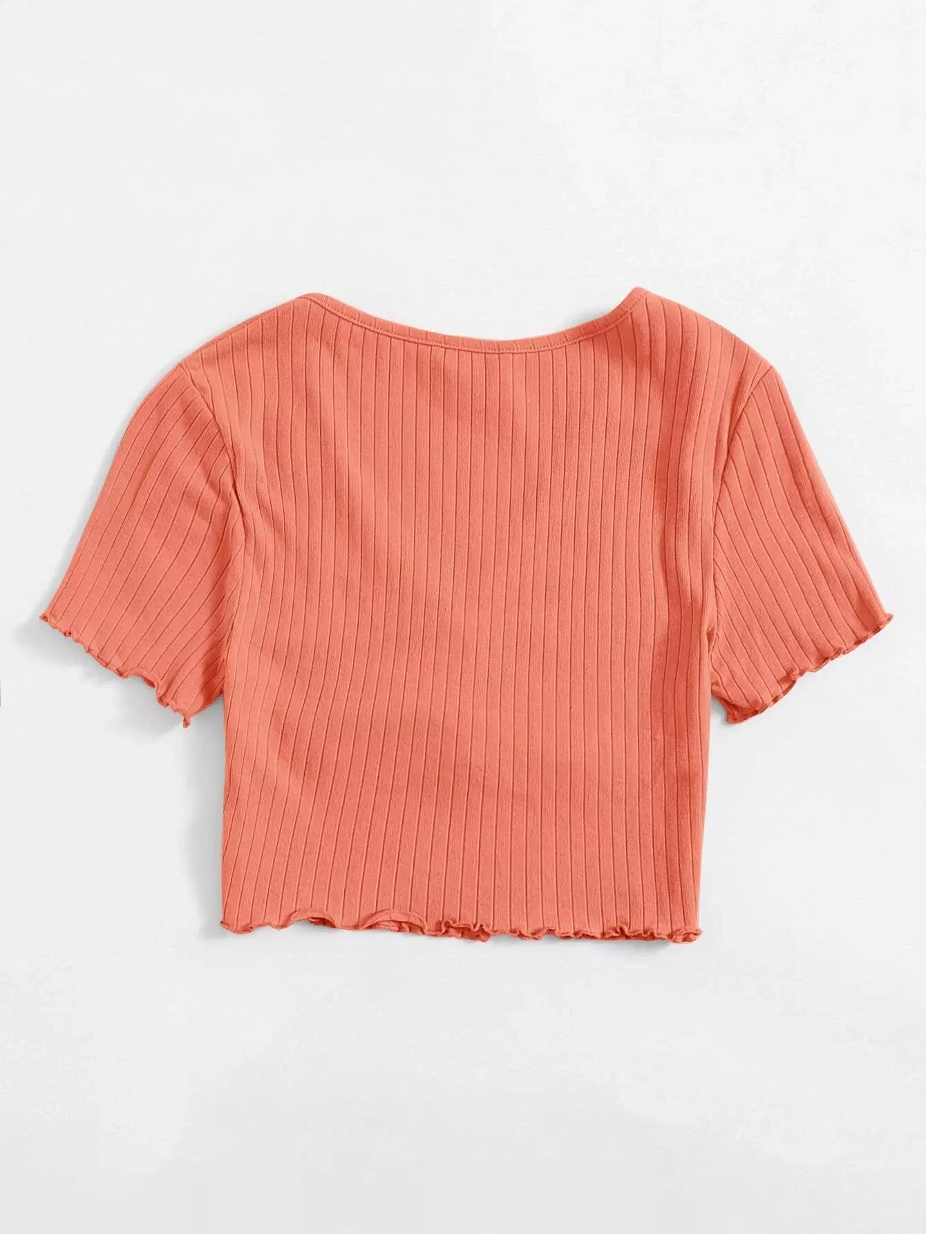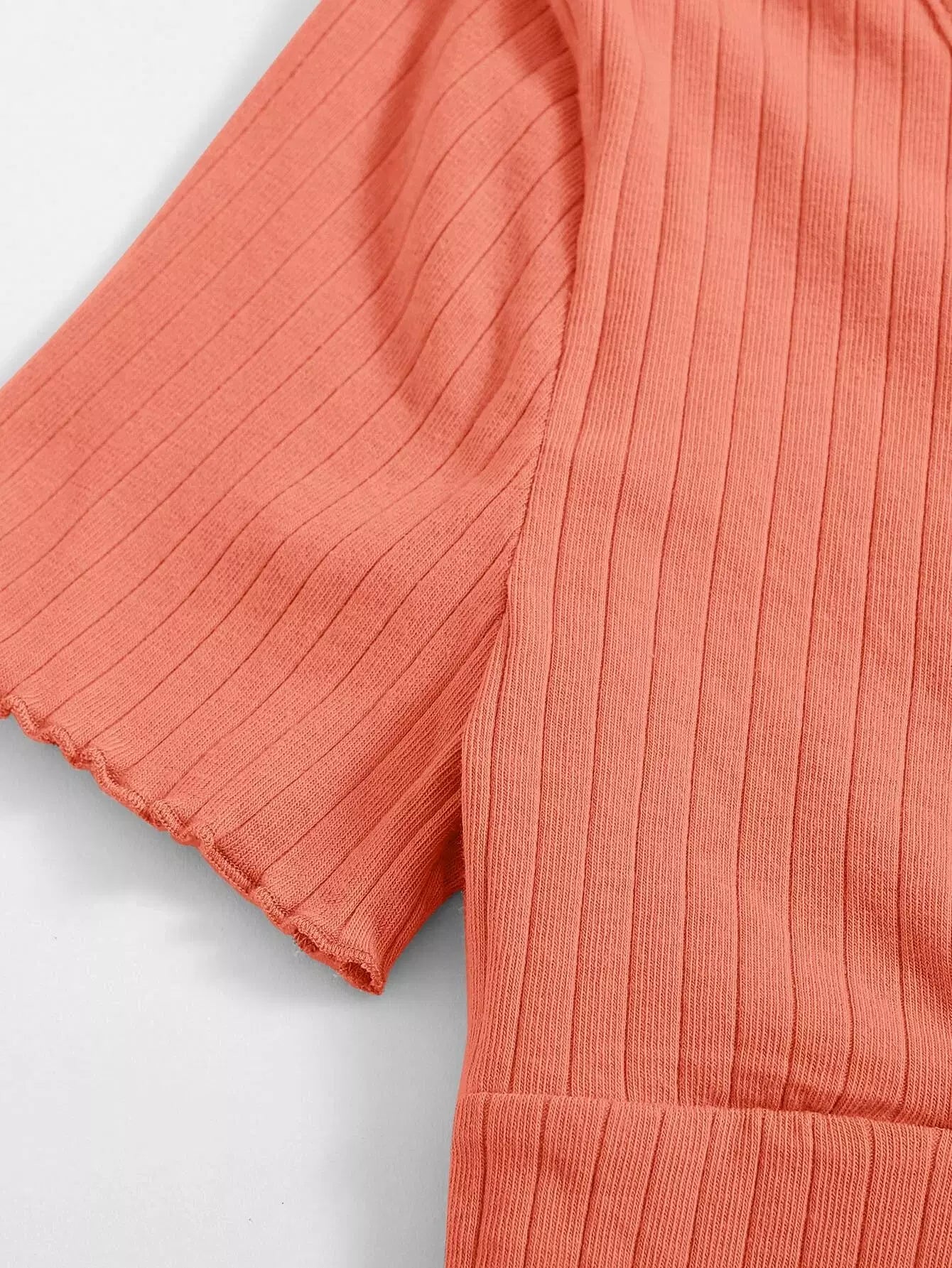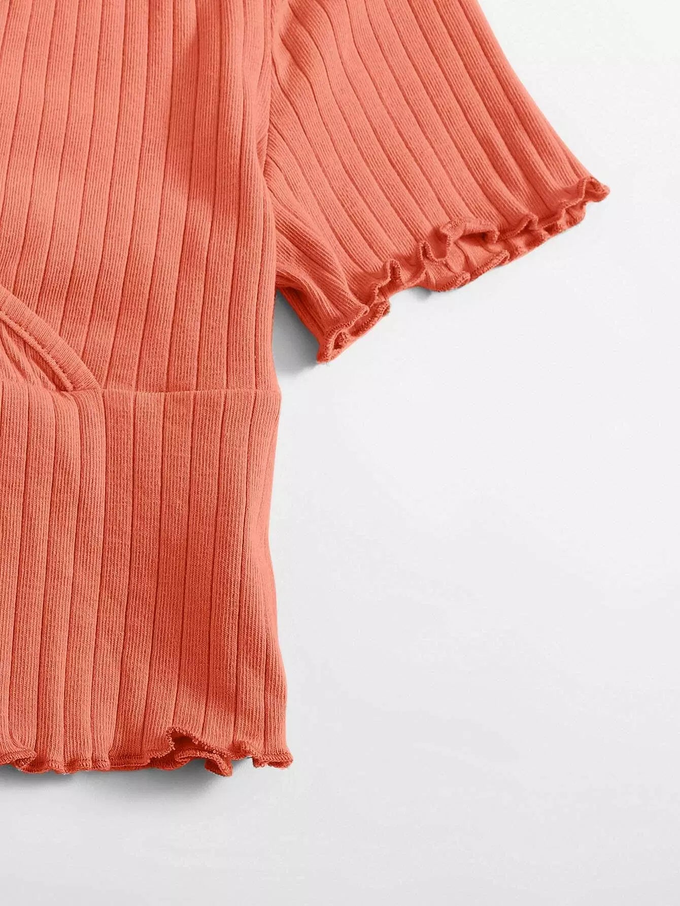 تي شيرت برقبة ضلع محبوكة بقصّة سادة برقبة ضلع
