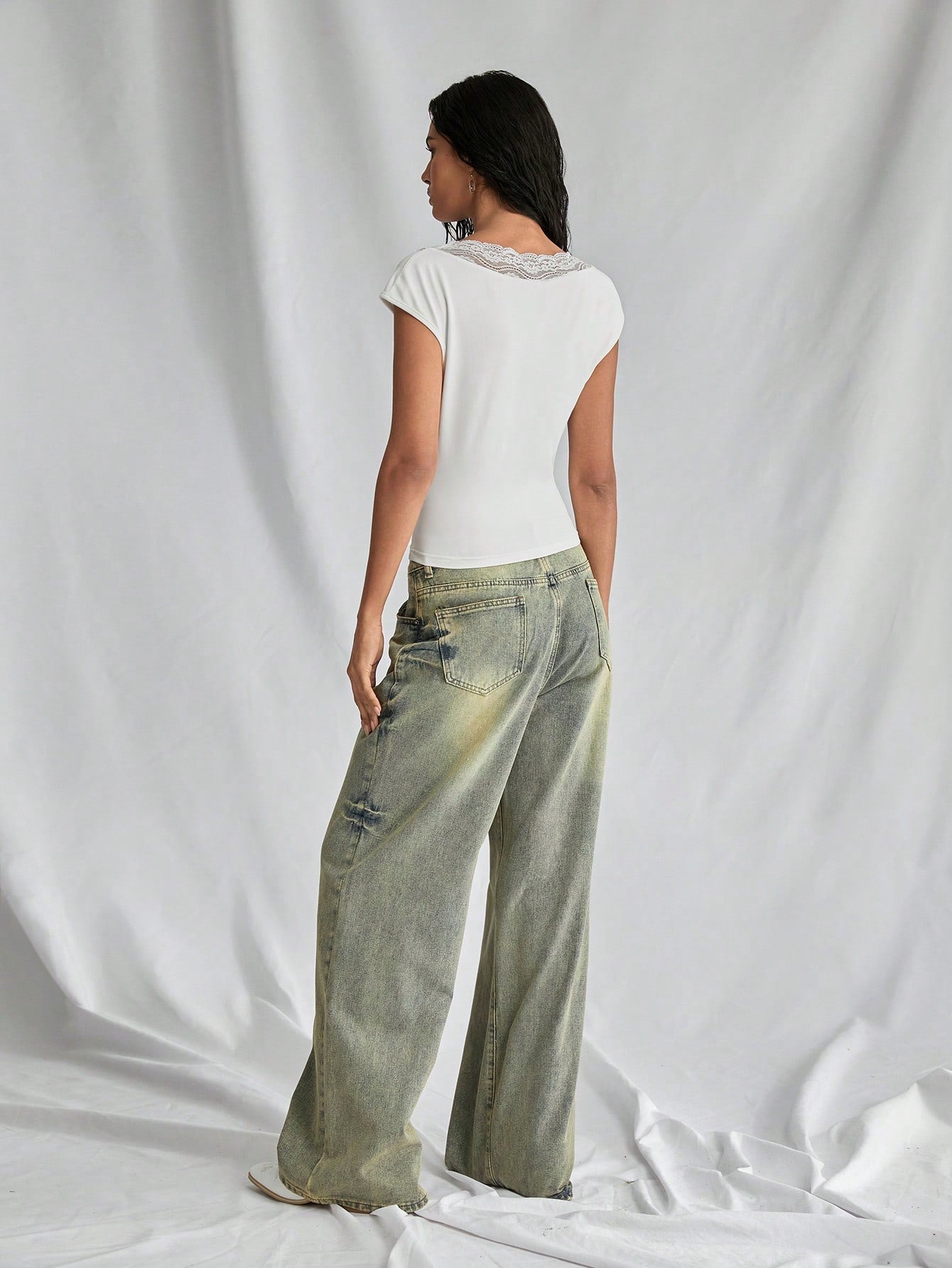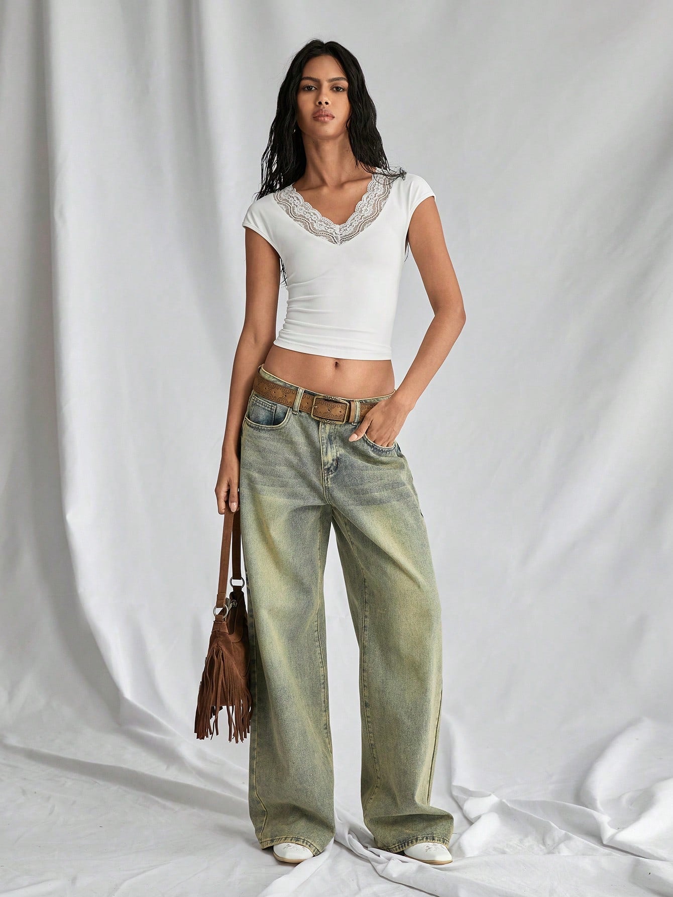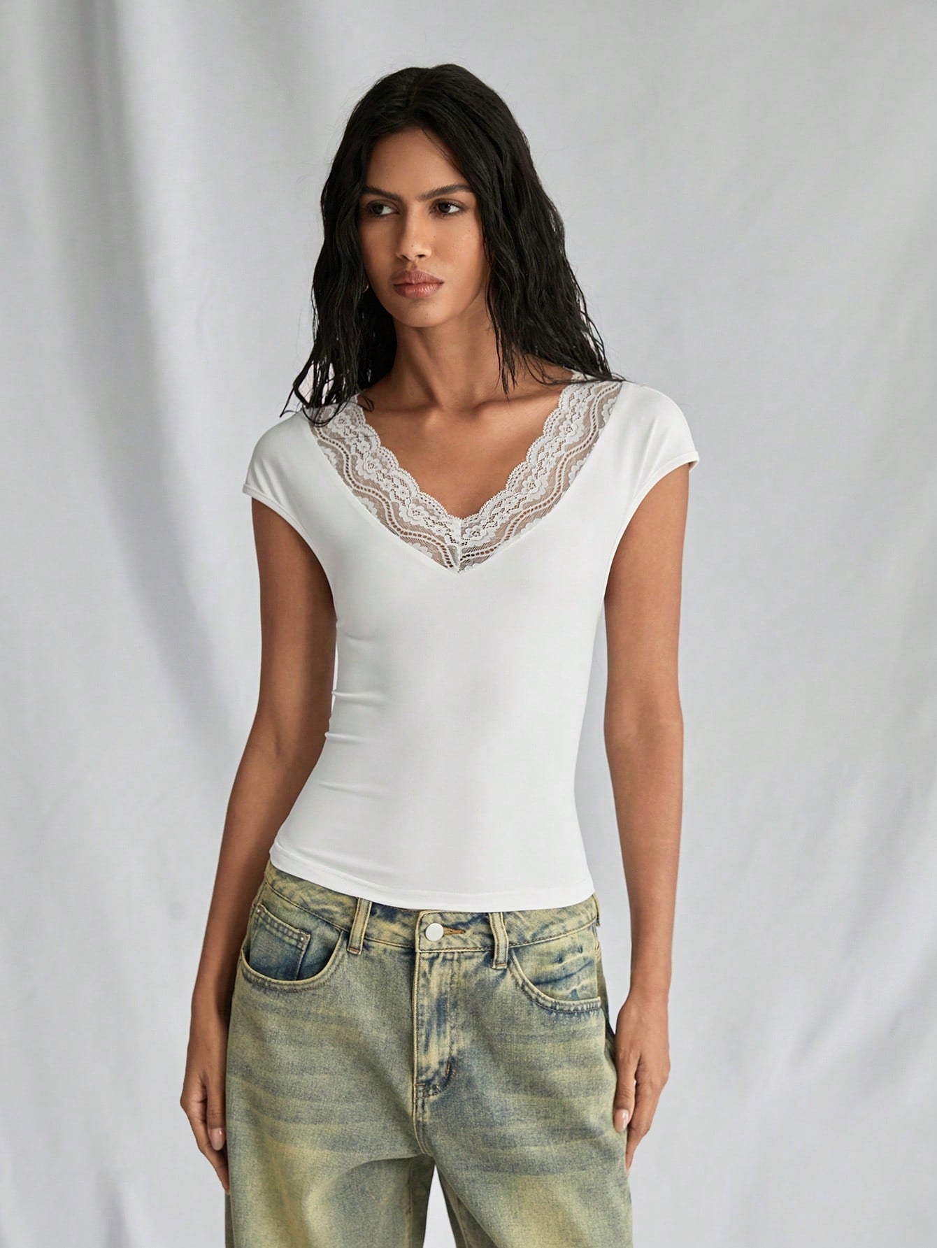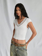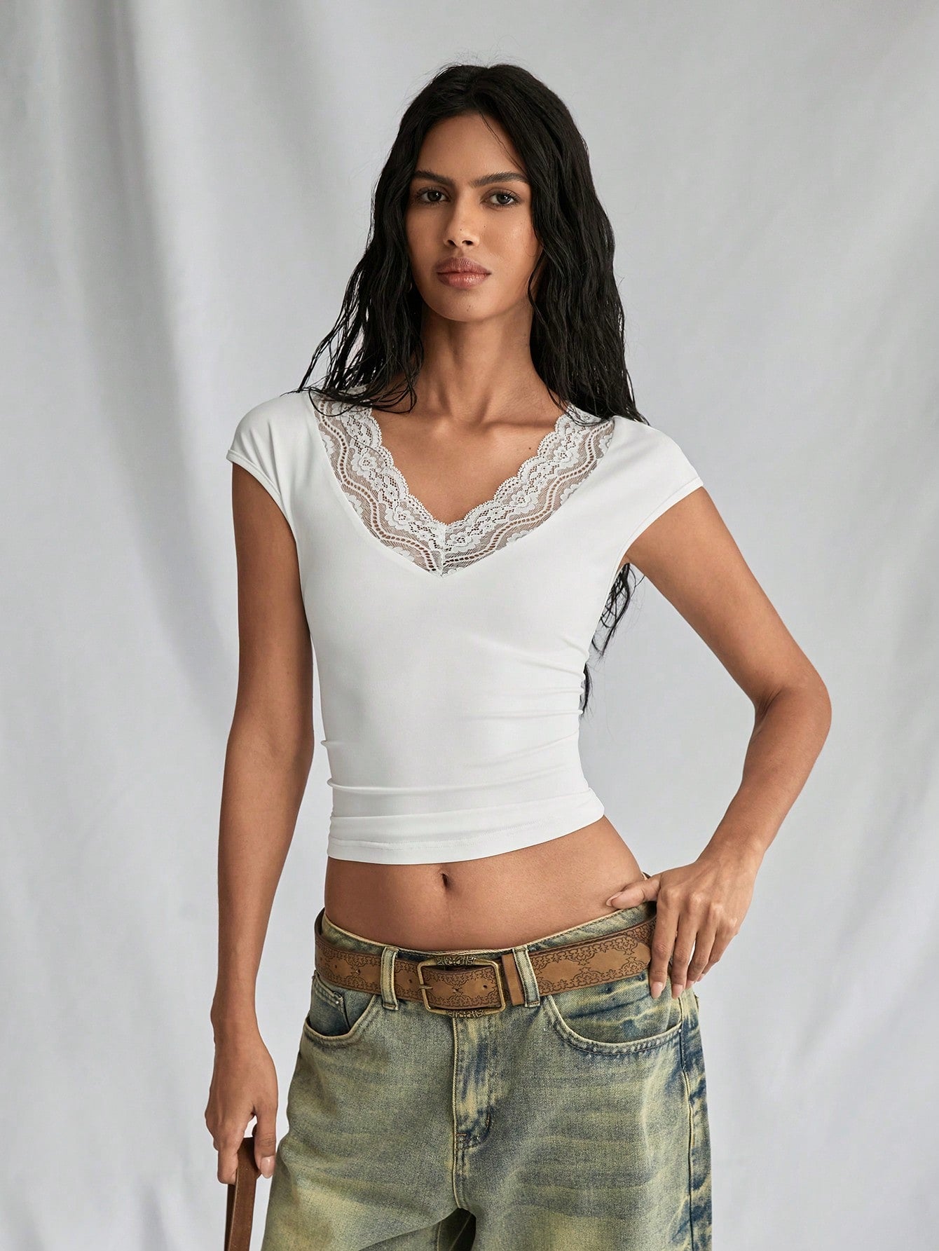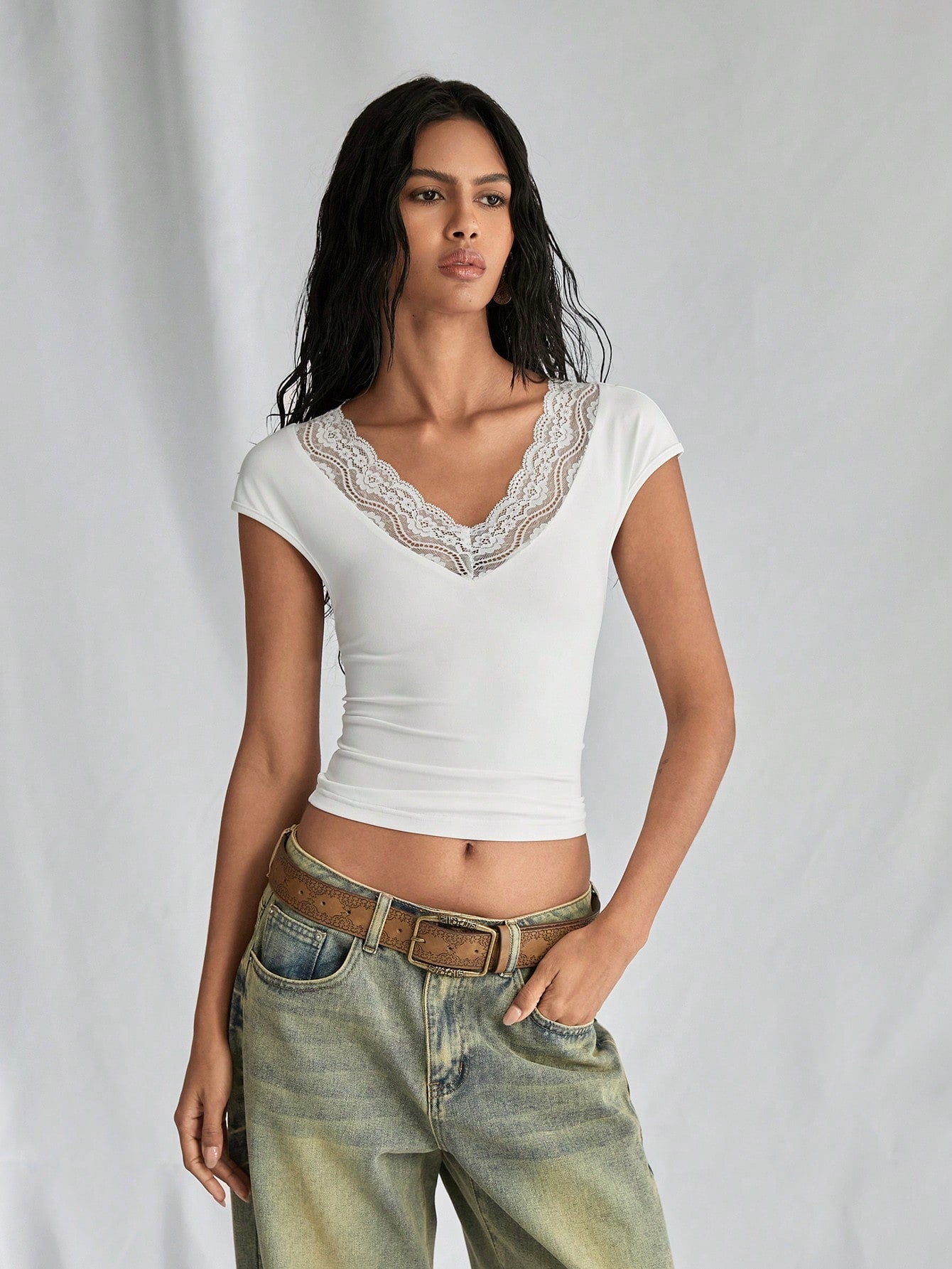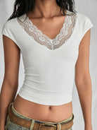 TRNVIE 1pc Women's White Lace V-Neck Short Sleeve Bodycon Boho Style T-Shirt