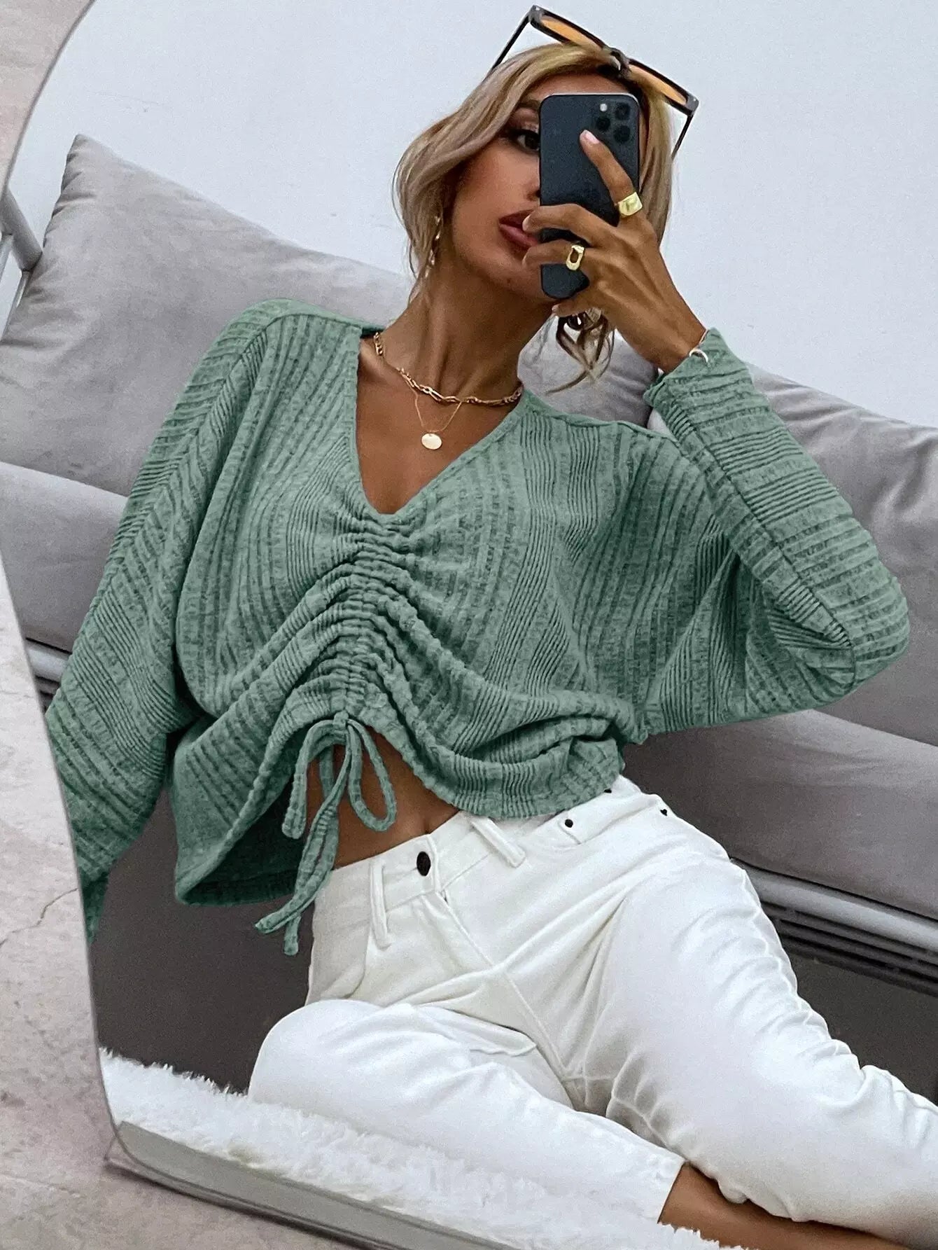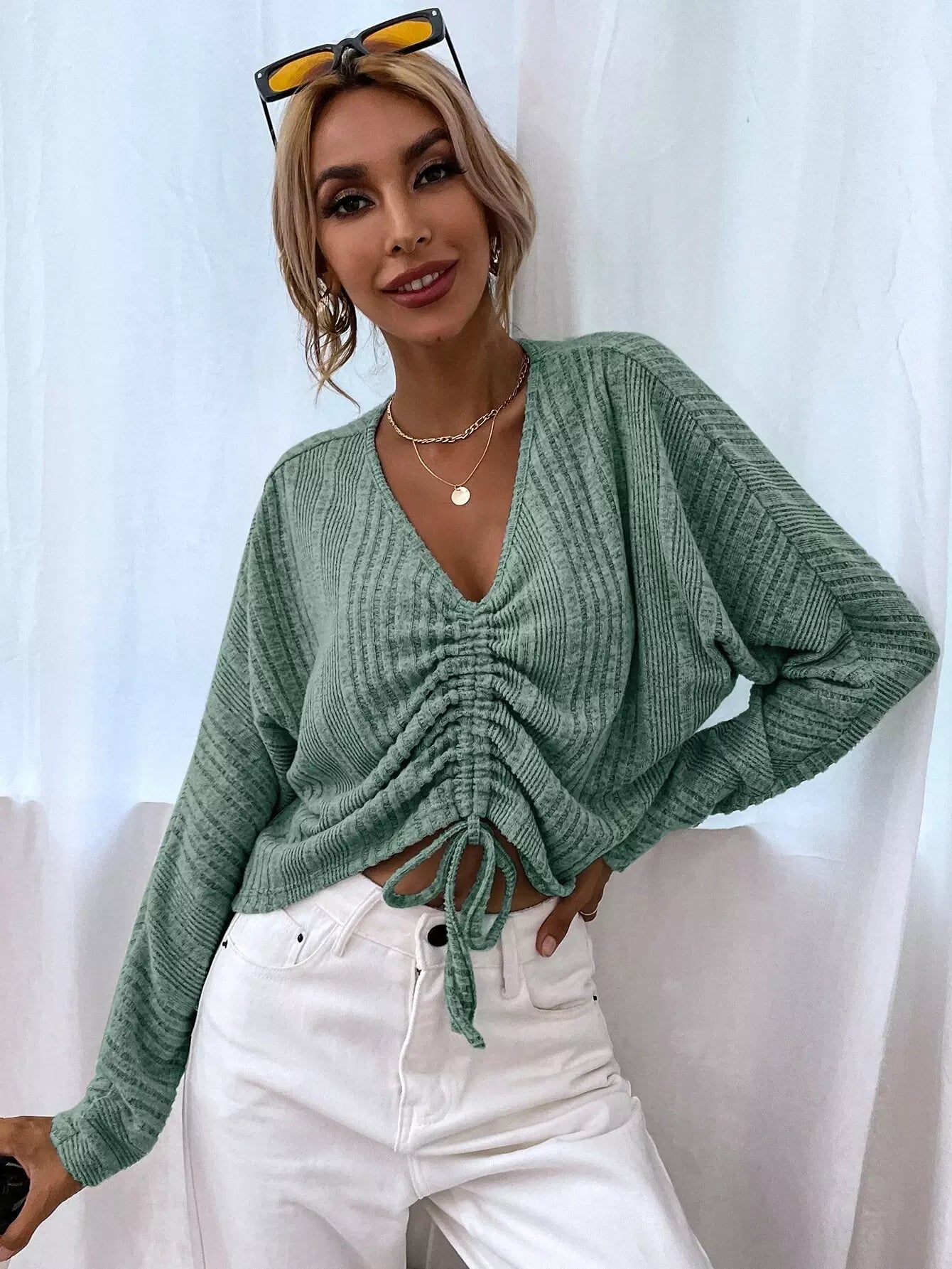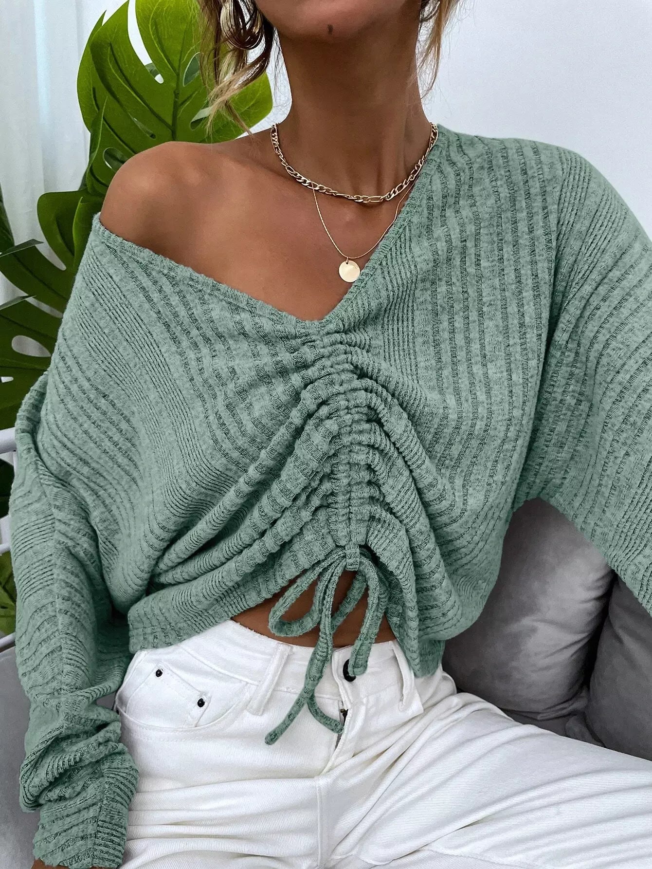 تي شيرت بأكمام على شكل V برقبة على شكل باتوينغ بأربطة