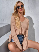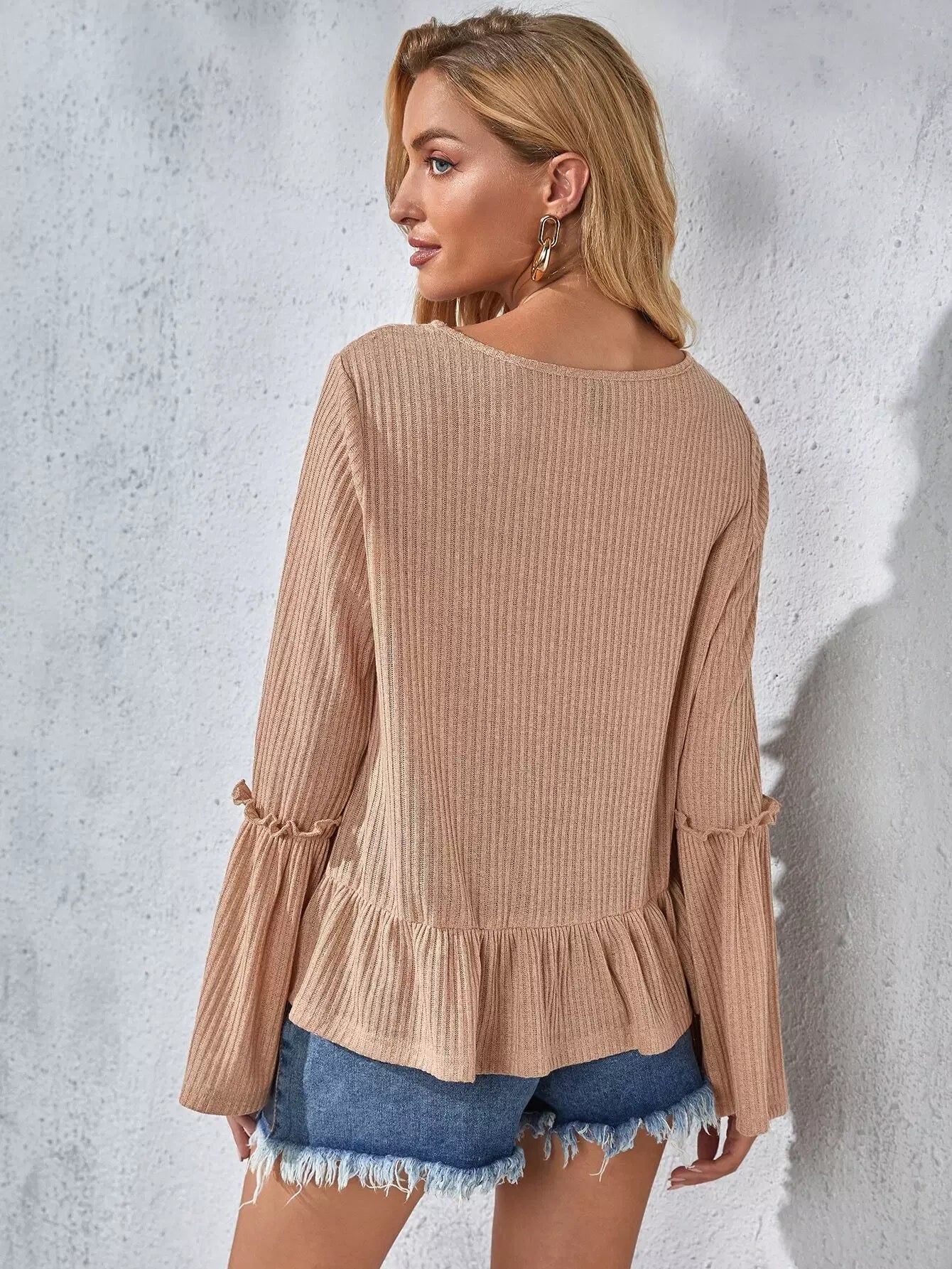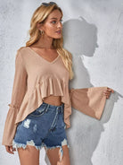 بلوزة بأكمام كشكش غير متناسقة على شكل حرف V بياقة على شكل حرف V