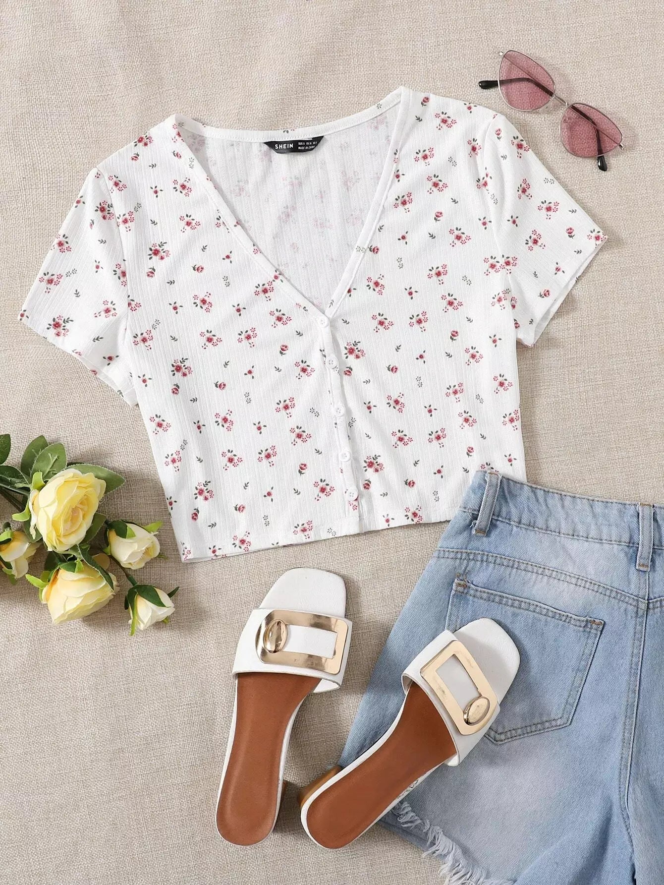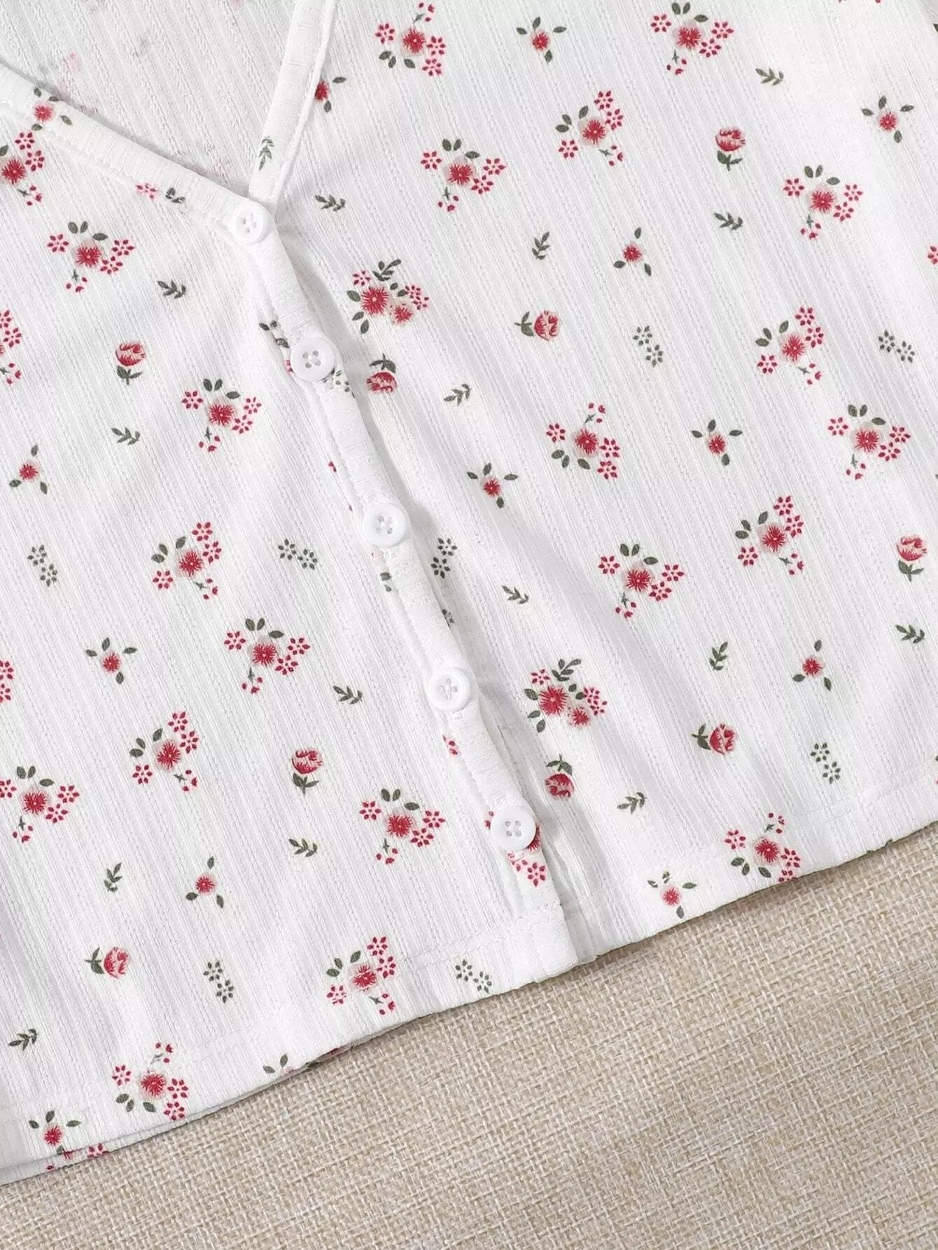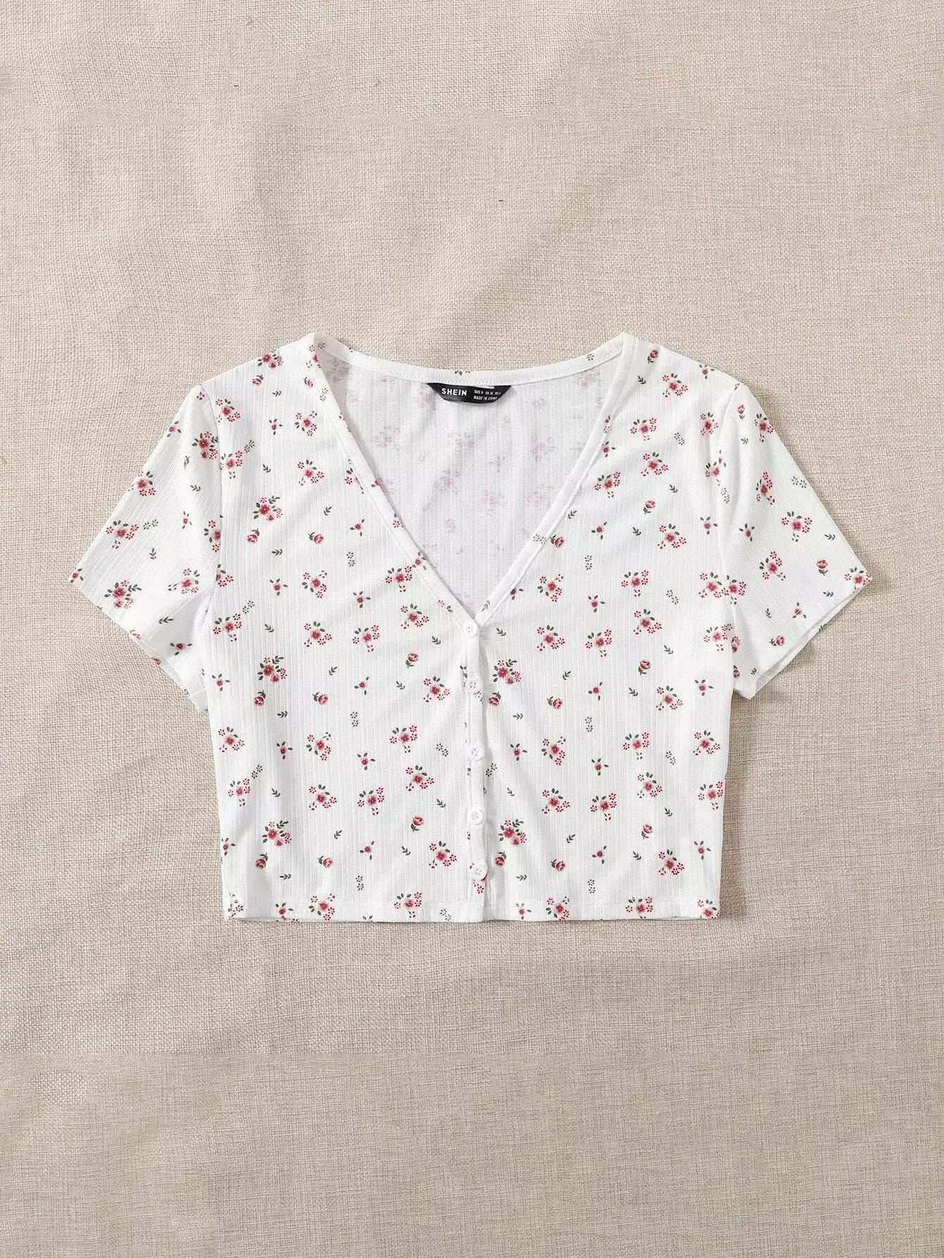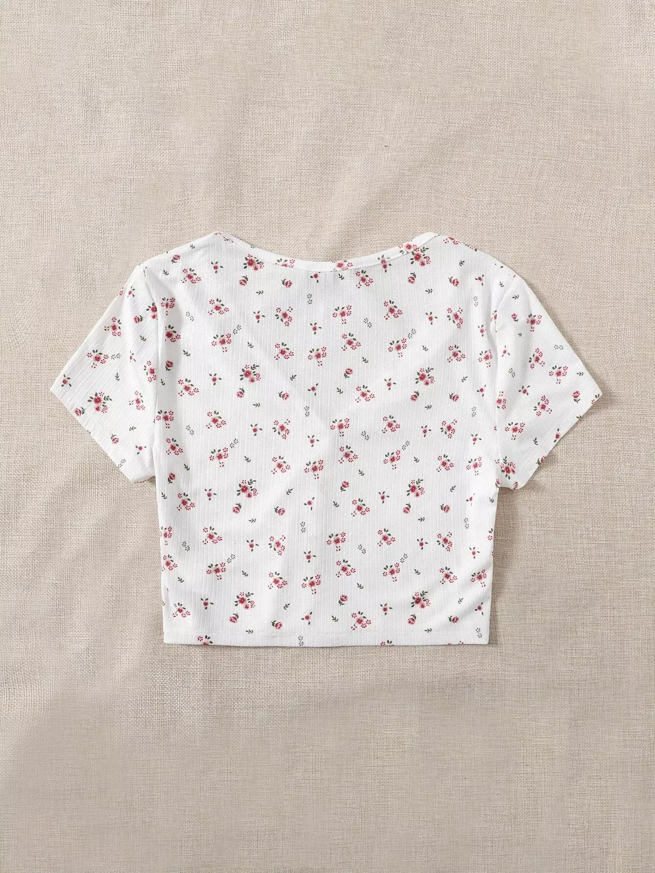 تي شيرت قصير مزين بنقشة زهور صغيرة وفتحة رقبة على شكل حرف V وأزرار أمامية