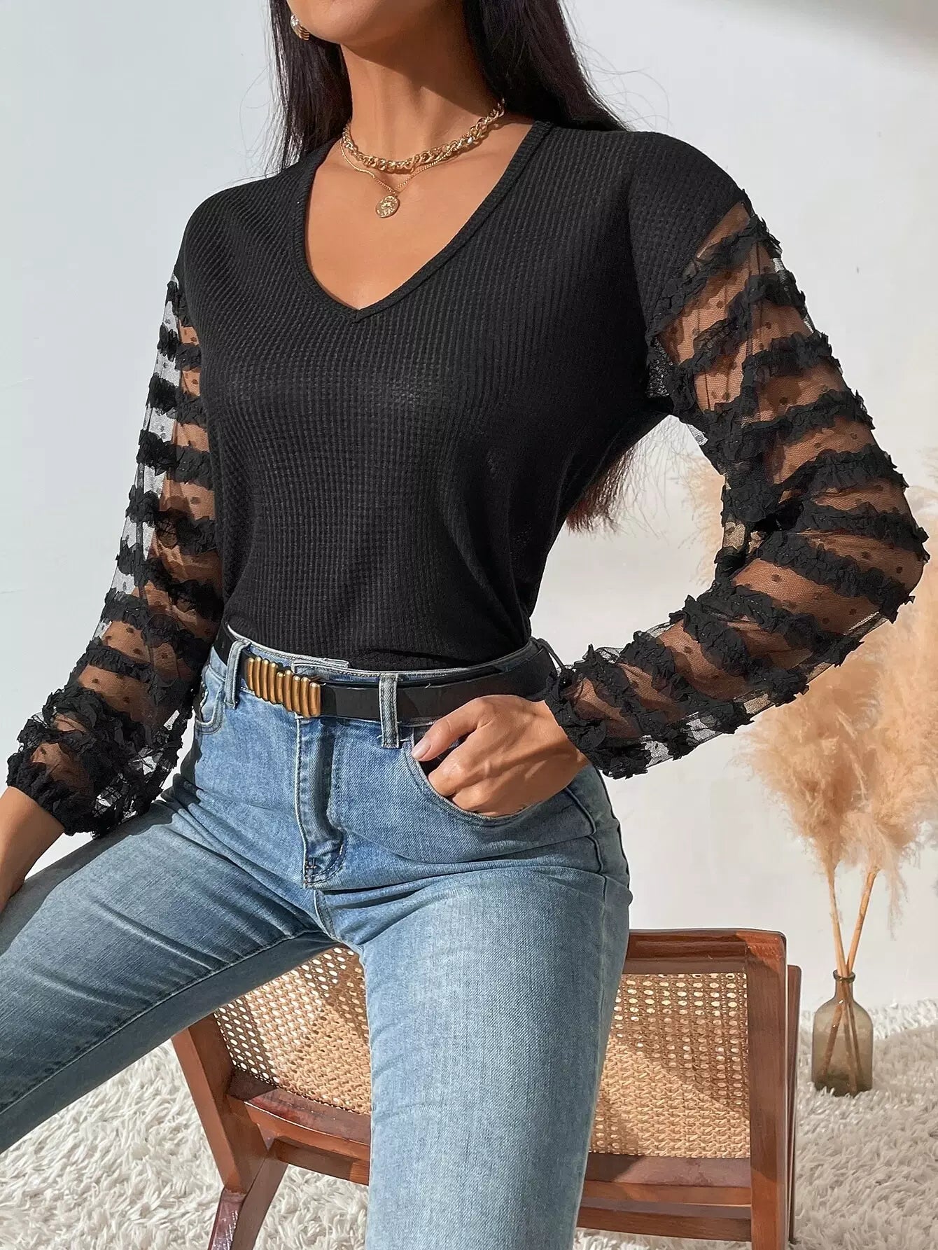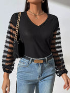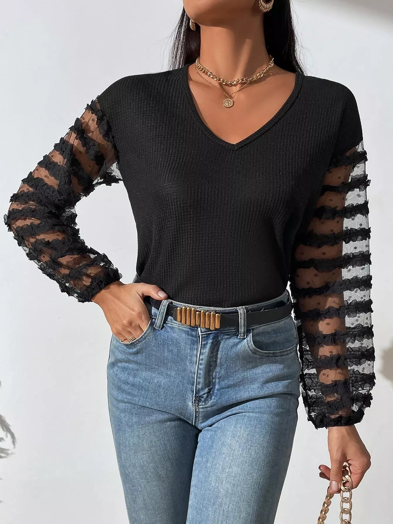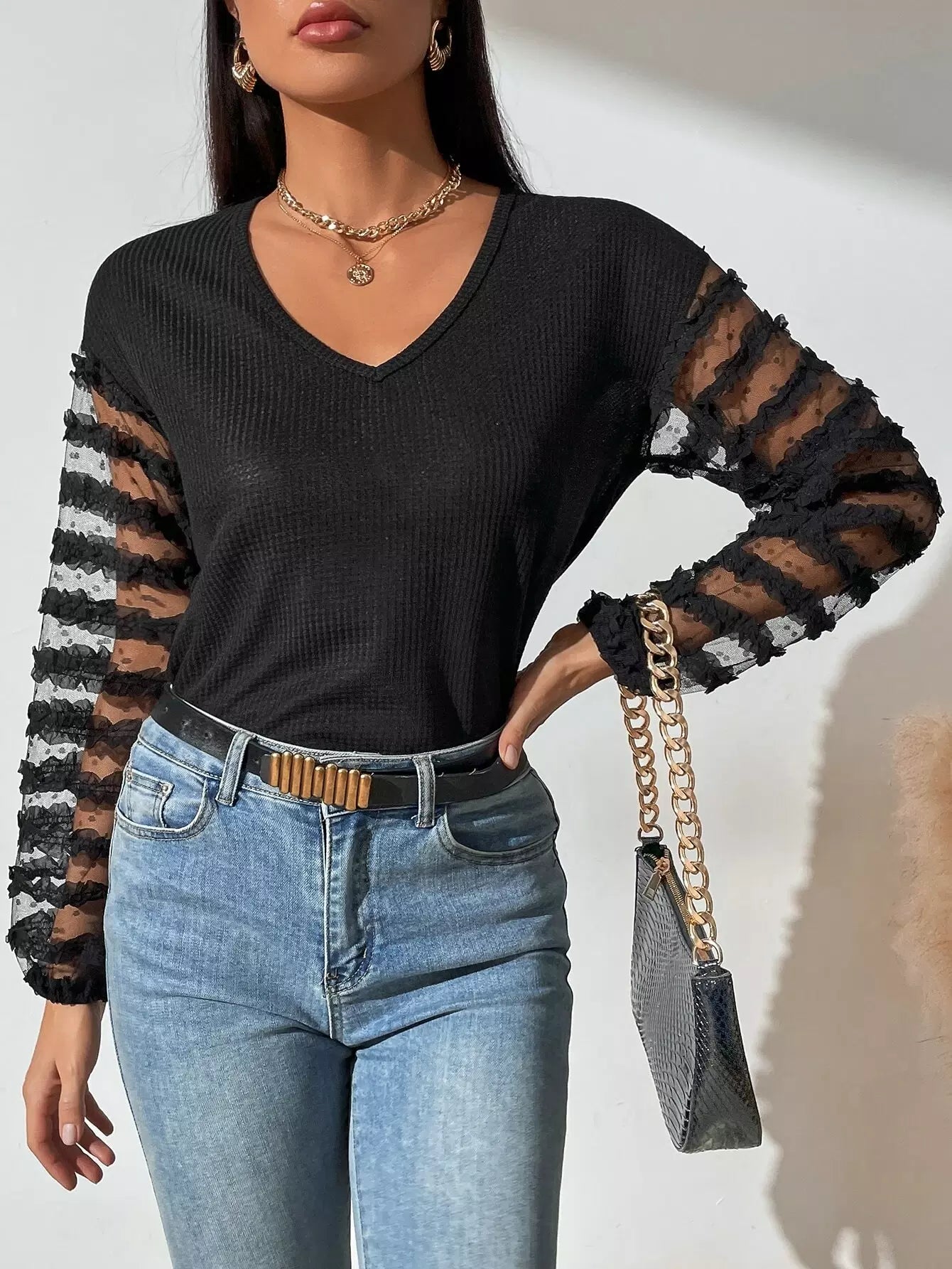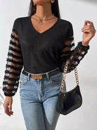 تيشيرت بياقة على شكل V بياقة على شكل V بياقة شبكية بلون مغاير