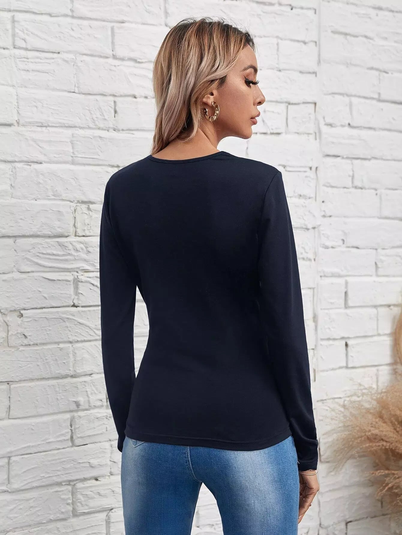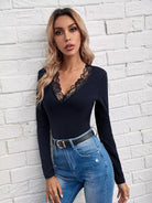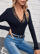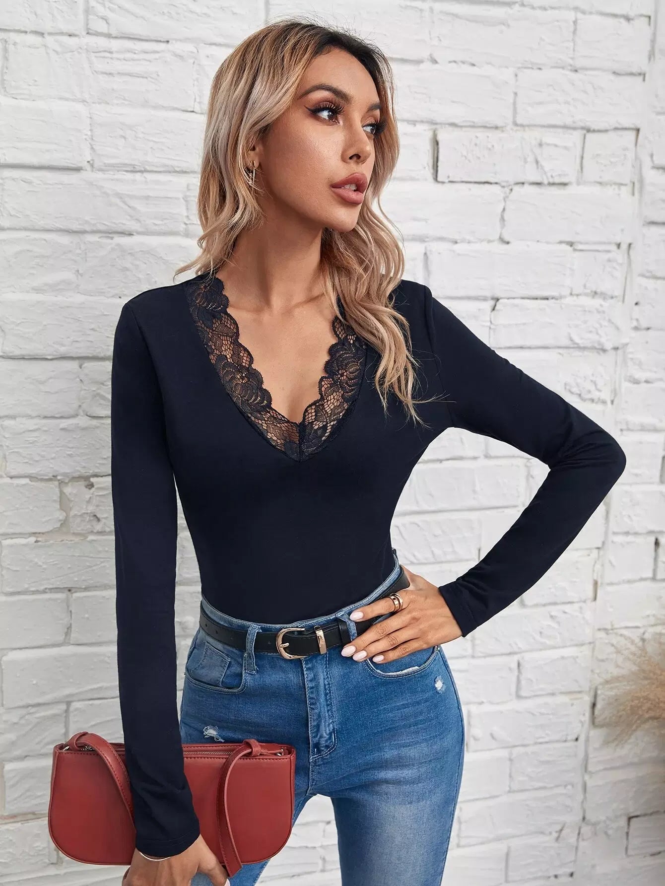 تي شيرت بياقة على شكل V برقبة على شكل دانتيل رفيع