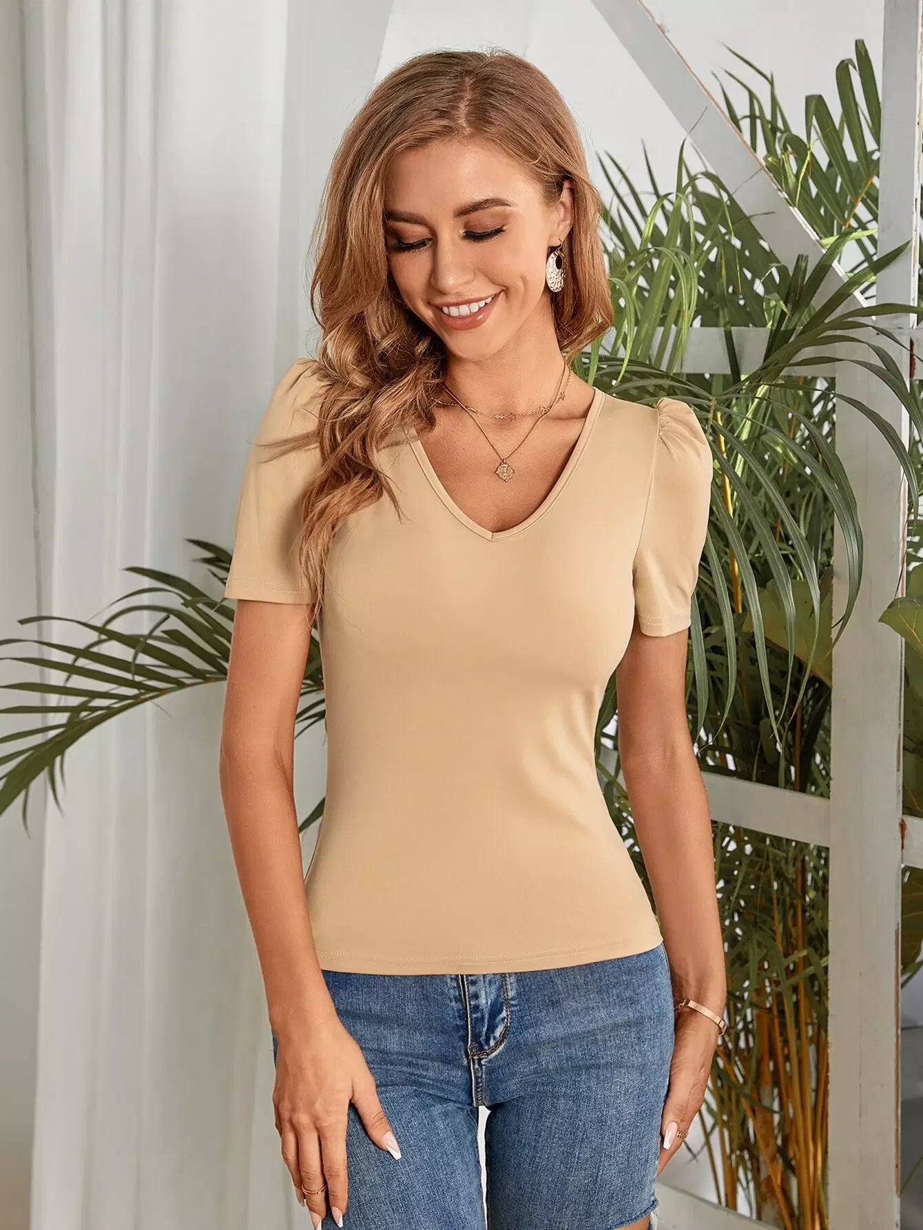 للنساء - تي شيرت بأكمام منتفخة ورقبة على شكل حرف V