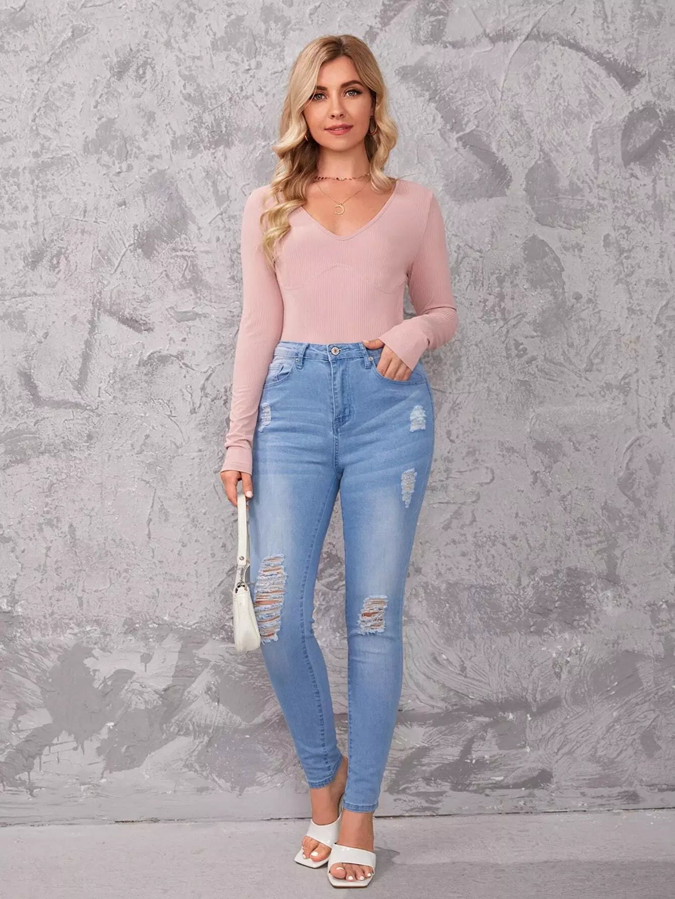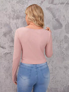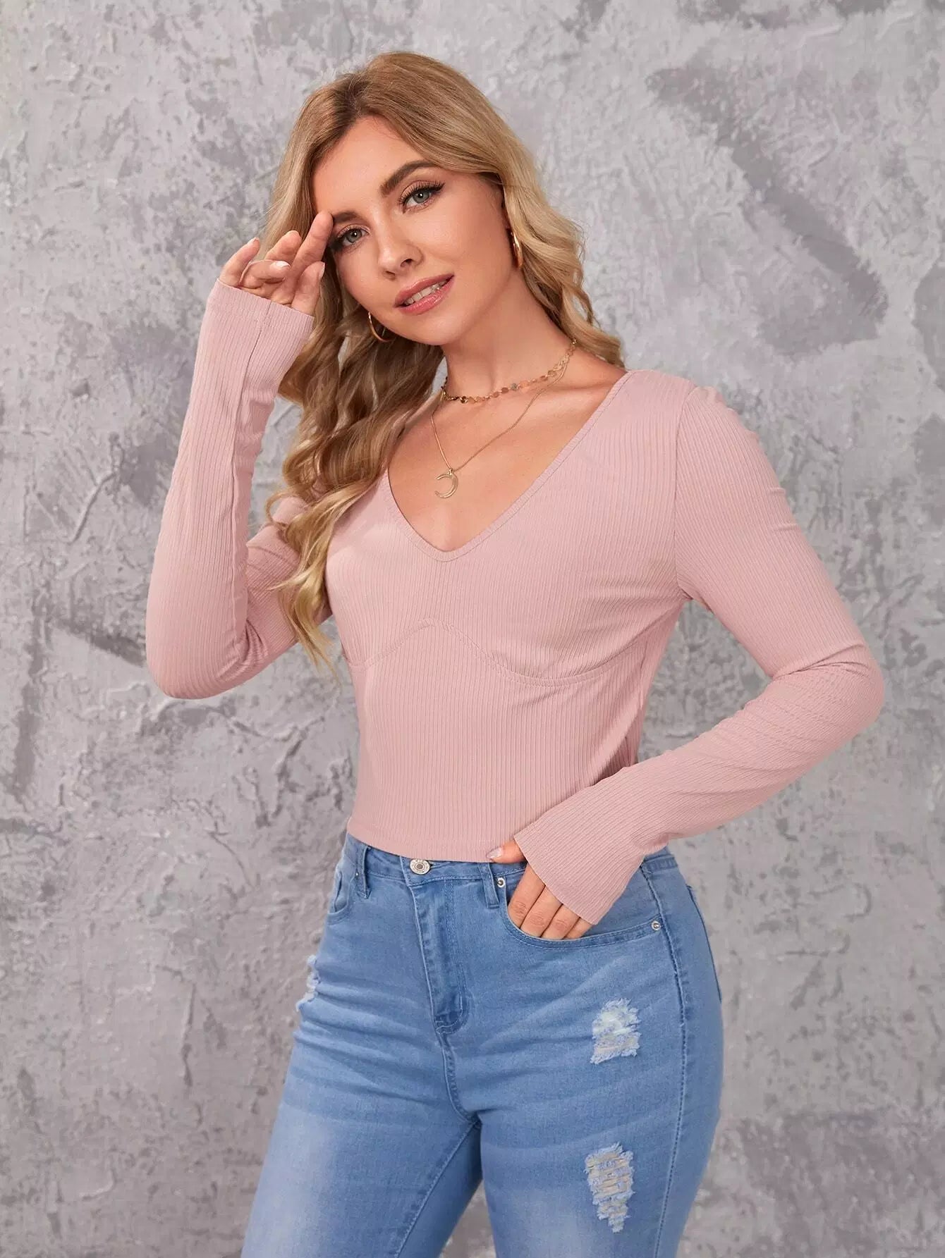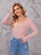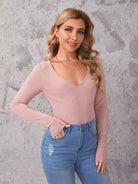 تي شيرت بياقة على شكل حرف V برقبة مضلعة ومحبوكة ضيقة