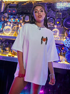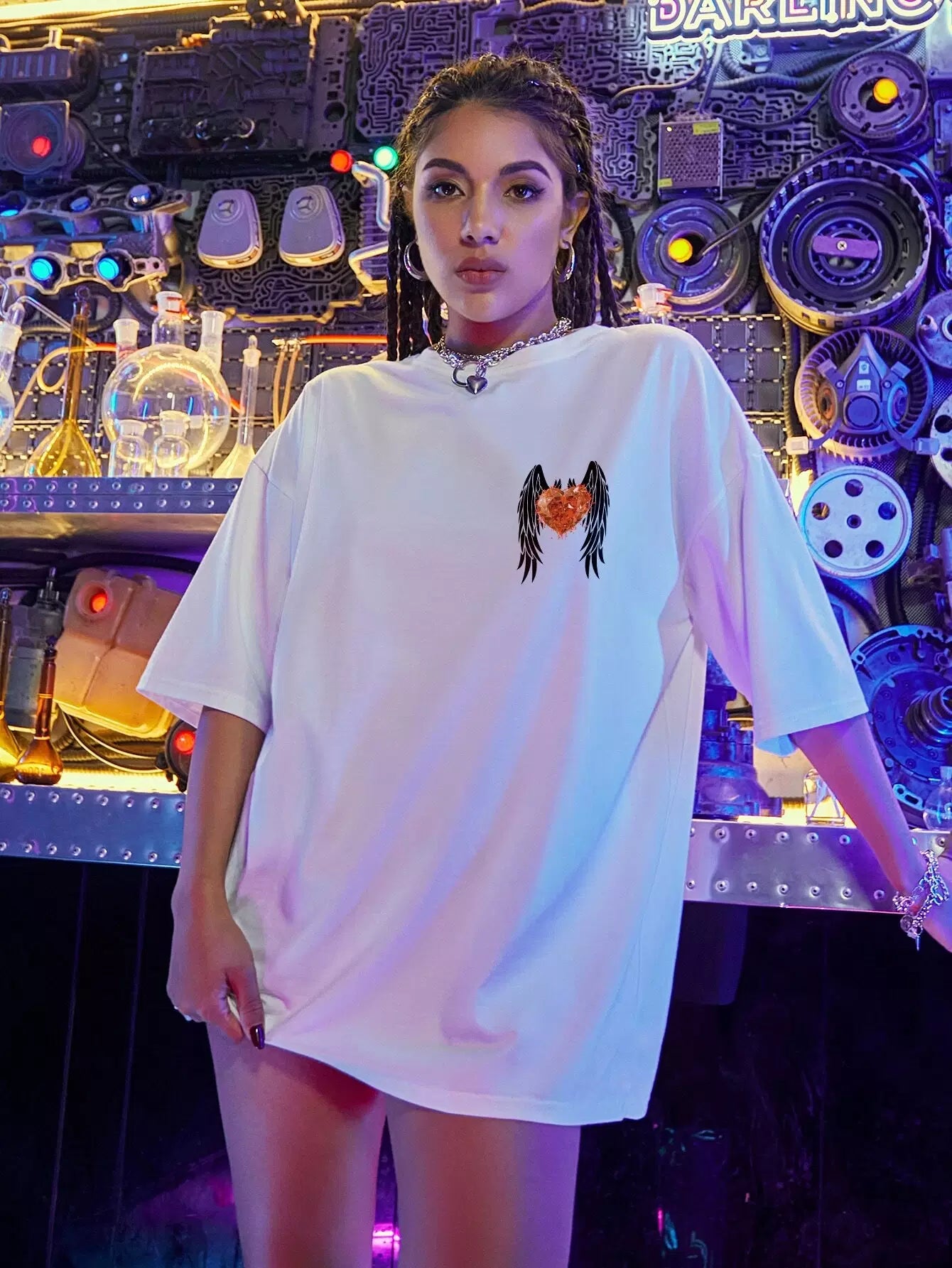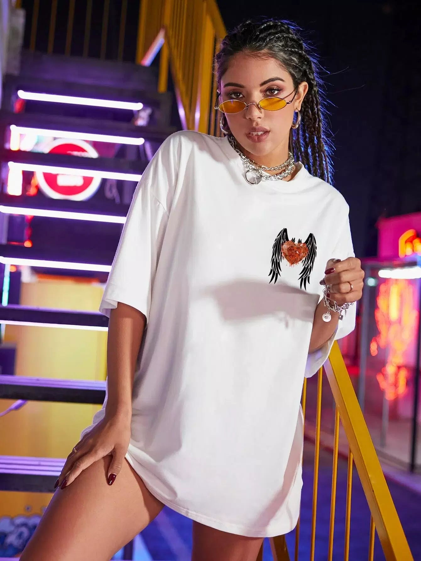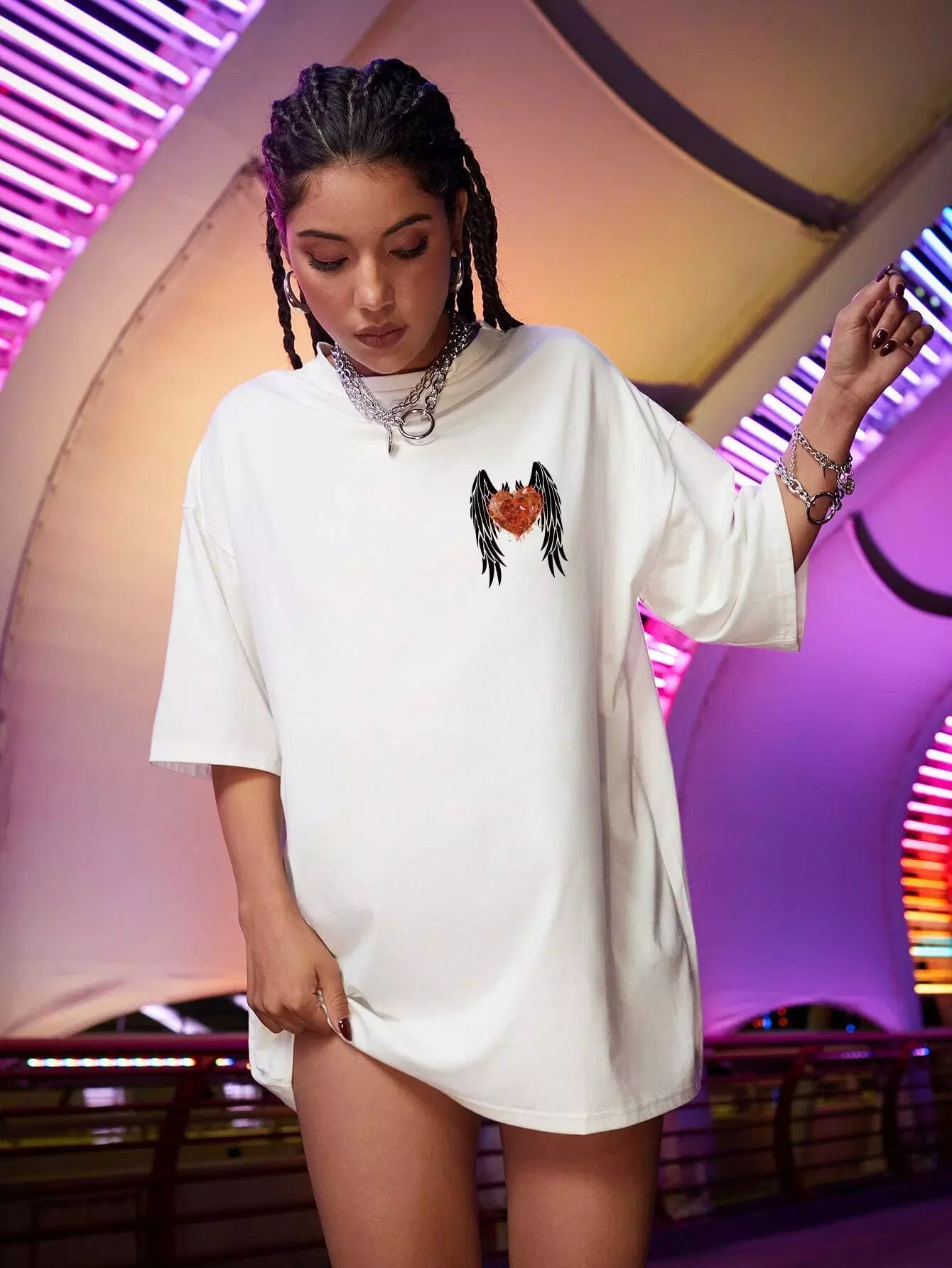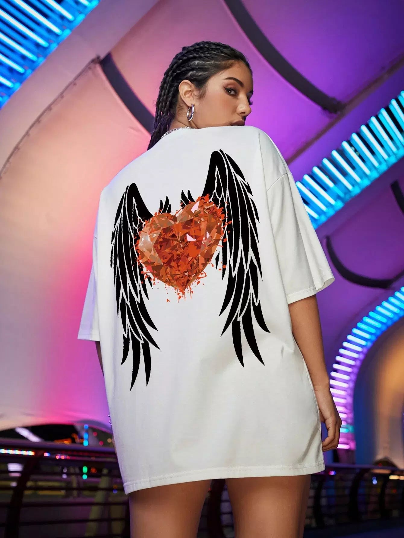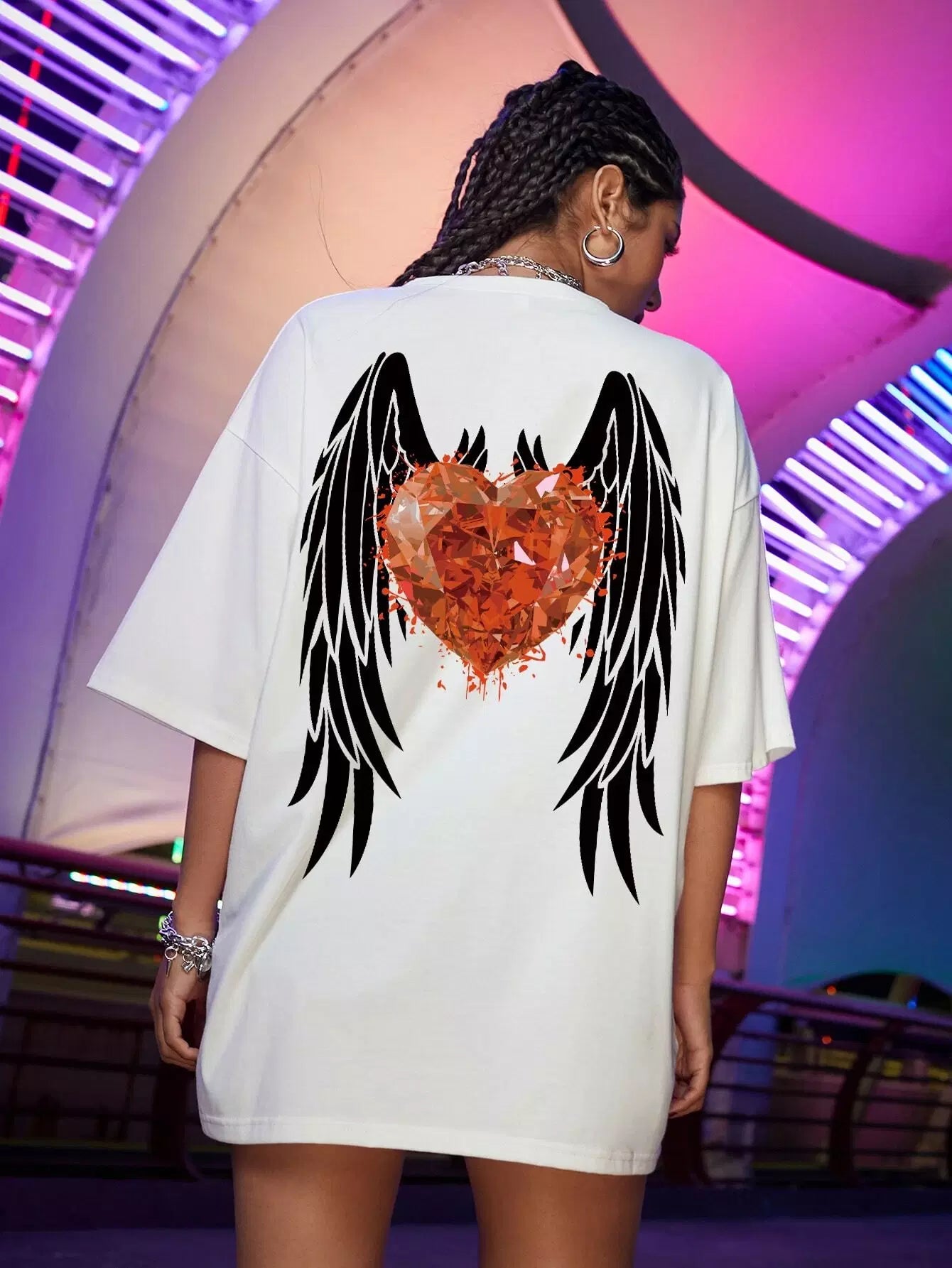 تي شيرت منسدل الكتفين مطبوع عليه طبعة جناح وقلب