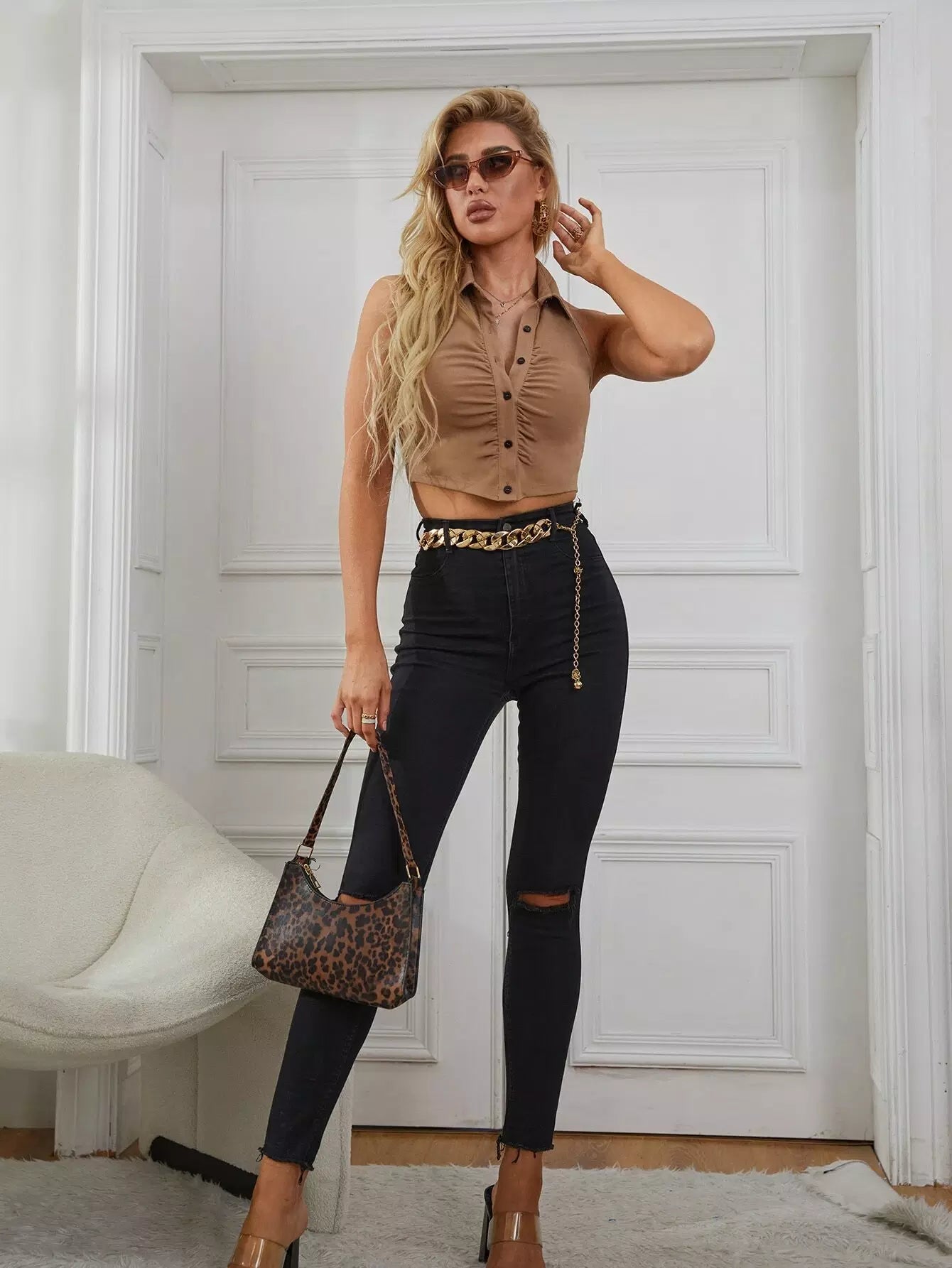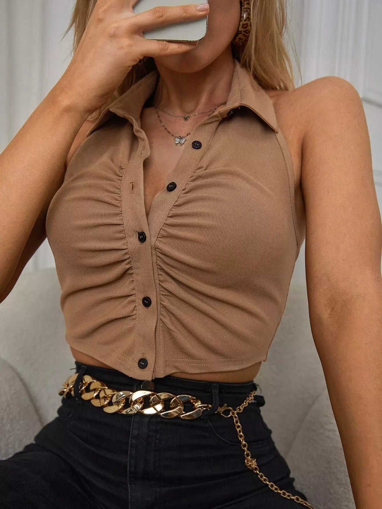 بلوزة مكشكشة بأزرار أمامية مكشكشة من الخلف بدون رسن