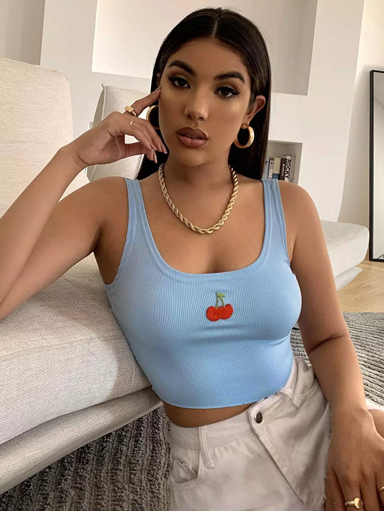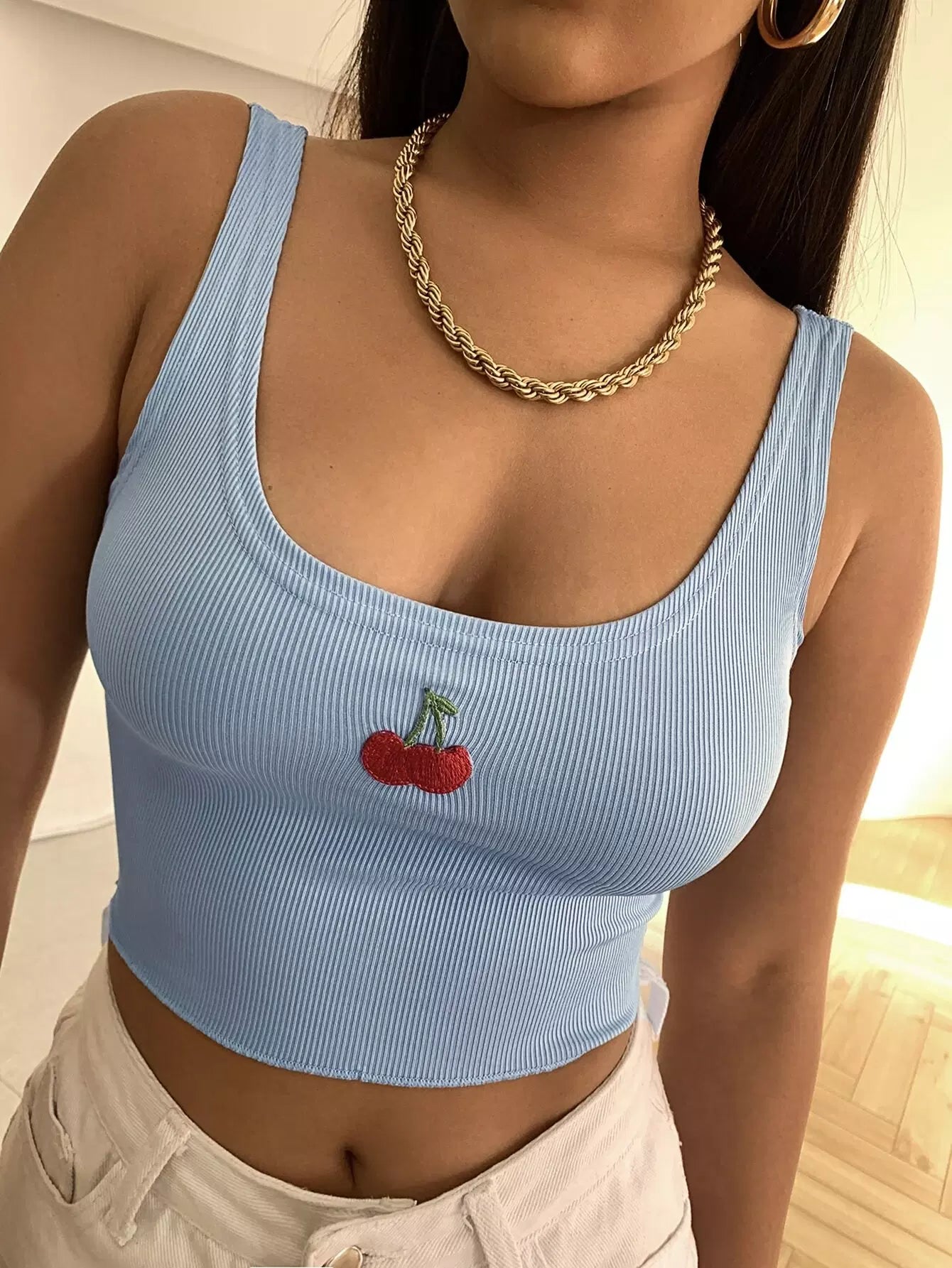 توب بدون أكمام مطرز بالكرز على شكل قميص قصير مطرز بالكرز