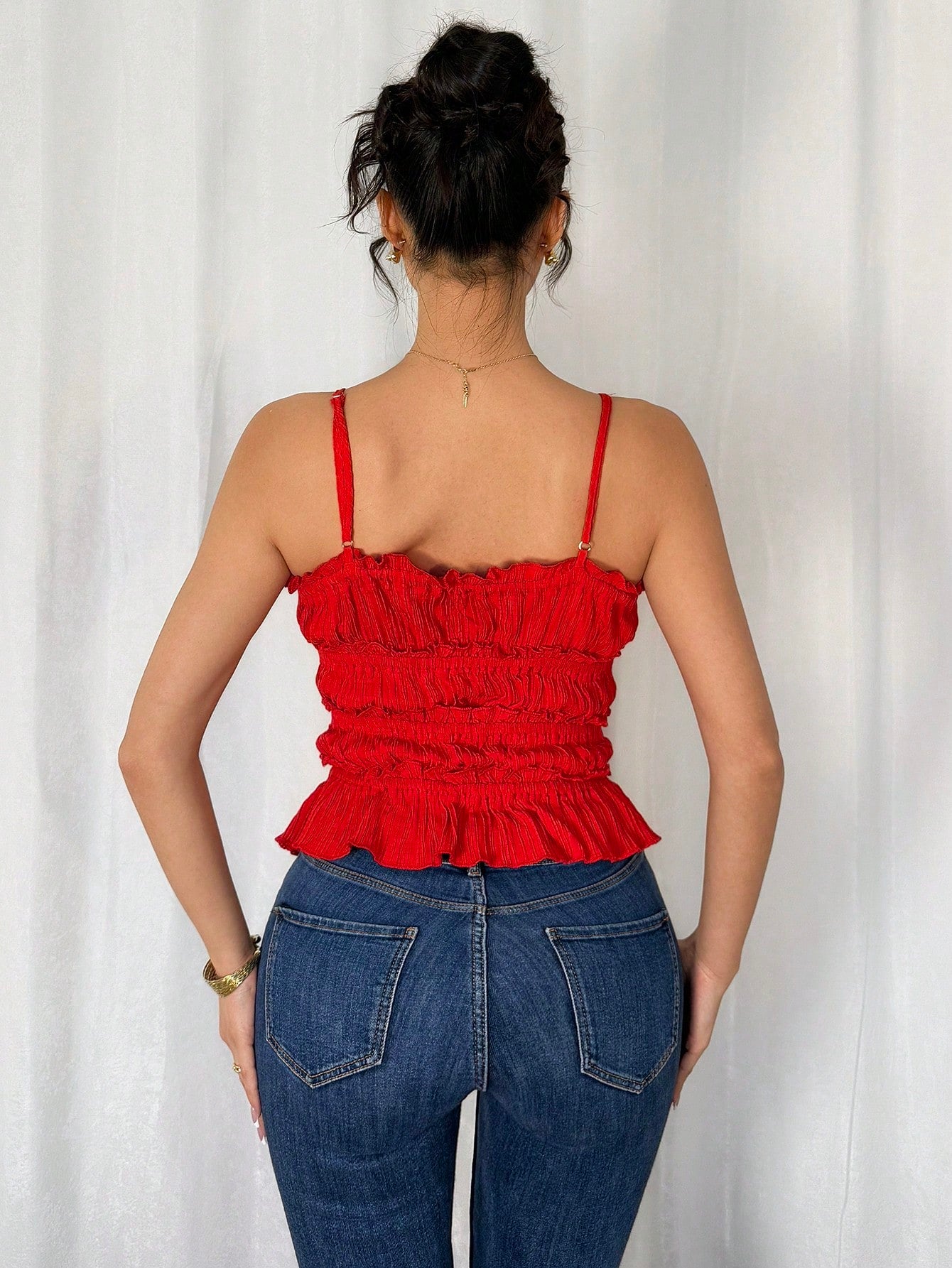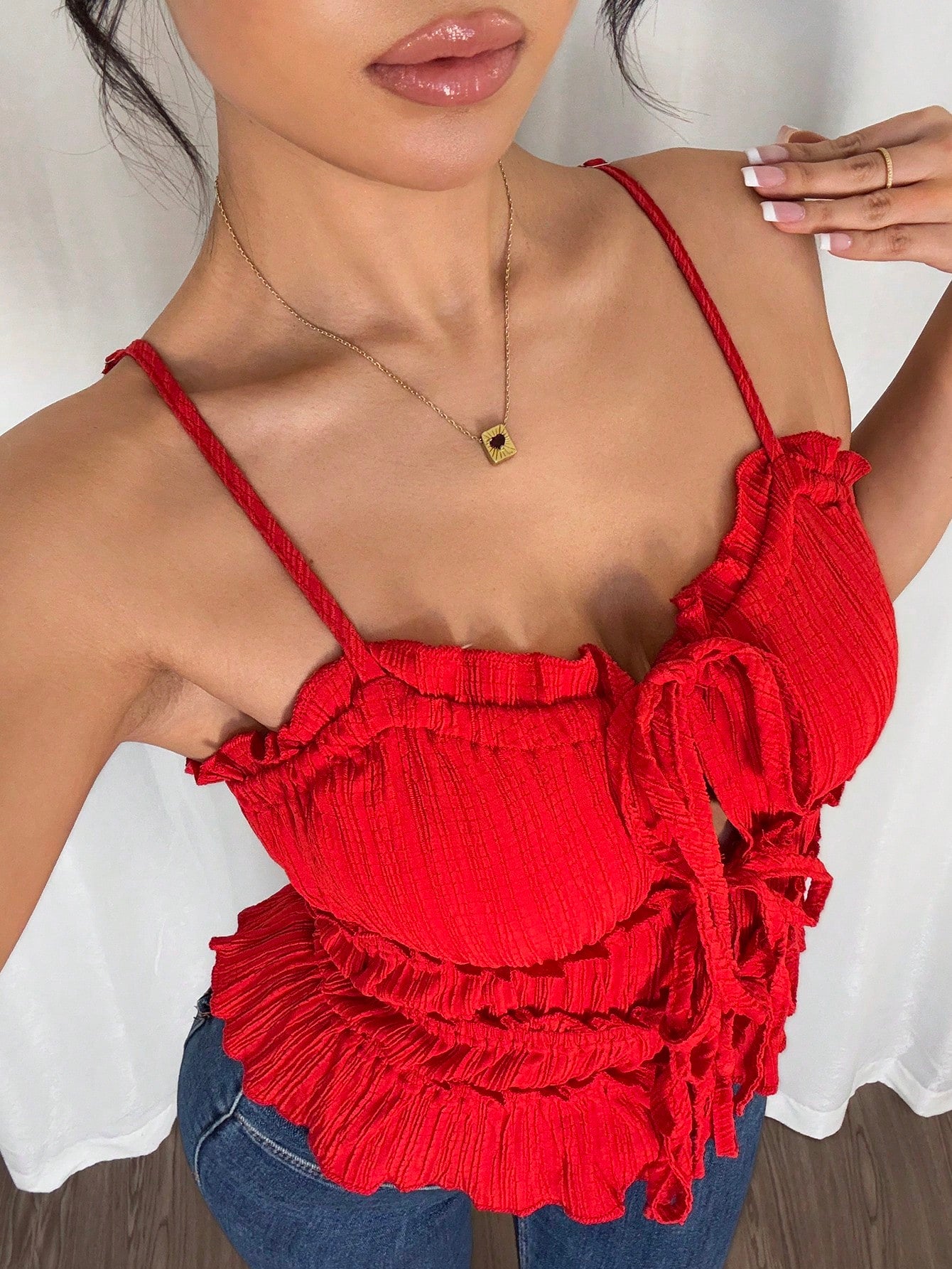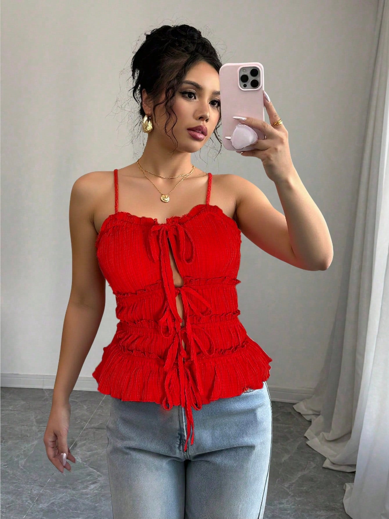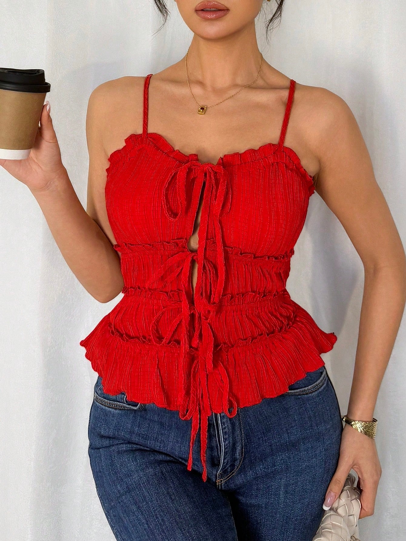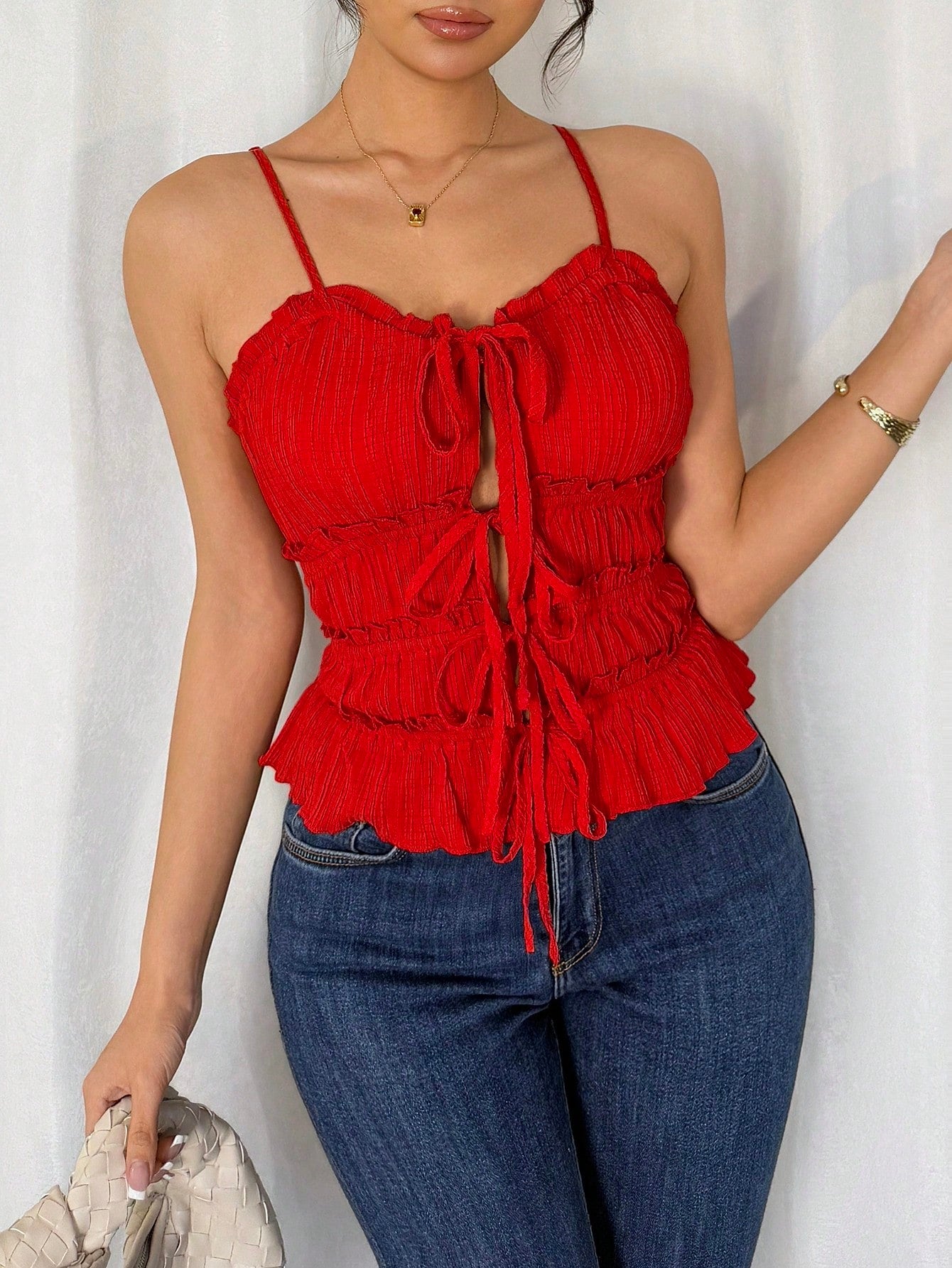 women Chiquease Women Elegant Spaghetti Strap Open Front Ruched Drawstring Bow Camisole Tank