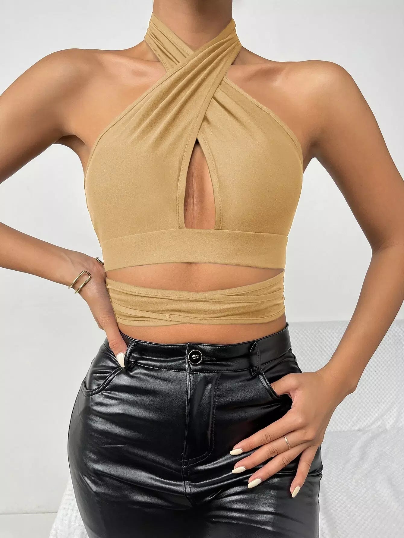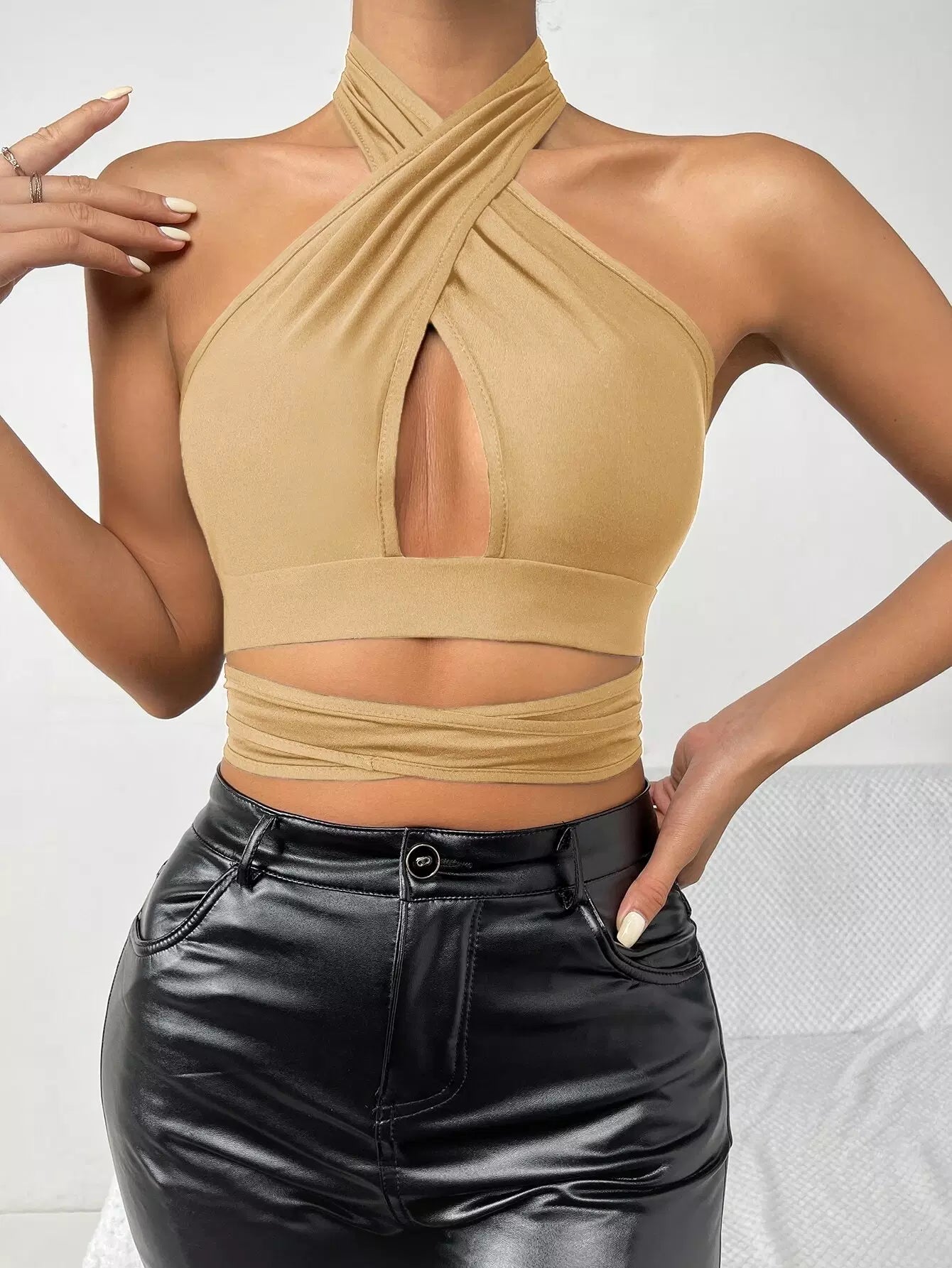 بلوزة قصيرة مكشوفة الظهر ومربوطة بشكل متقاطع