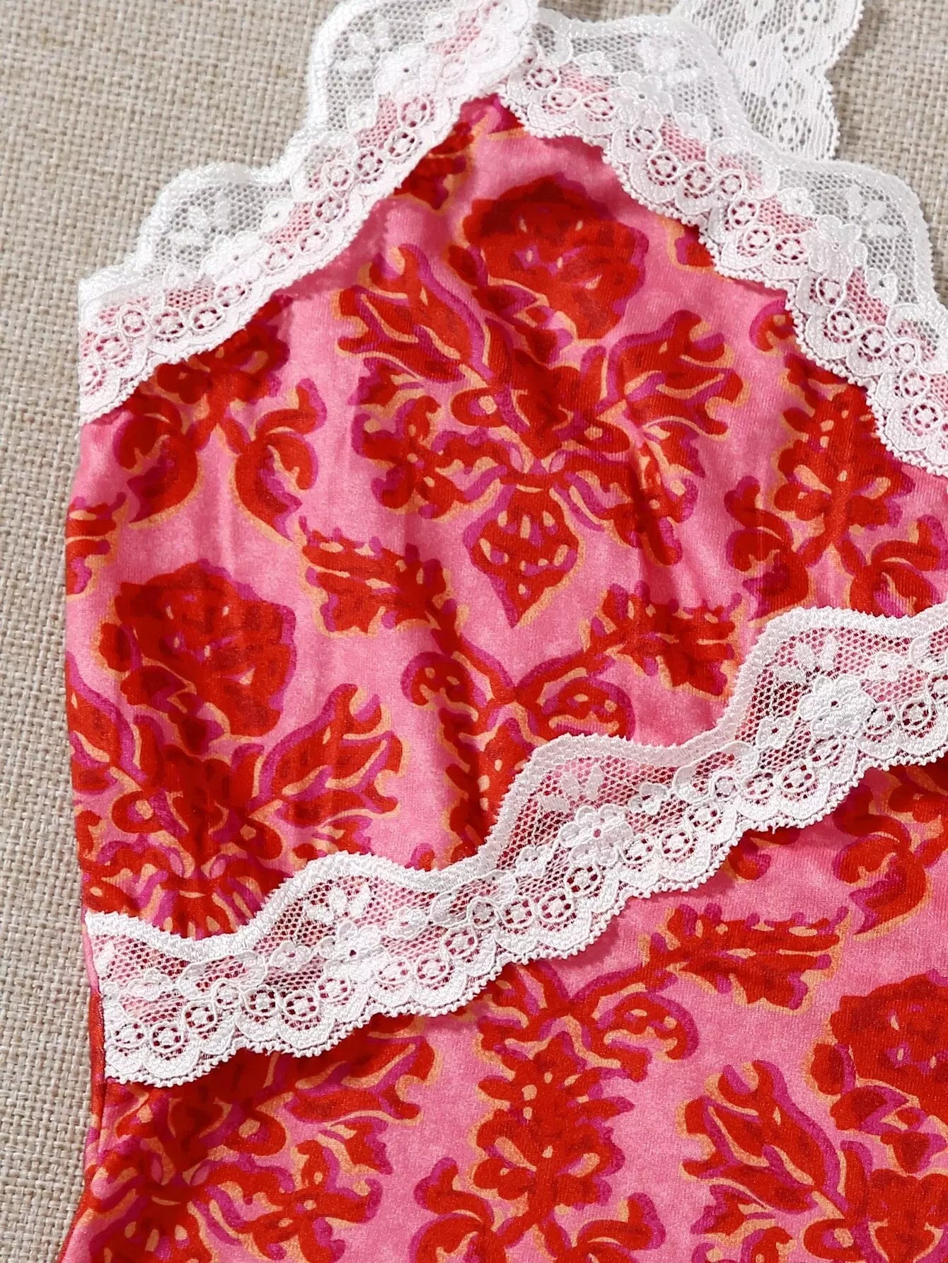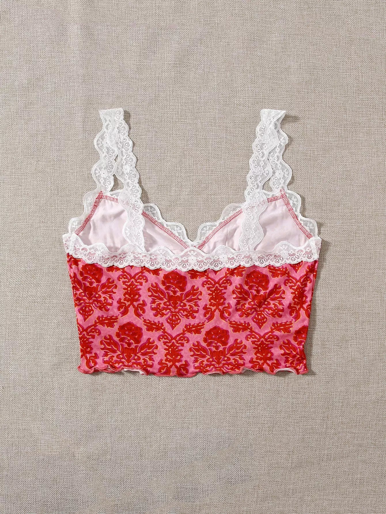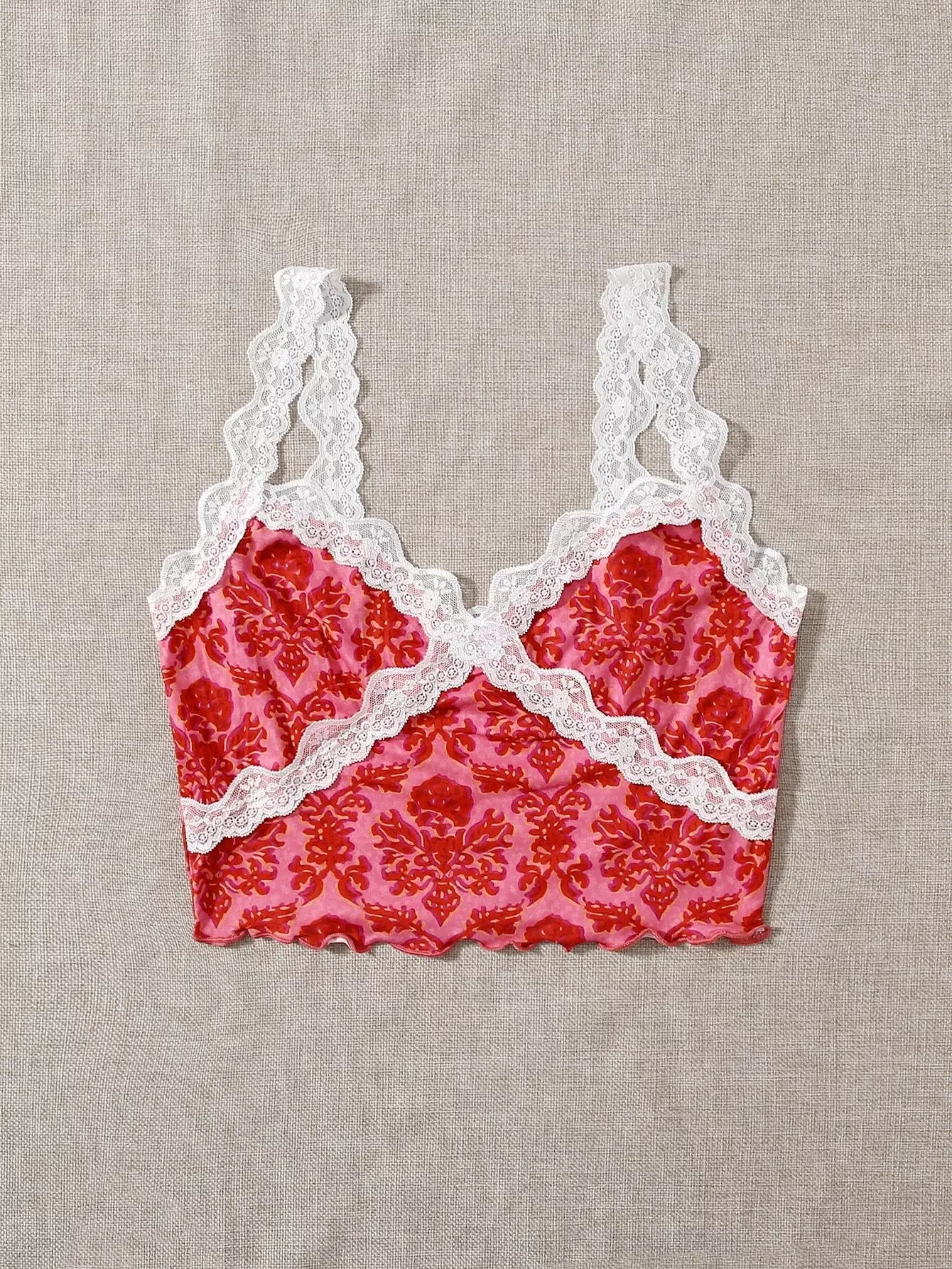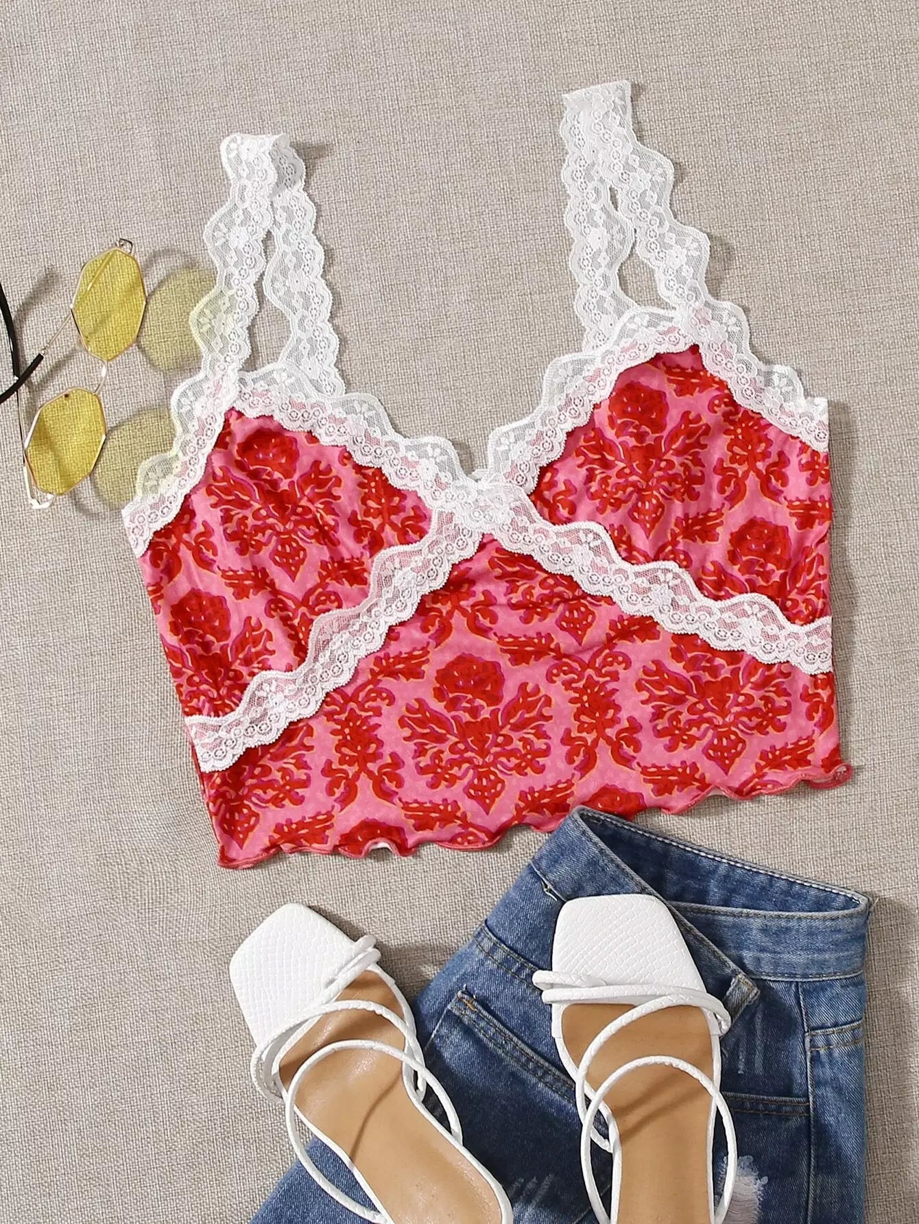 بلوزة قصيرة بطبعة زهور وتفاصيل دانتيل متباينة