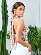 بلوزة بطبعة زهور بياقة حول العنق برقبة من الخلف بربطة عنق مكشكشة من الأمام
