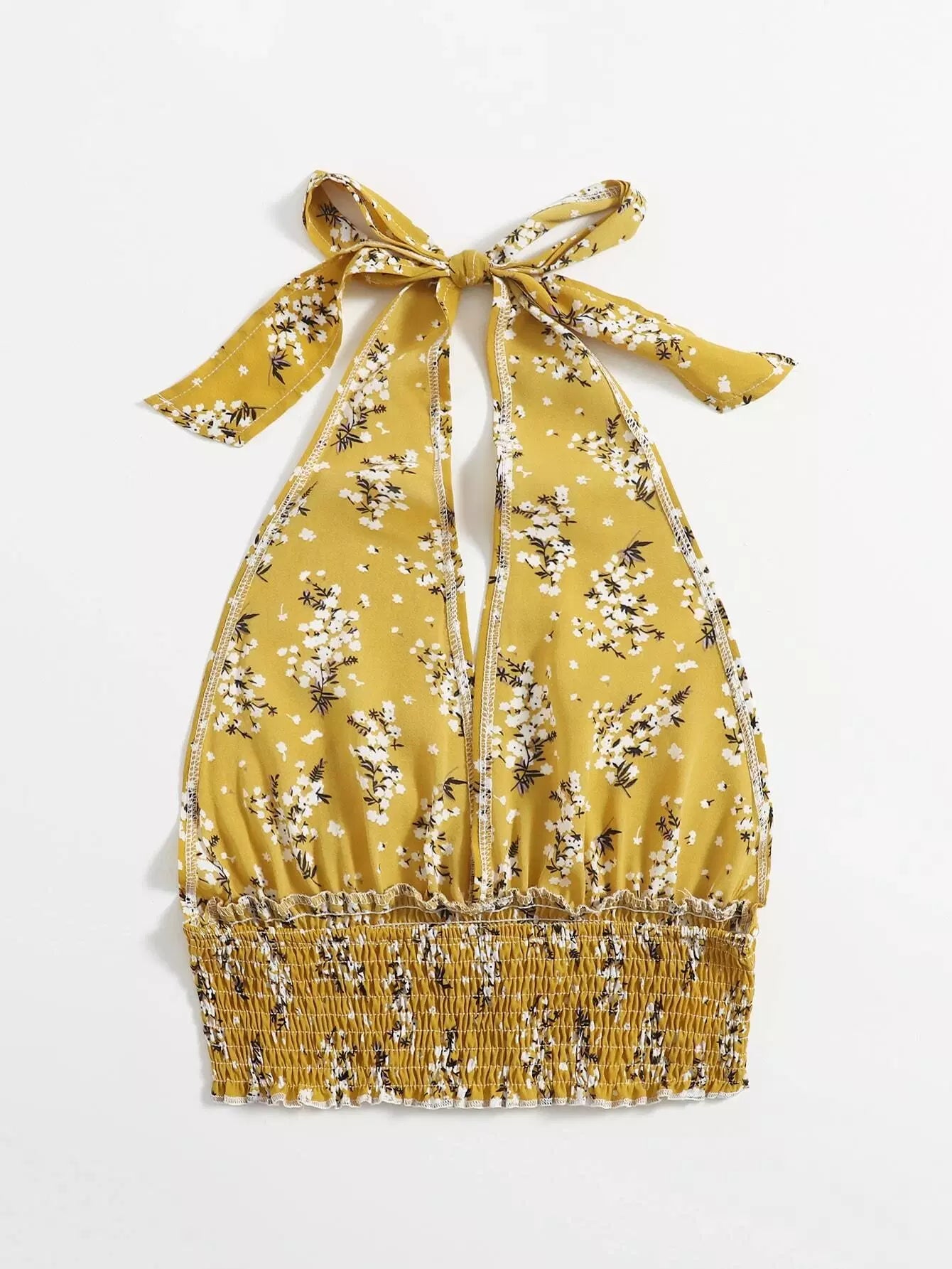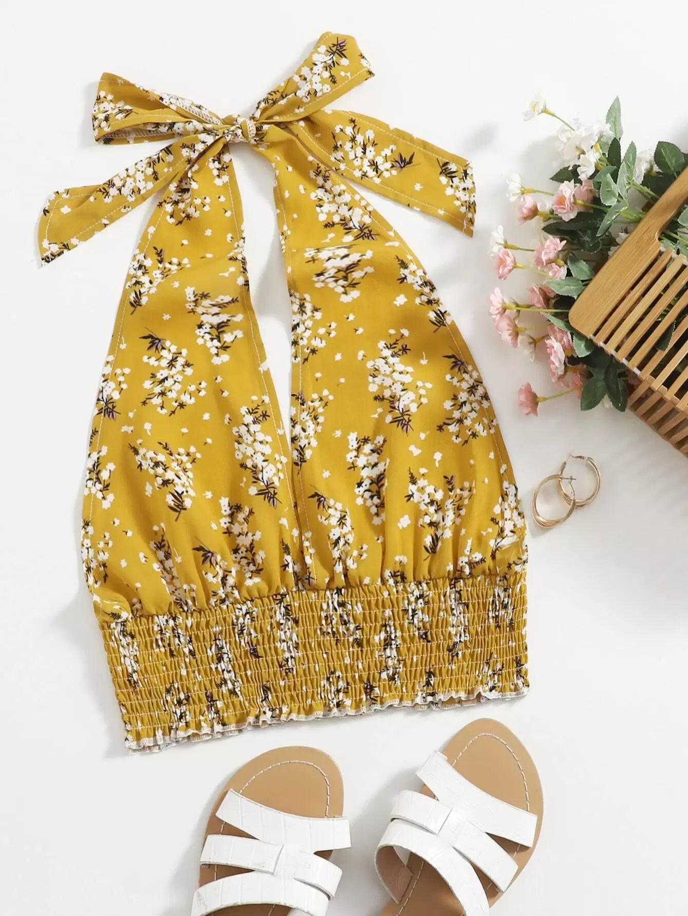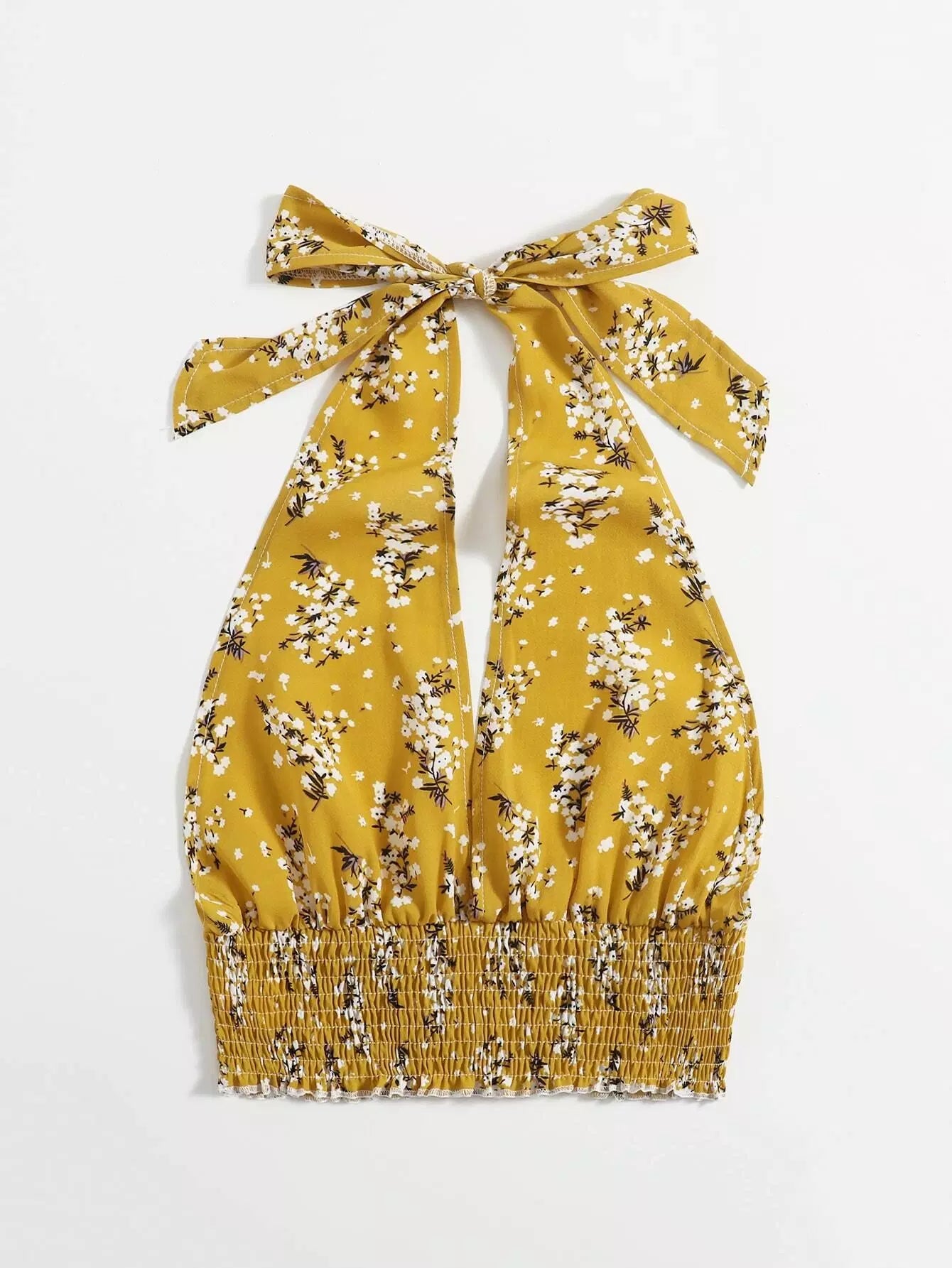 بلوزة زهرية بربطة عنق حول العنق وربطة عنق من الخلف بشريط من الورود