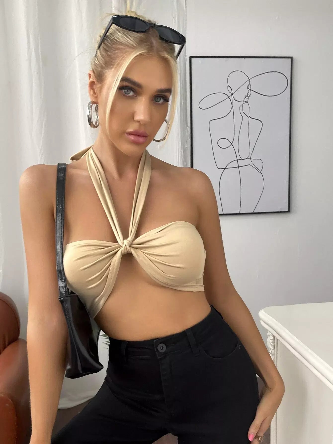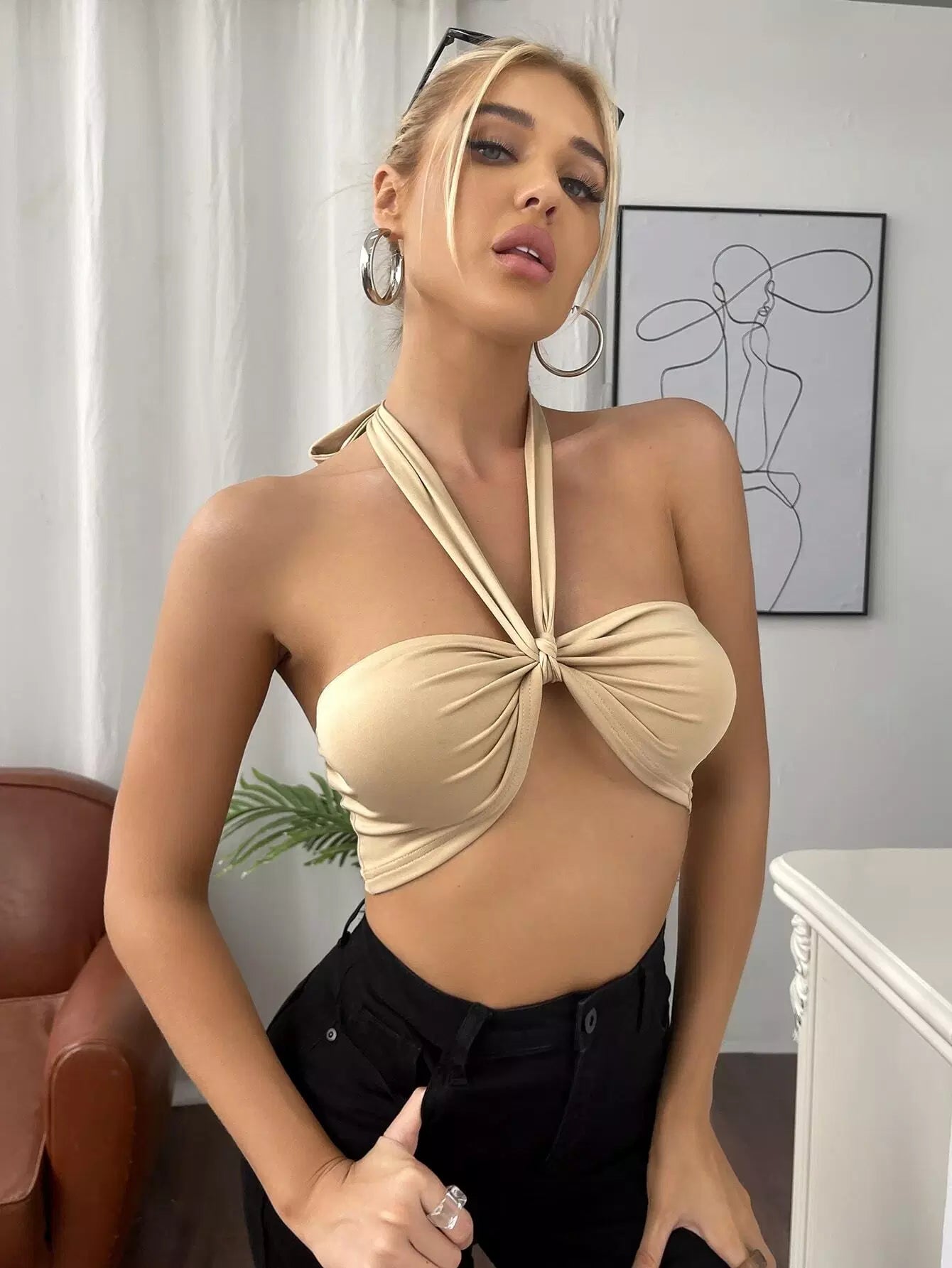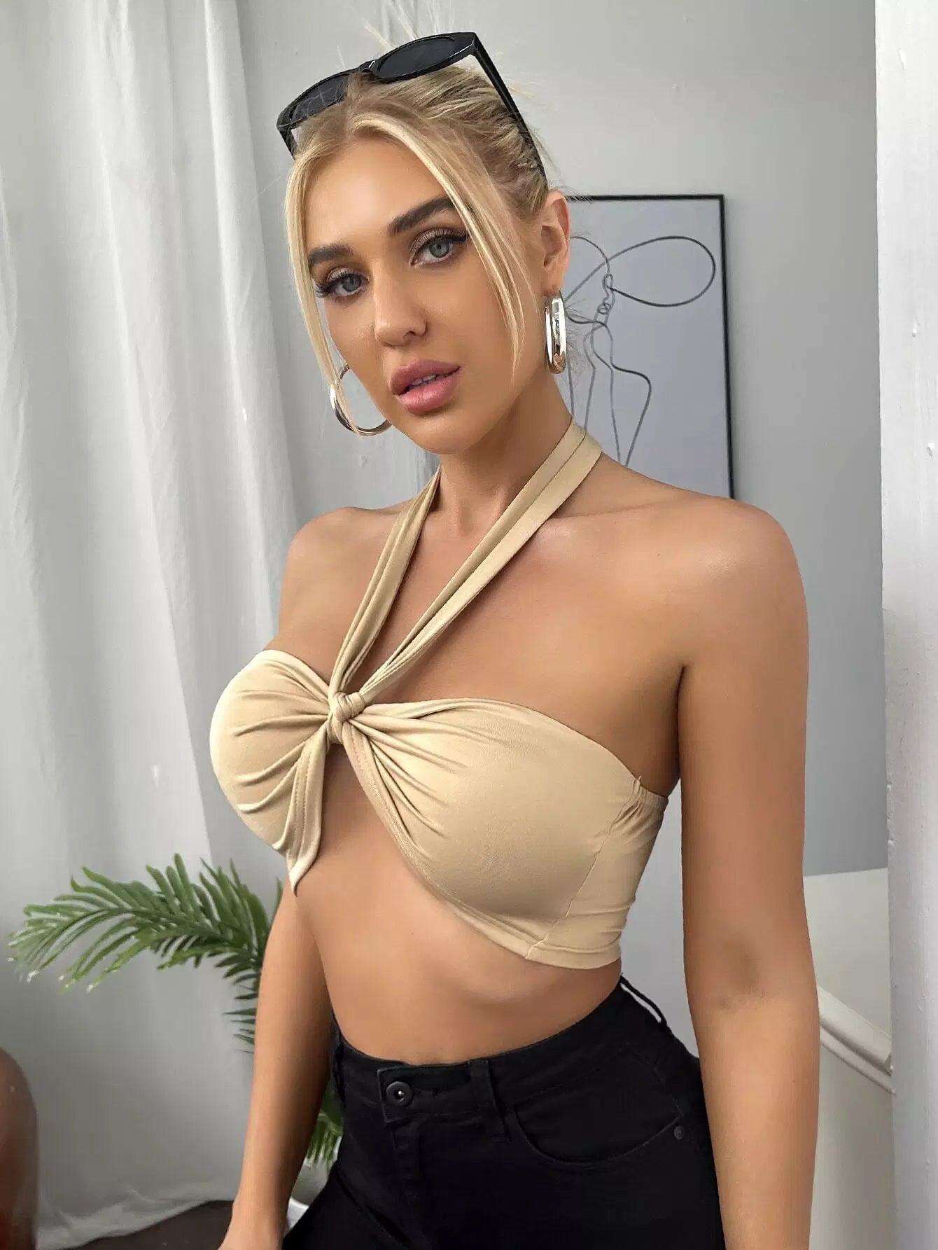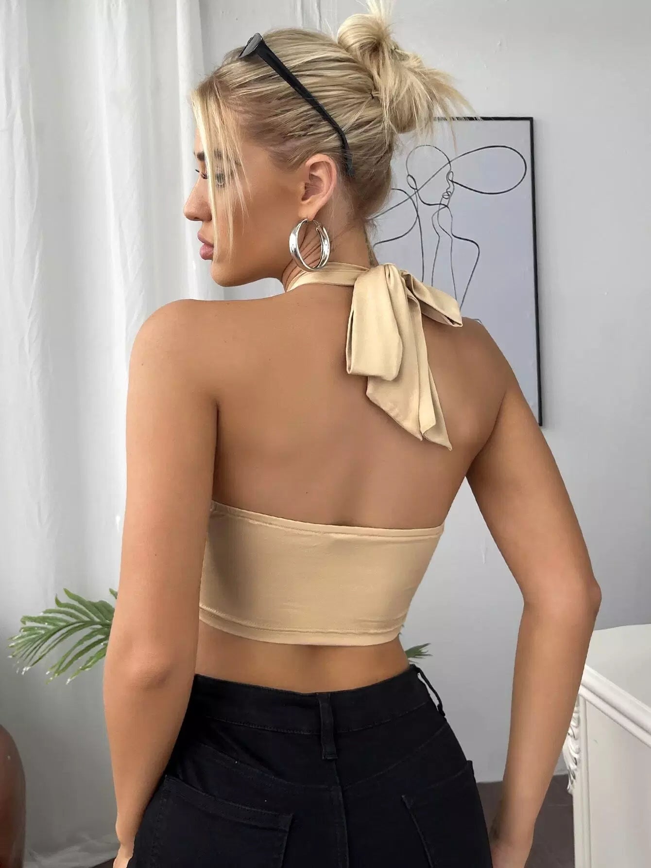 بلوزة قصيرة بياقة ملتوية بياقة حول العنق وربطة عنق من الخلف