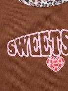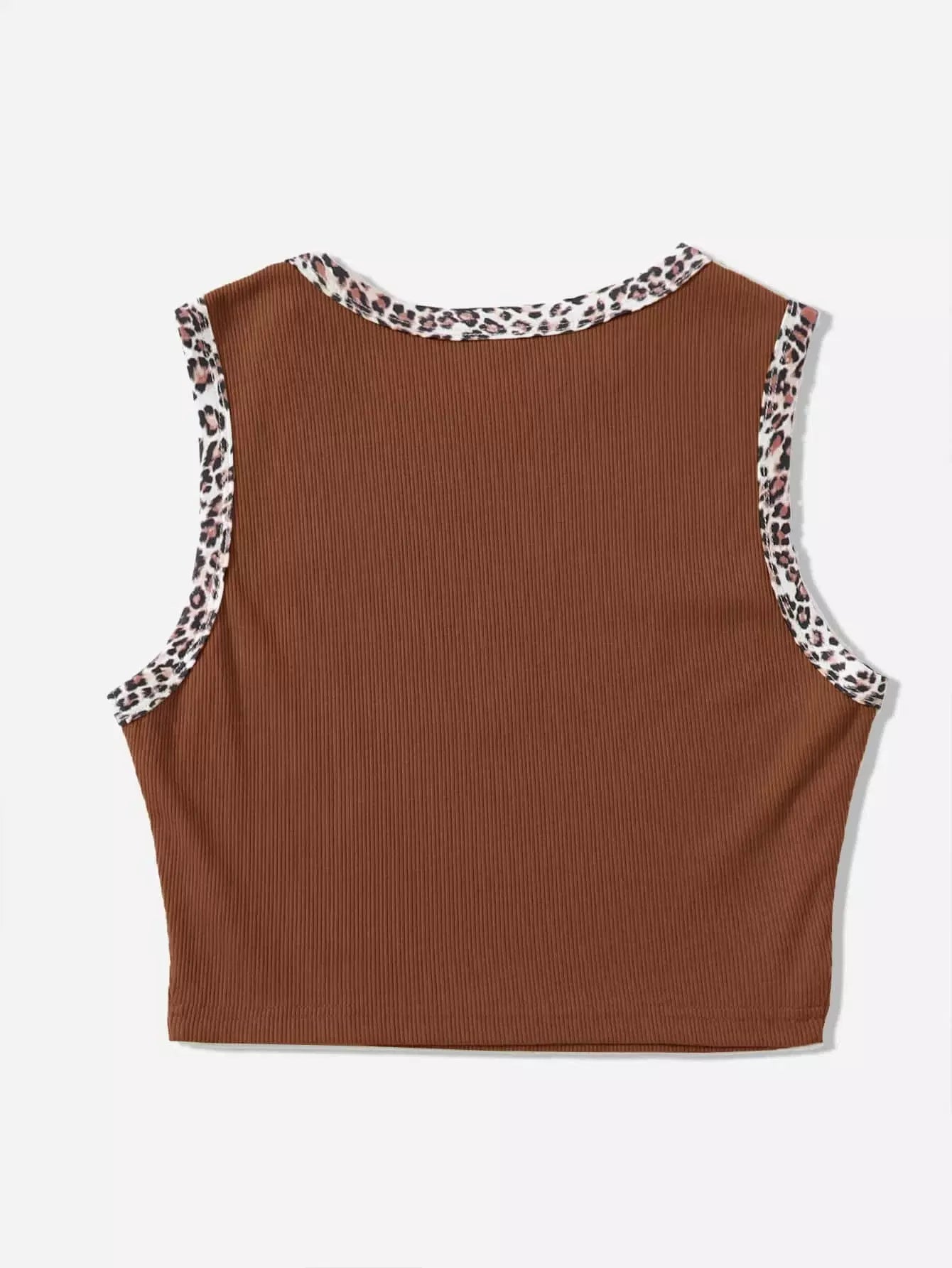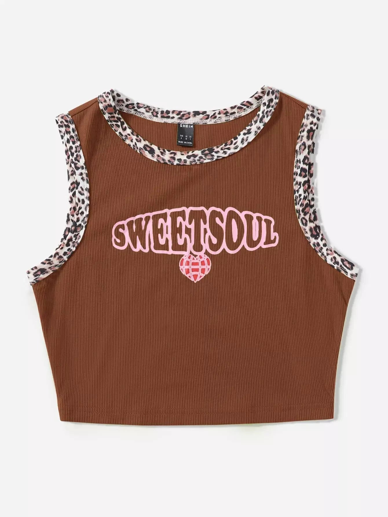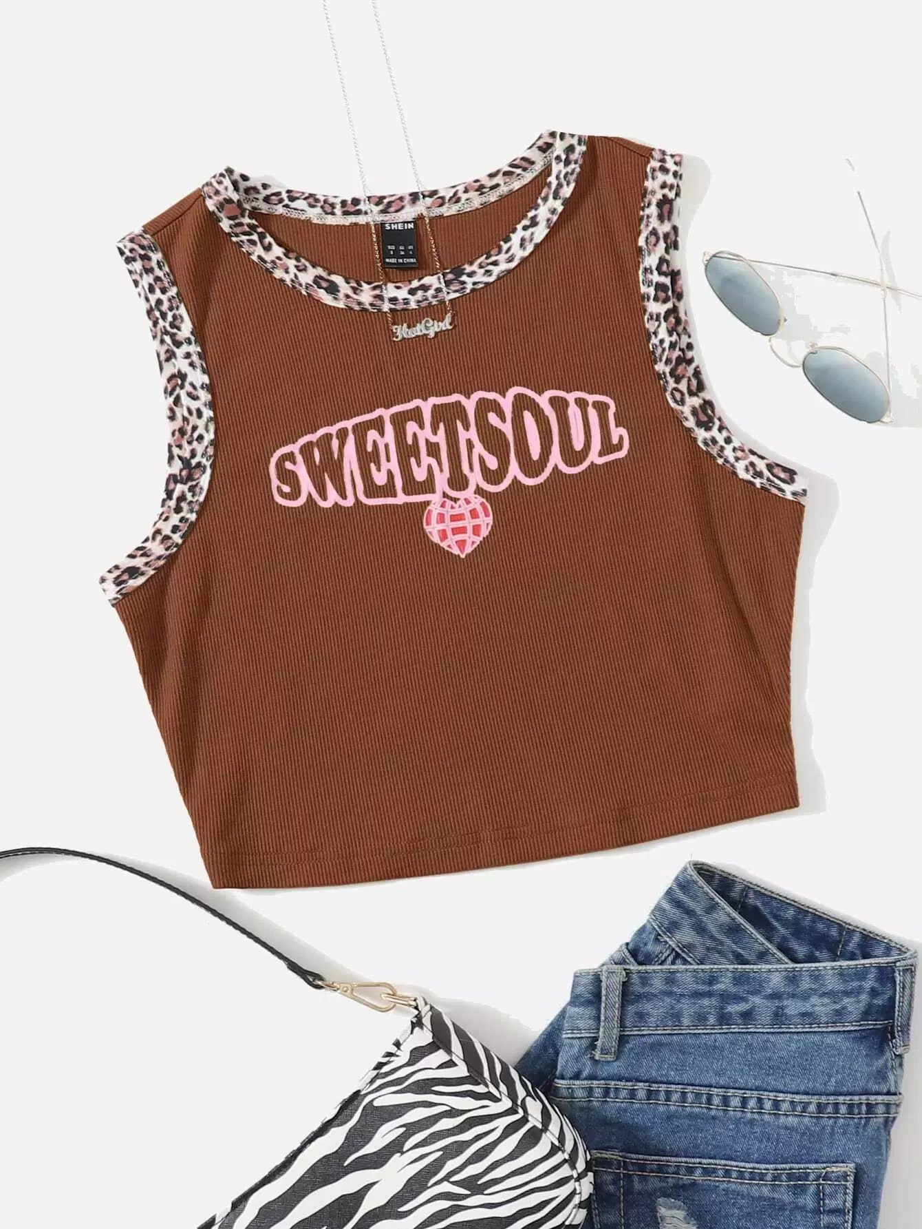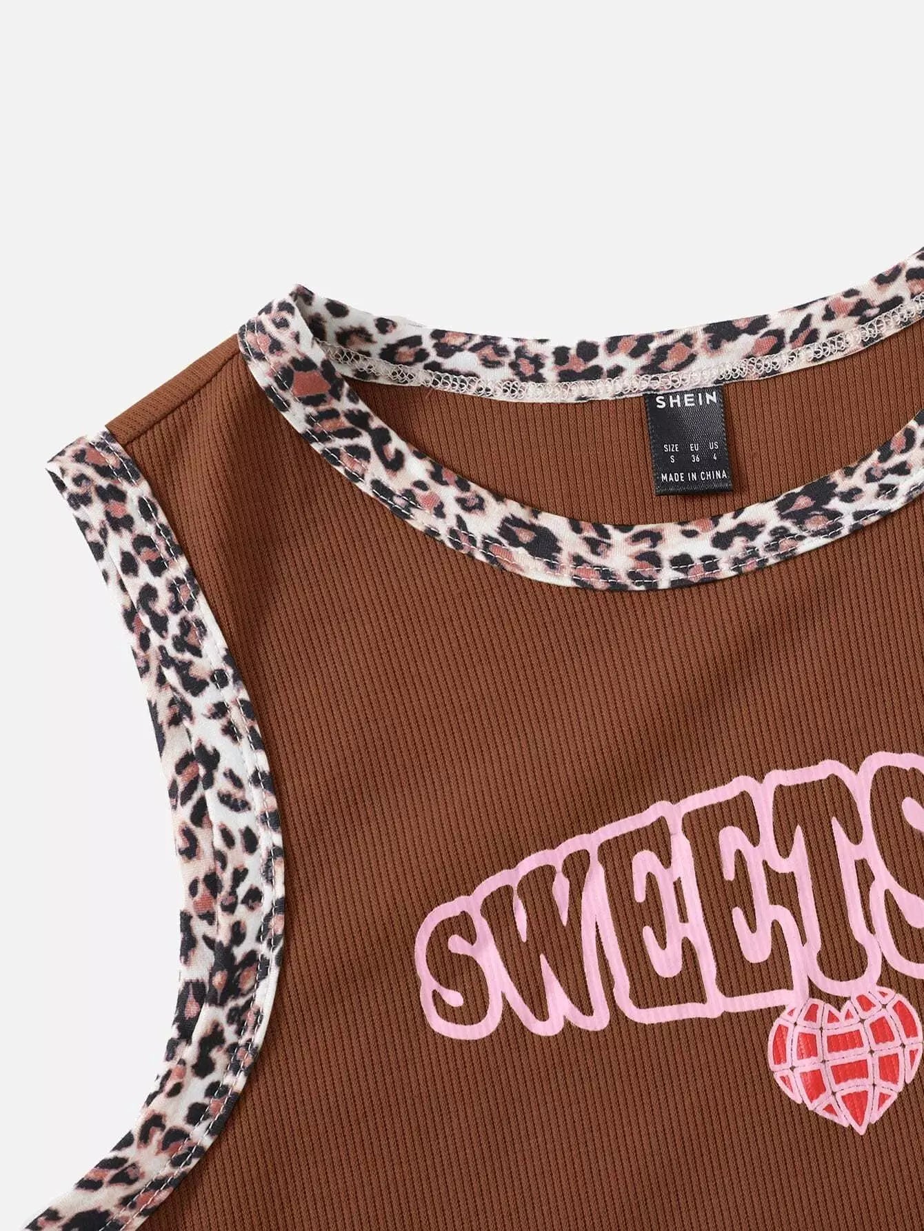 بلوزة بدون أكمام من نسيج مضلع متباين اللون مع طبعة جلد النمر على شكل قلب وحروف