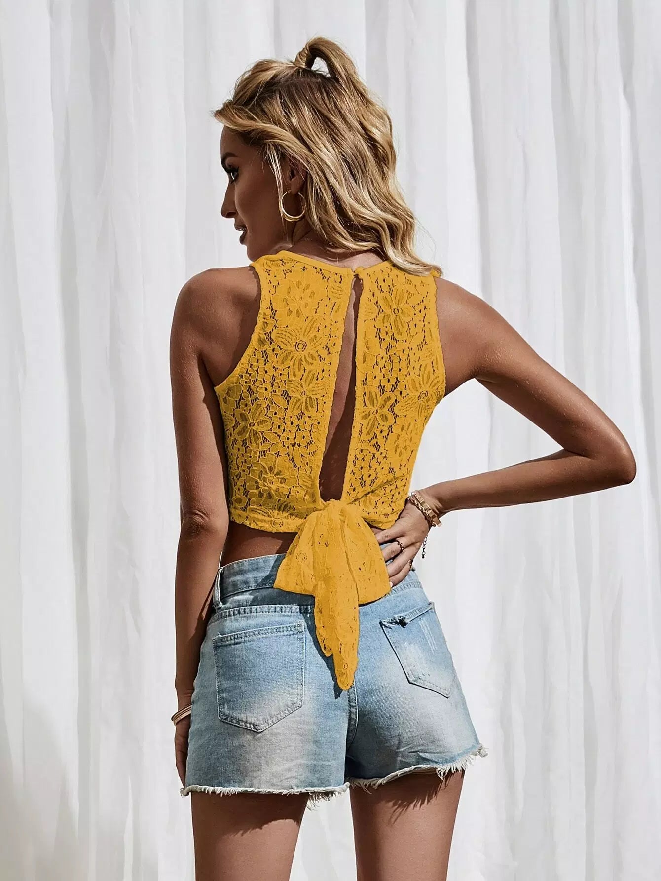 تانك بدون أكمام محبوك من الدانتيل ومفتوح من الخلف برباط منشق ومحبوك على شكل ضلع
