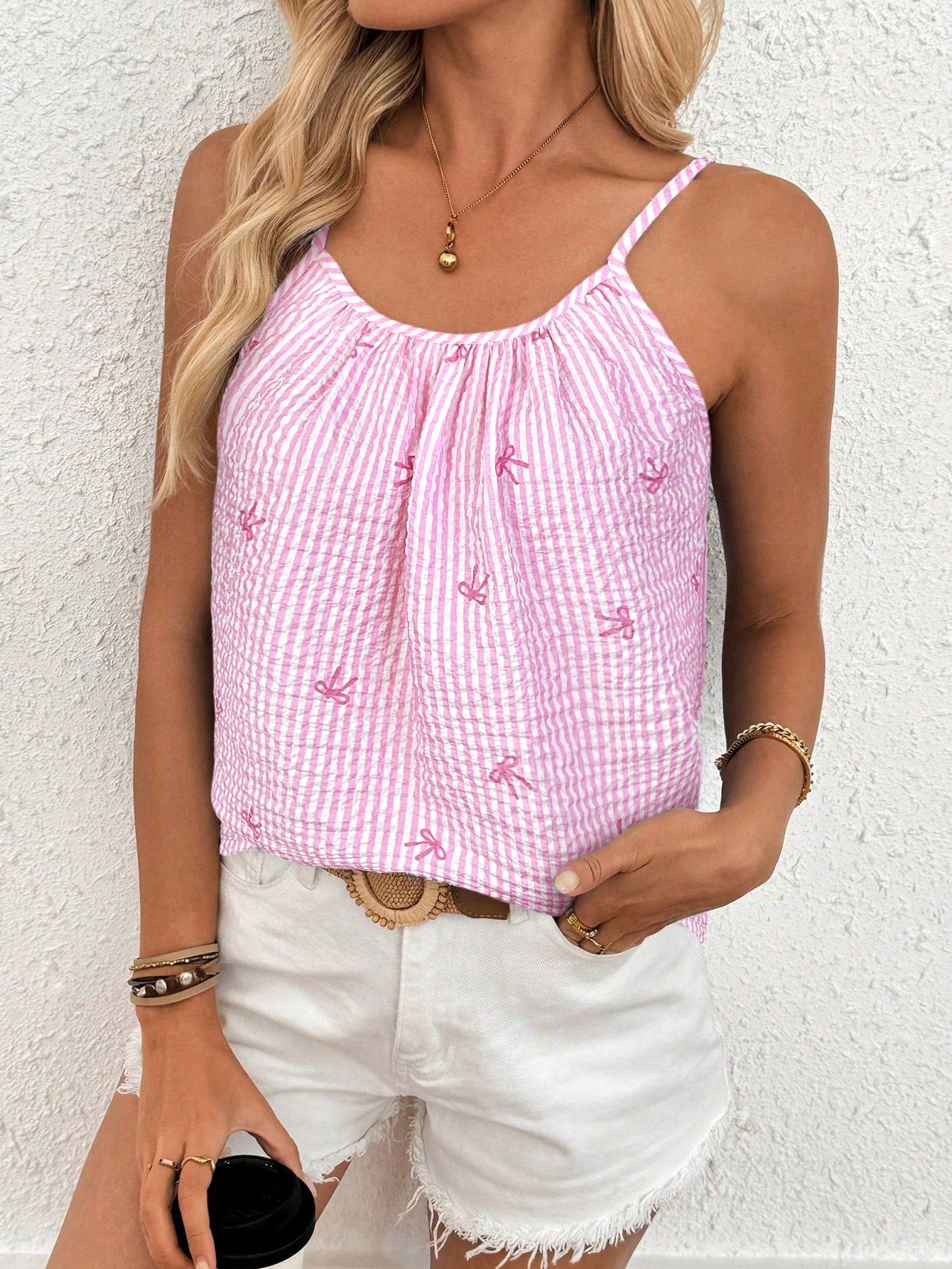 بلوزة كاميسول نسائية من لون، مخططة ومزينة بفيونكة، مناسبة للإطلالات الكاجوال.