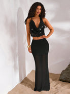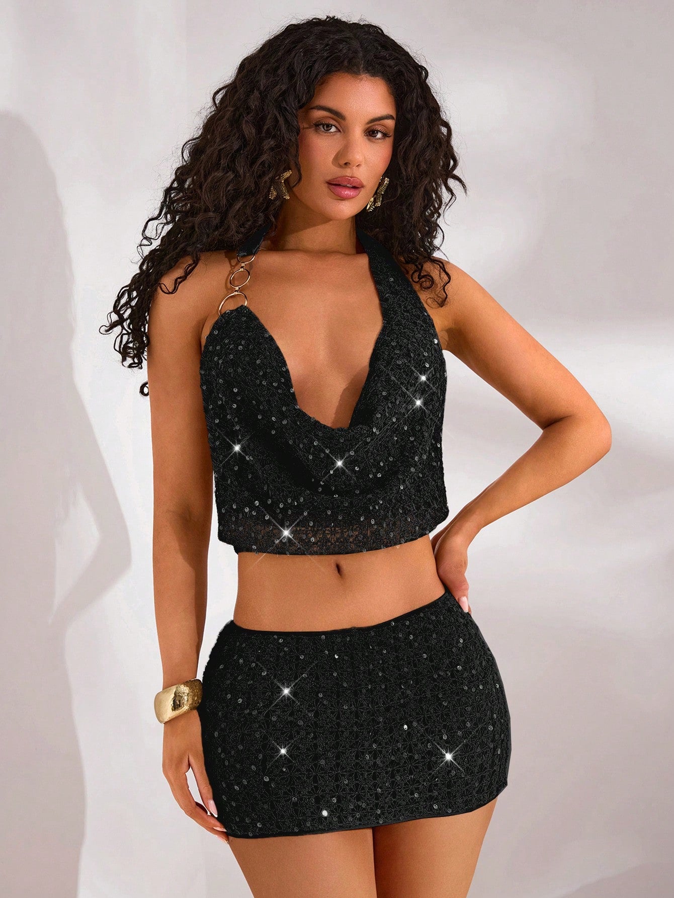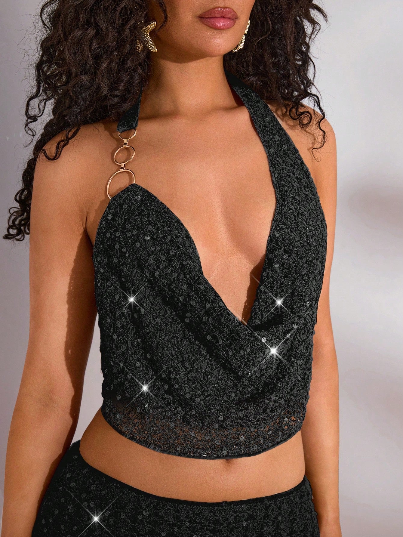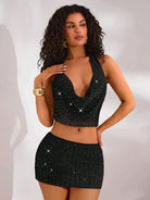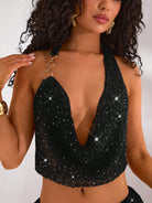 Opulessa Sexy Draped Neck Rhinestone Embellished Blouse, Suitable For Going Out, Date Night, Vacation,