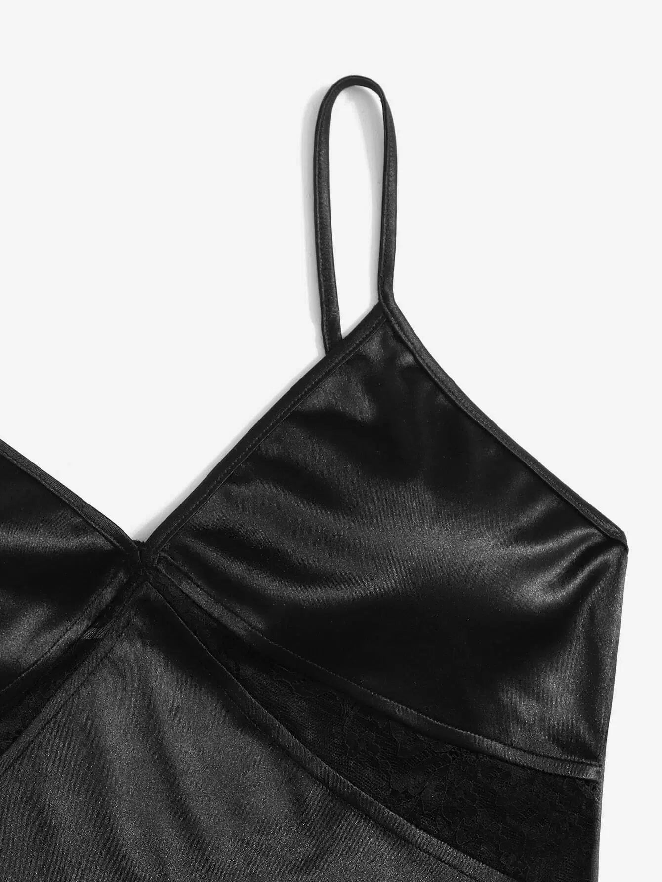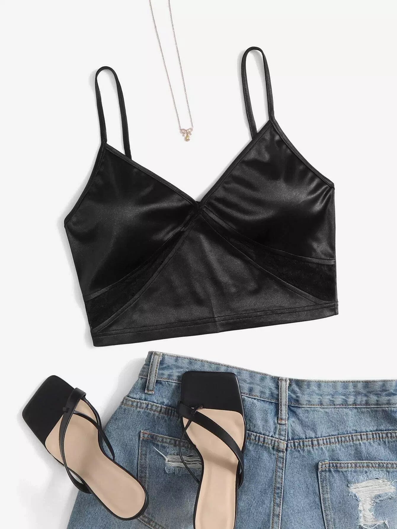 بلوزة قصيرة قصيرة من الدانتيل الساتان بلون مغاير سادة