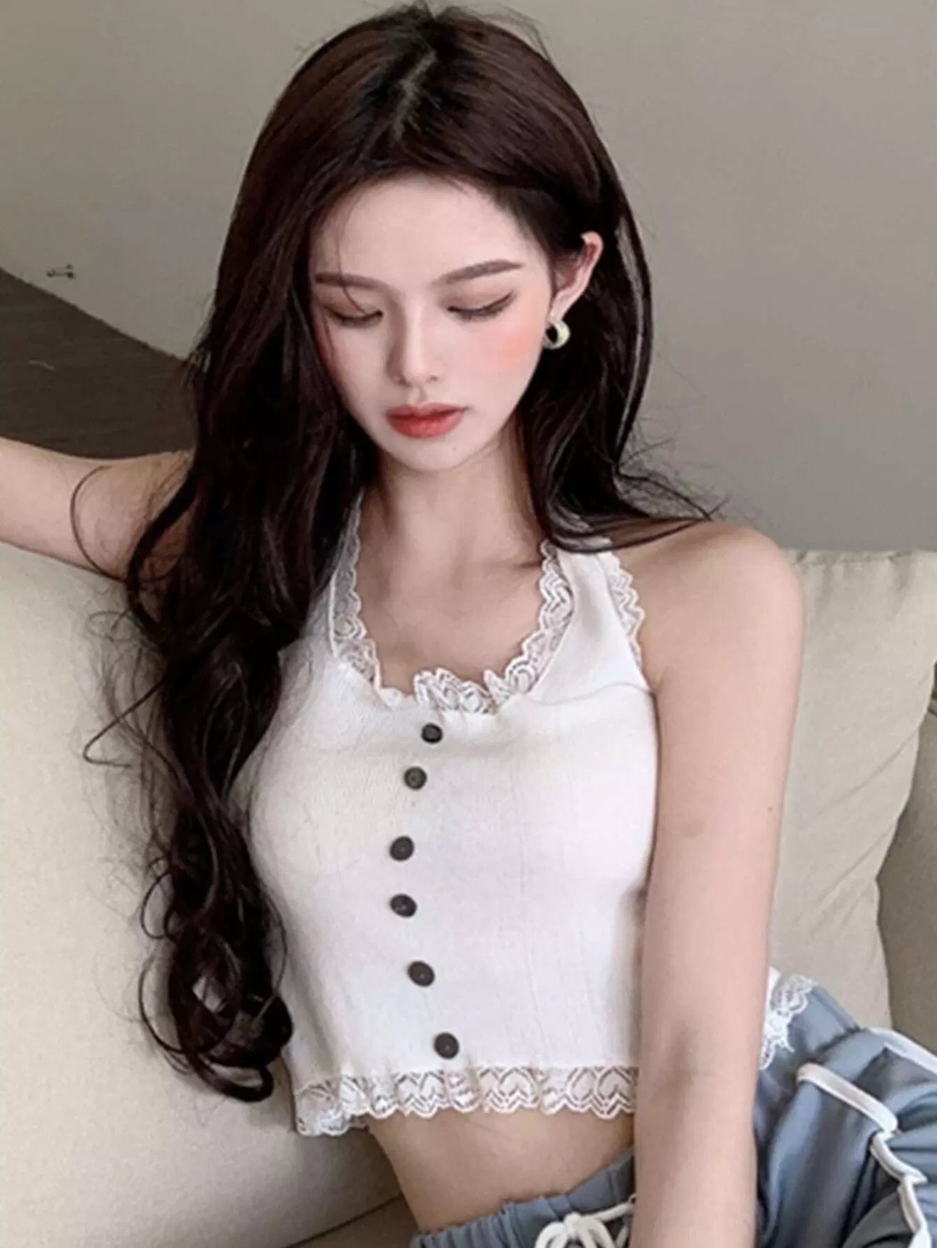 بلوزة قصيرة بدون أكمام مع حافة من الدانتيل